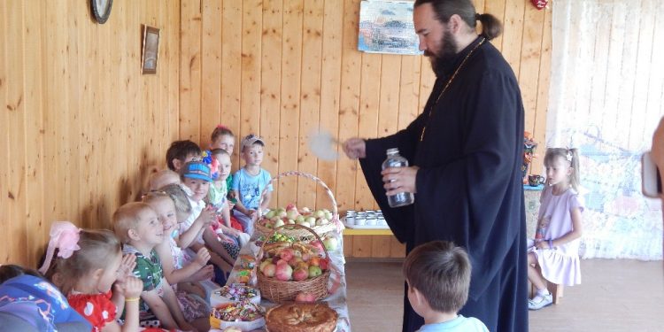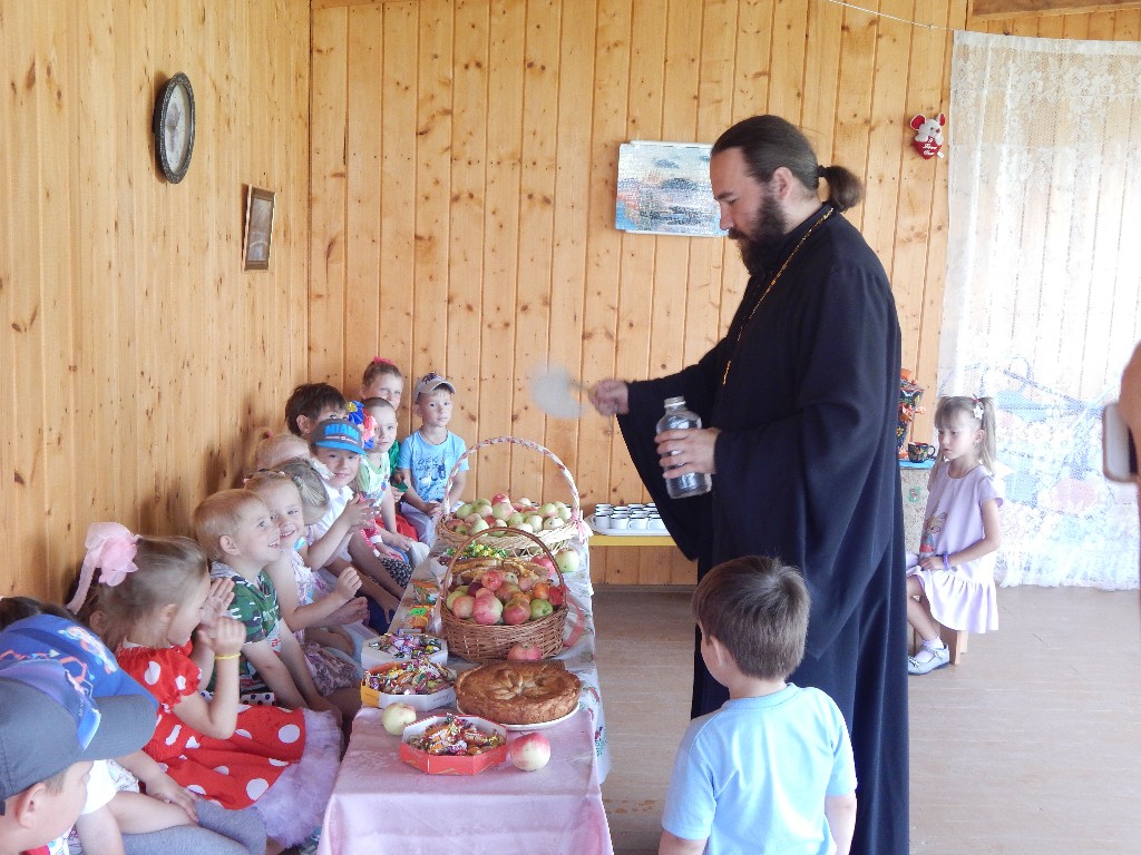 После выступления детей батюшка поздравил их с праздником и освятил угощение и яблоки, приготовленное родителями детей.