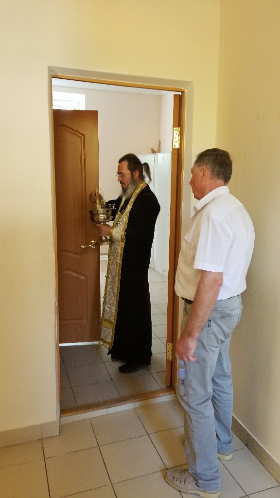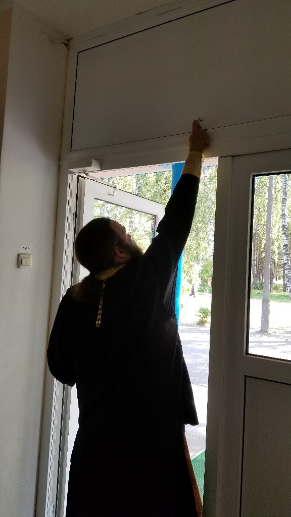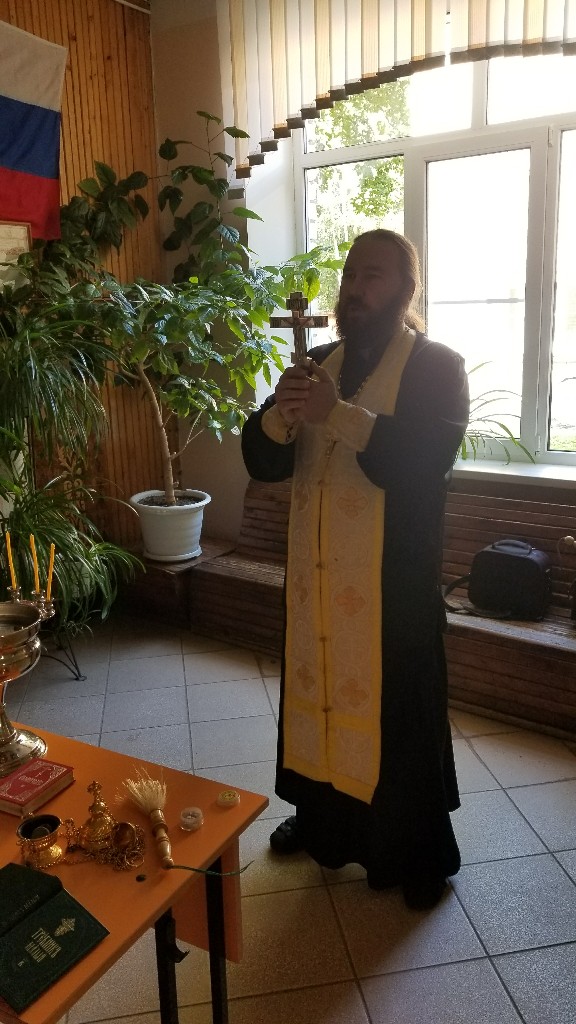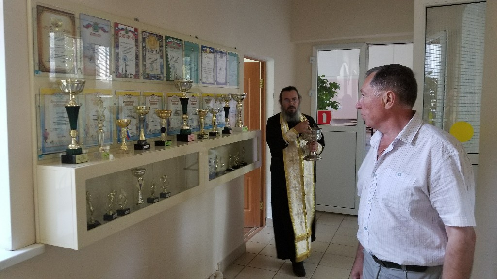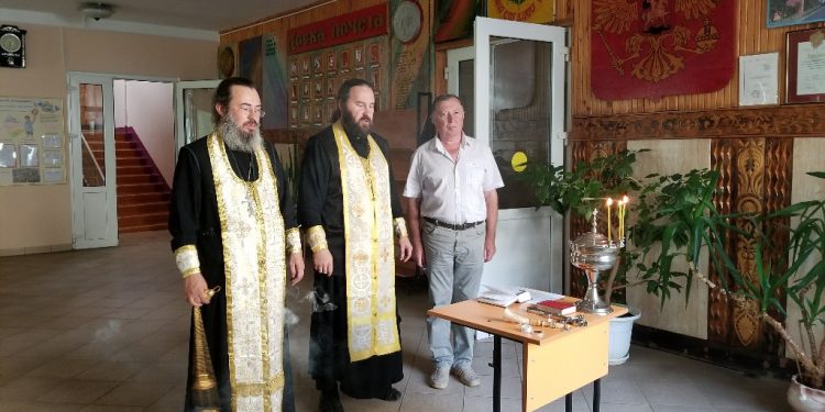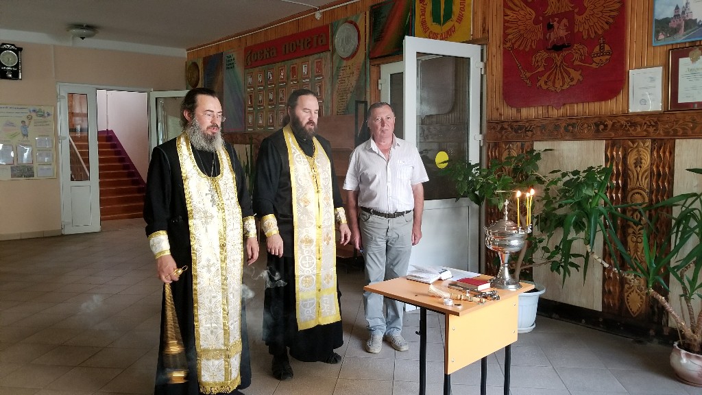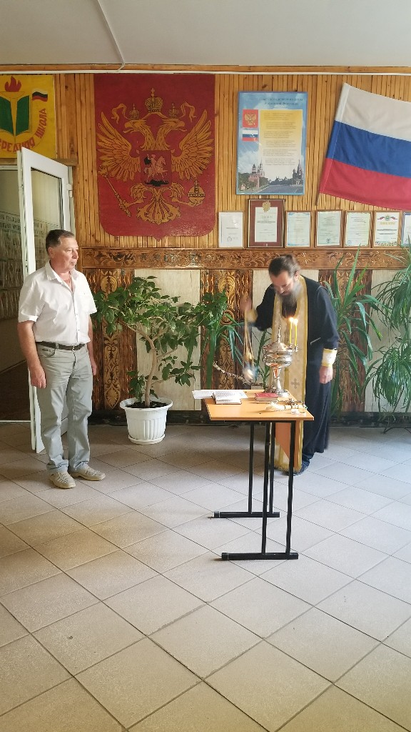 К началу нового учебного года протоиерей Максим прочитал молитву «на учение отроков», а иерей Стахий окропил всю школу святой водой.