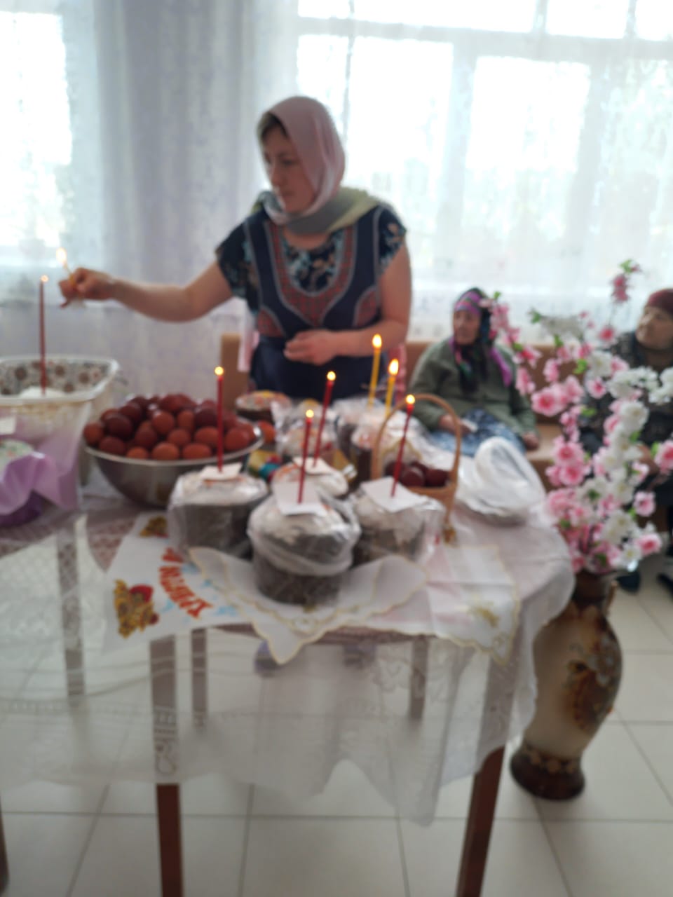 15 апреля в Великую Субботу настоятель храма в честь Калужской иконы Божией Матери в поселке Еленский Хвастовичского района Козельской епархии иерей Павел Мещеряков посетил дом инвалидов и ветеранов «Милосердие», где совершил освящение яиц и куличей, а затем поздравил всех присутствовавших с предстоящим праздником Пасхи.