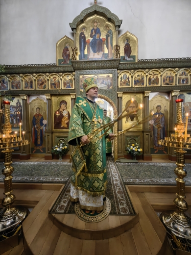 9 июня епископ Макарий совершил в Свято-Духовском храме Божественную Литургию в сослужении многочисленного духовенства храма и г. Козельска.