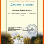 Ученик 3 класса ЧОУ «Православная гимназия в г.Козельске» Федор Яценко стал победителем. Для учащихся 3-6 классов эта олимпиада проводится в рамках изучаемого предмета «Основы религиозных культур и светской этики». В этом году темой олимпиады стала «Моя страна – Россия. Паломничество». Региональный тур проходил в Калуге 3 февраля, традиционно в Калужской православной гимназии. Из всей области участвовало 23 человека, среди которых 13 было из Козельского района.