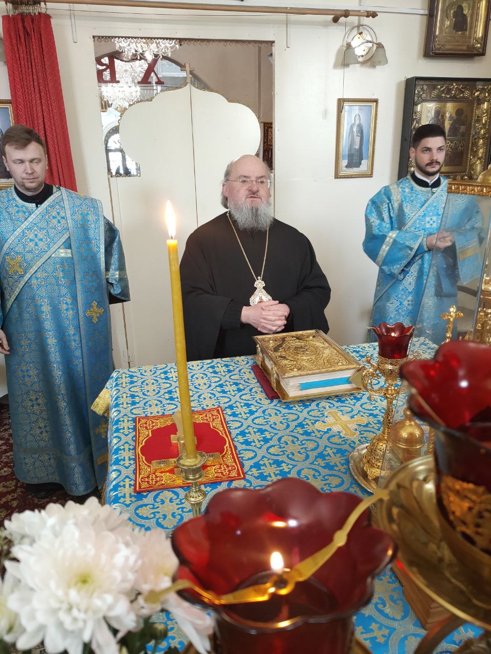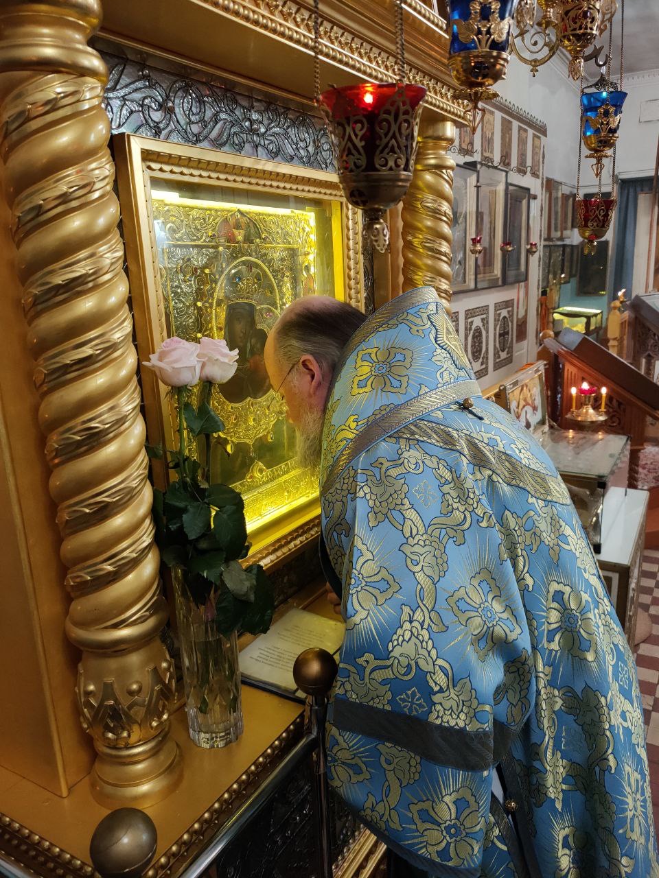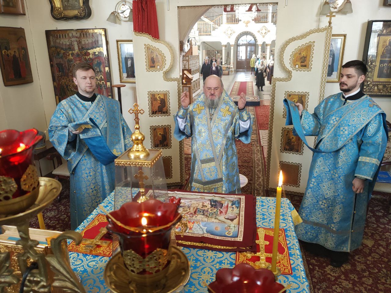 После отпуста Литургии священнослужители совершили славление пред чтимым чудотворным образом Божией Матери «Избавление от бед страждущих», а затем архипастырь обратился к богомольцам с проповедью.