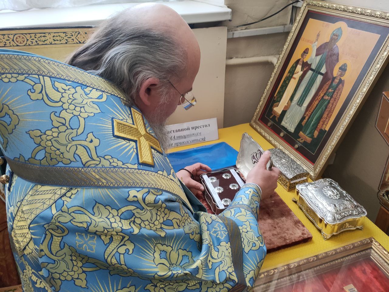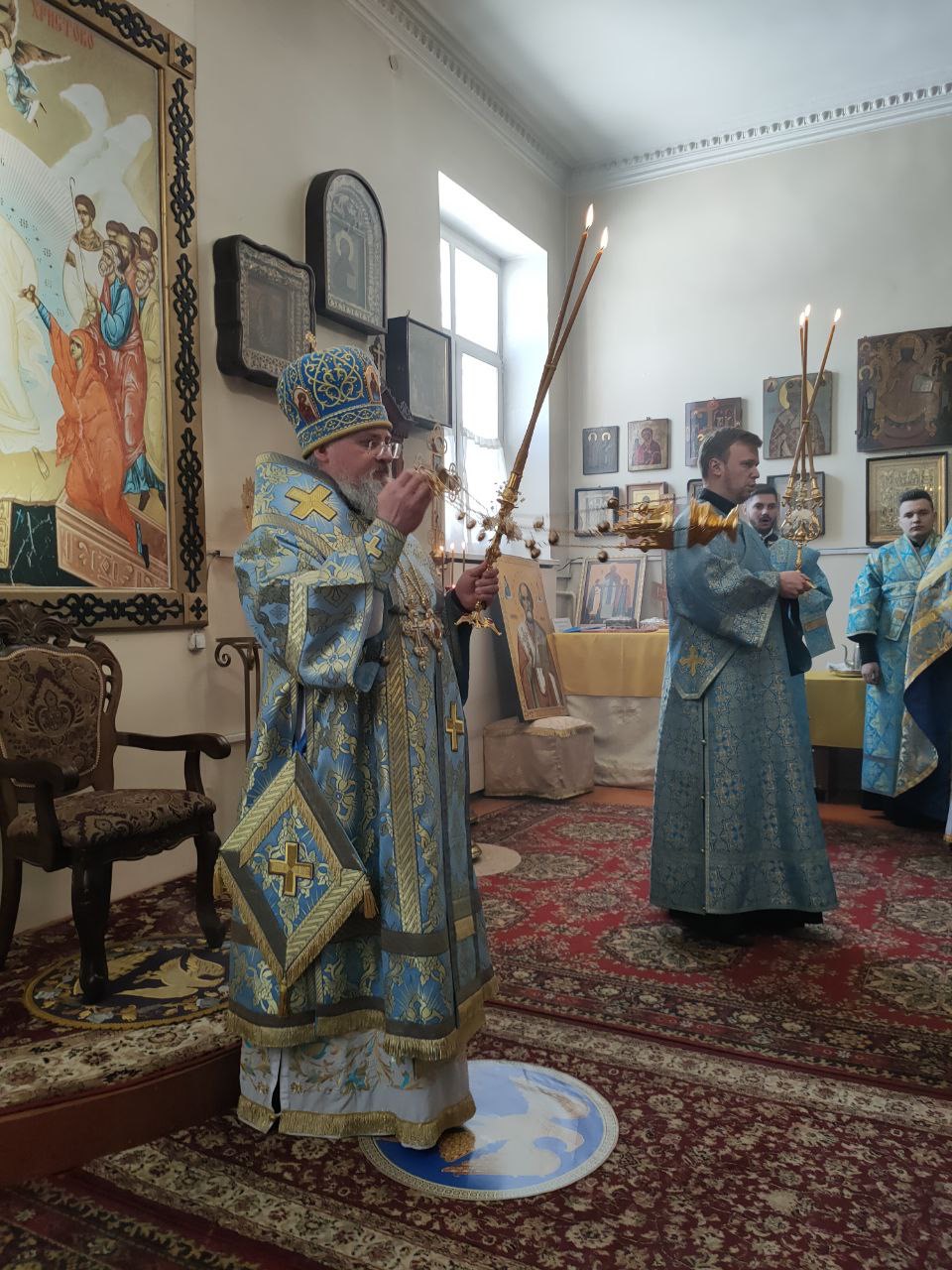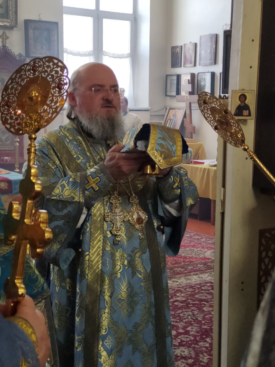 После отпуста Литургии священнослужители совершили славление пред чтимым чудотворным образом Божией Матери «Избавление от бед страждущих», а затем архипастырь обратился к богомольцам с проповедью.