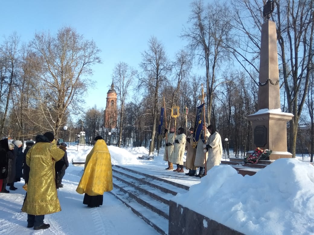 По окончании заупокойной молитвы, настоятель Казанского собора – протоиерей Алексий Жиганов, клирик храма – иерей Алексий Сначёв и прихожане возложили гирлянду «от благодарных чад Русской Православной Церкви» и цветы к Поклонному Кресту и у стелы «Людиново — город воинской доблести».