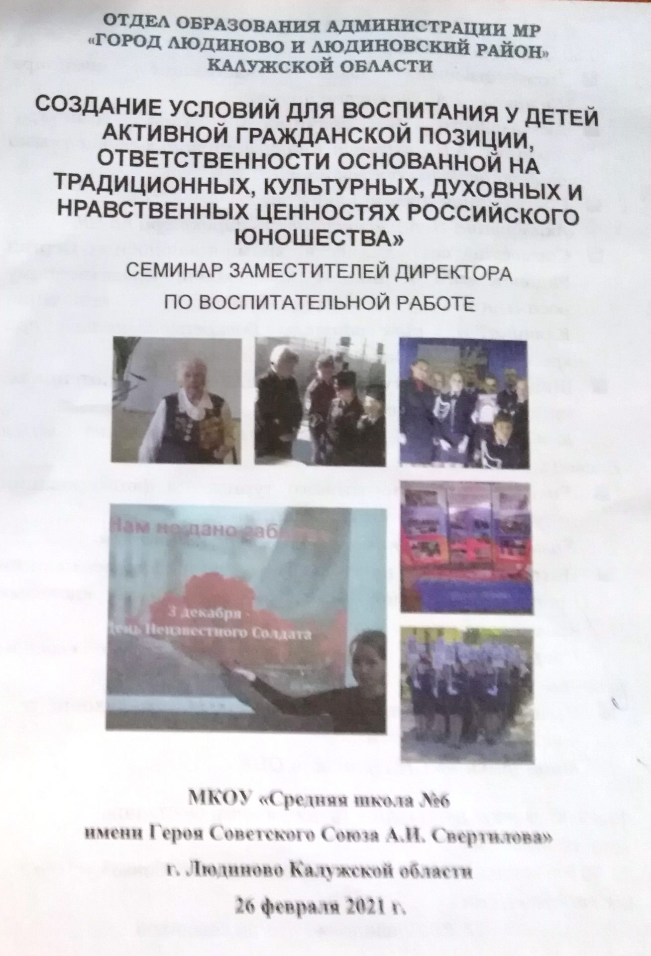 26 февраля в городе Людиново на базе МКОУ «Средняя школа №6 имени Героя Советского Союза А. И. Свертилова» прошел семинар заместителей директоров по воспитательной работе школ города.