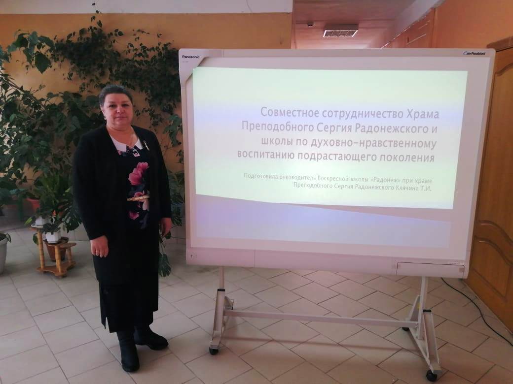 На семинаре по благословению благочинного 6-го округа Козельской епархии настоятеля храма преподобного Сергия Радонежского протоиерея Василия Биляк выступила руководитель Воскресной школы «Радонеж» Клячина Татьяна Ивановна. Тема выступления «Совместное сотрудничество храма преподобного Сергия Радонежского и школы по духовно-нравственному воспитанию подрастающего поколения»