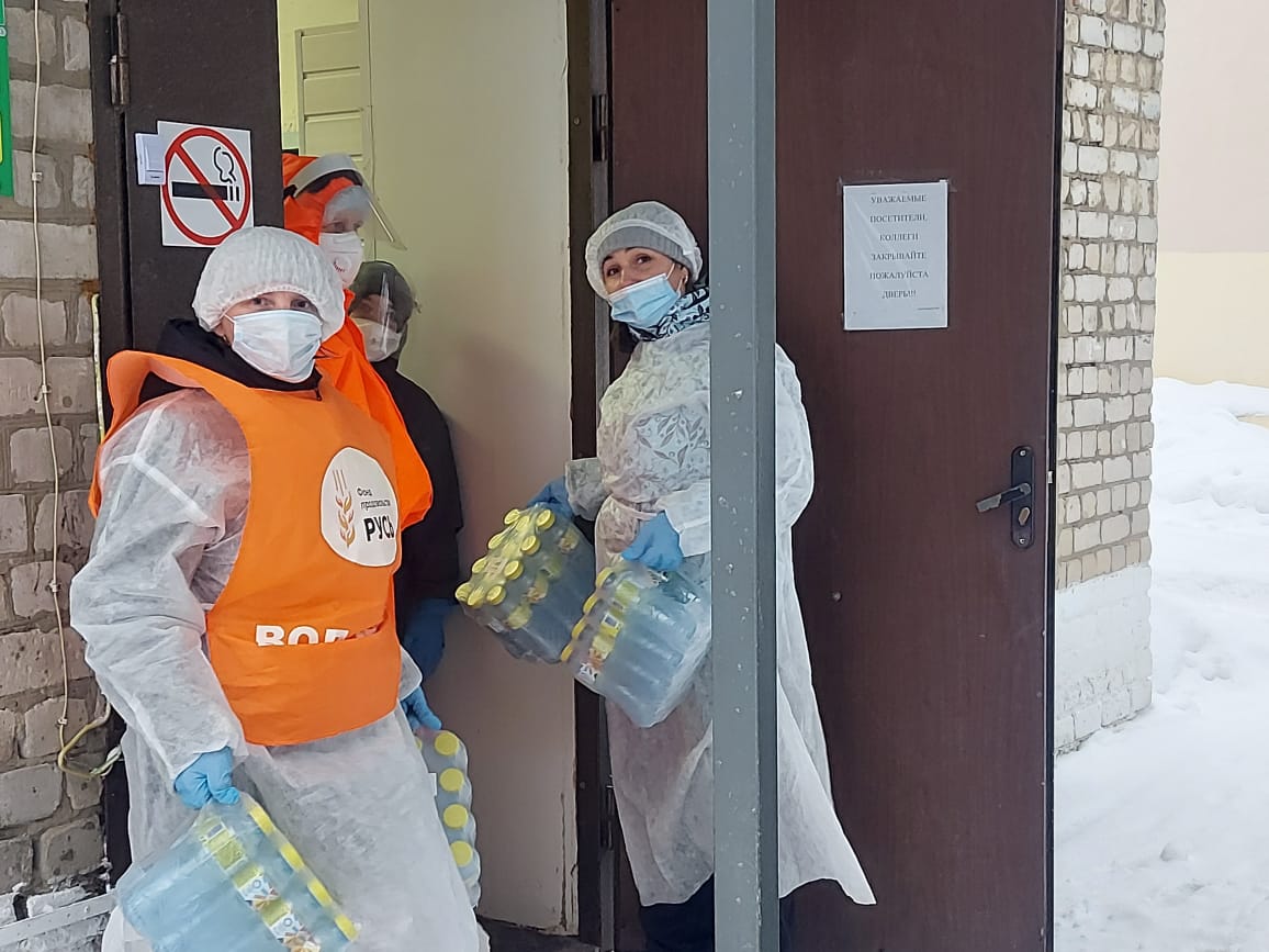 Добровольцы социальной службы Казанского кафедрального собора города Людиново, изрядно устав после раздачи гуманитарной помощи, решили поделиться своим теплом, заботой и добром с нашими друзьями- ковидным отделением Людиновской межрайонной больницы. Автоволонтеры, загрузив в свои машины напитки от Фонда продовольствия « Русь» для сотрудников и пациентов, желали скорейшего выздоровления пациентам, а медработникам — терпения и сил.