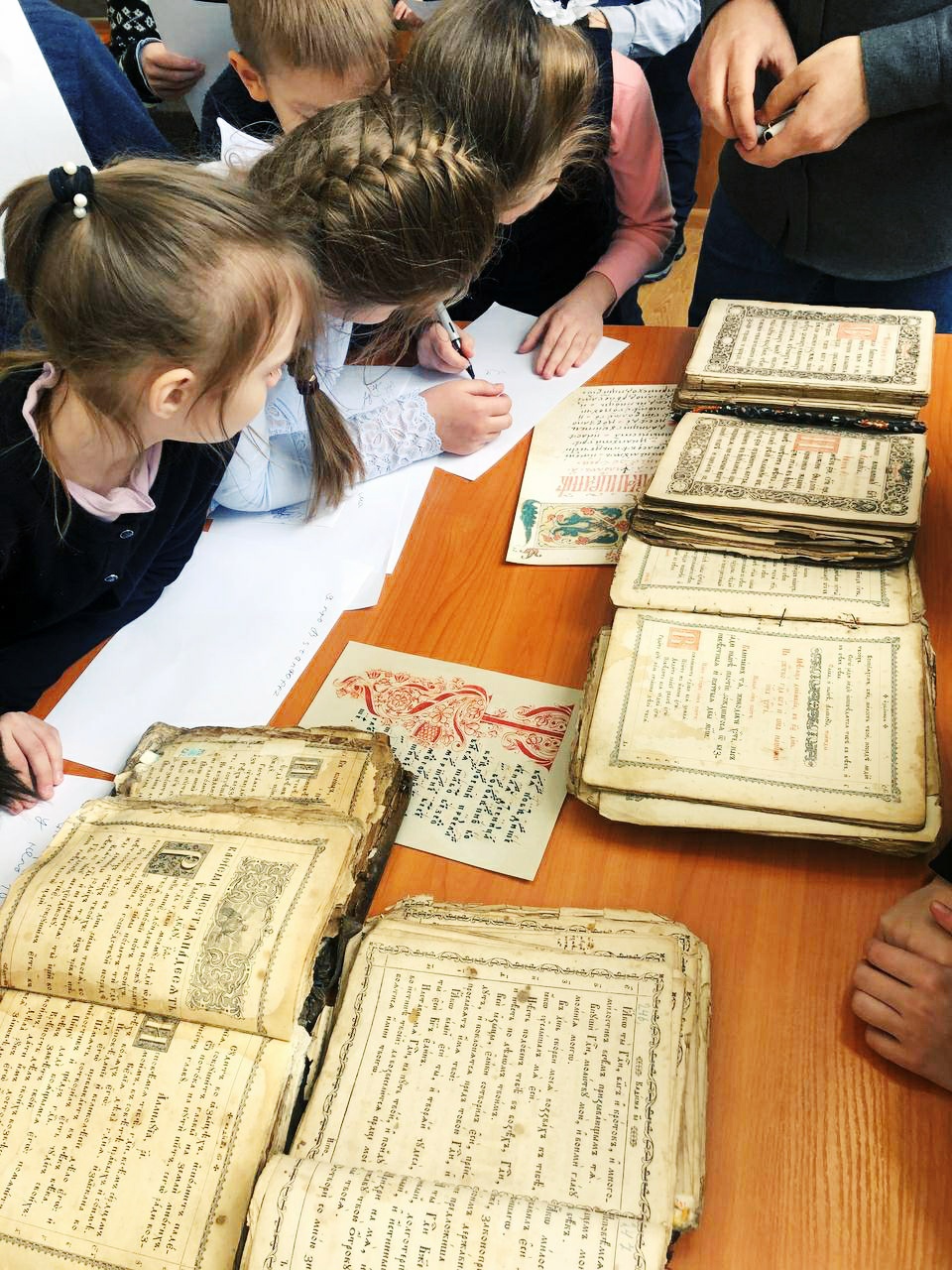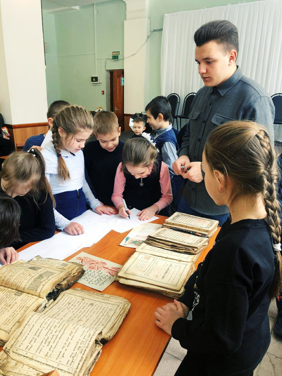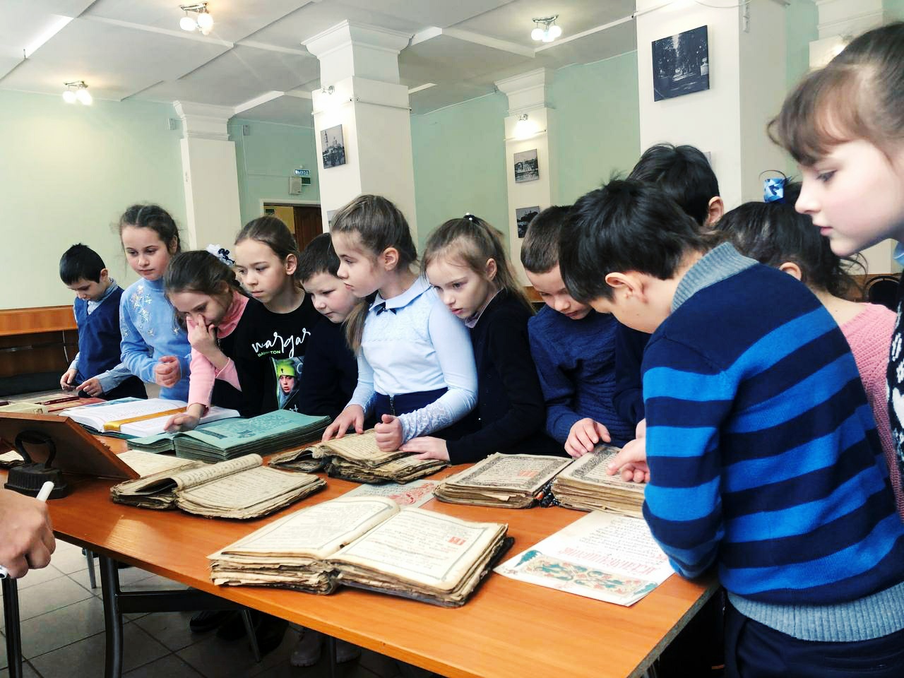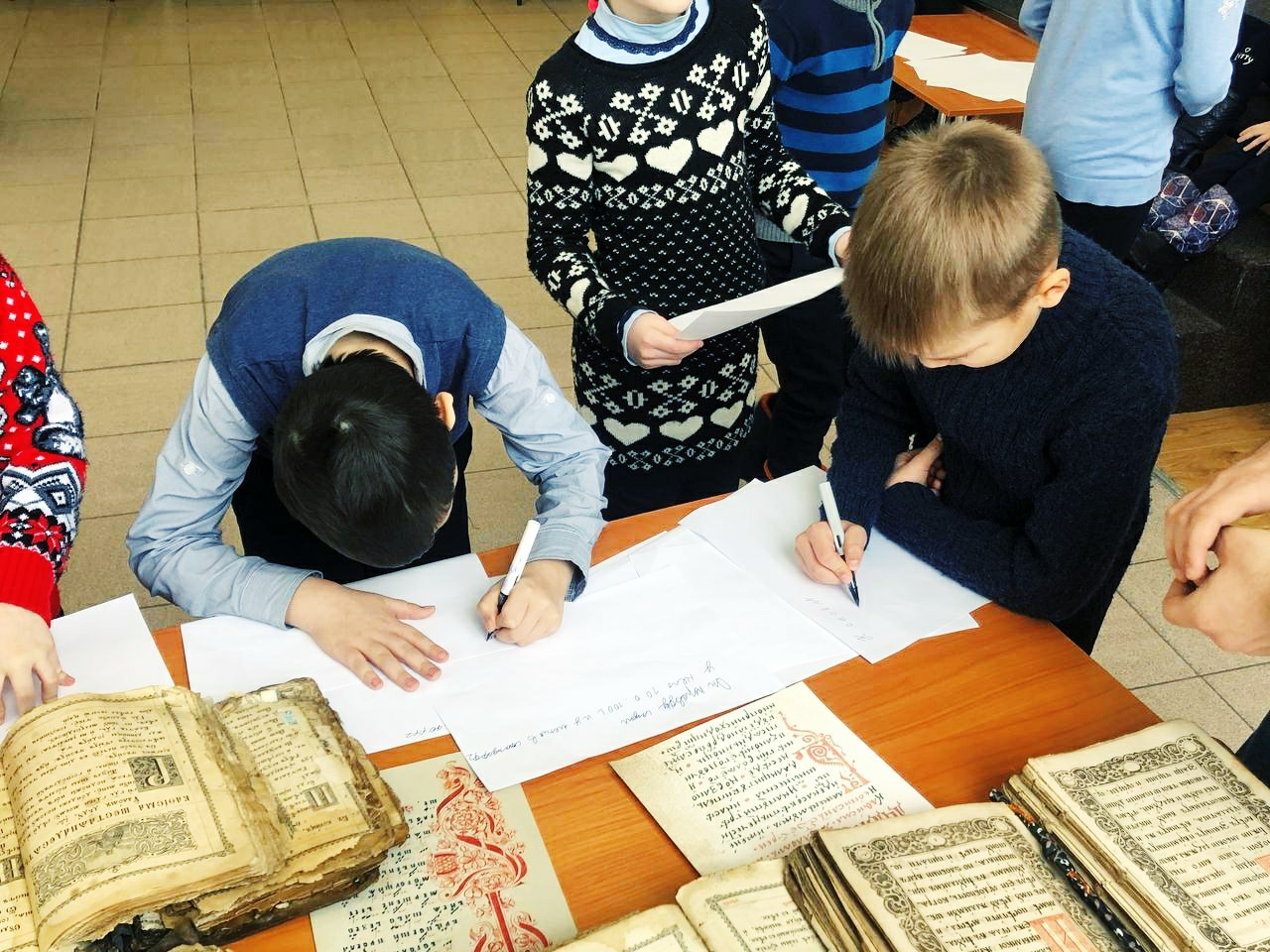 С большим интересом дети рассматривали старинные богослужебные книги: Библию, Апостол, Часослов и Псалтирь. Пробовали читать и старались понять прочитанное. Сами попробовали пописать пером с чернилами. Также дети познакомились с современной духовной литературой. ​