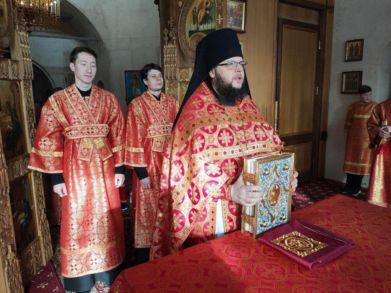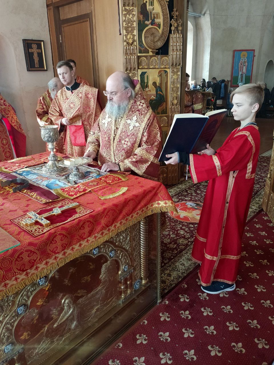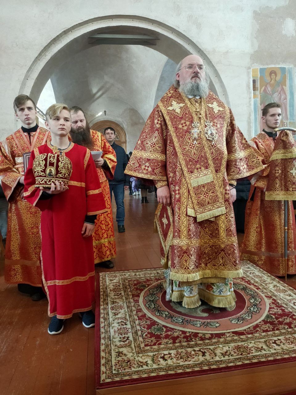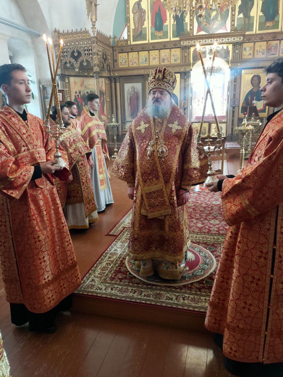 Его Преосвященству сослужили: протоиерей Антоний Хатунцев, иеромонах Паисий (Курмаз) – настоятель собора, иерей Елисей Тимофеев, иерей Филипп Лисенков, диакон Евгений Ковригин, диакон Евгений Васильев и иеродиакон Виталий (Павленко).