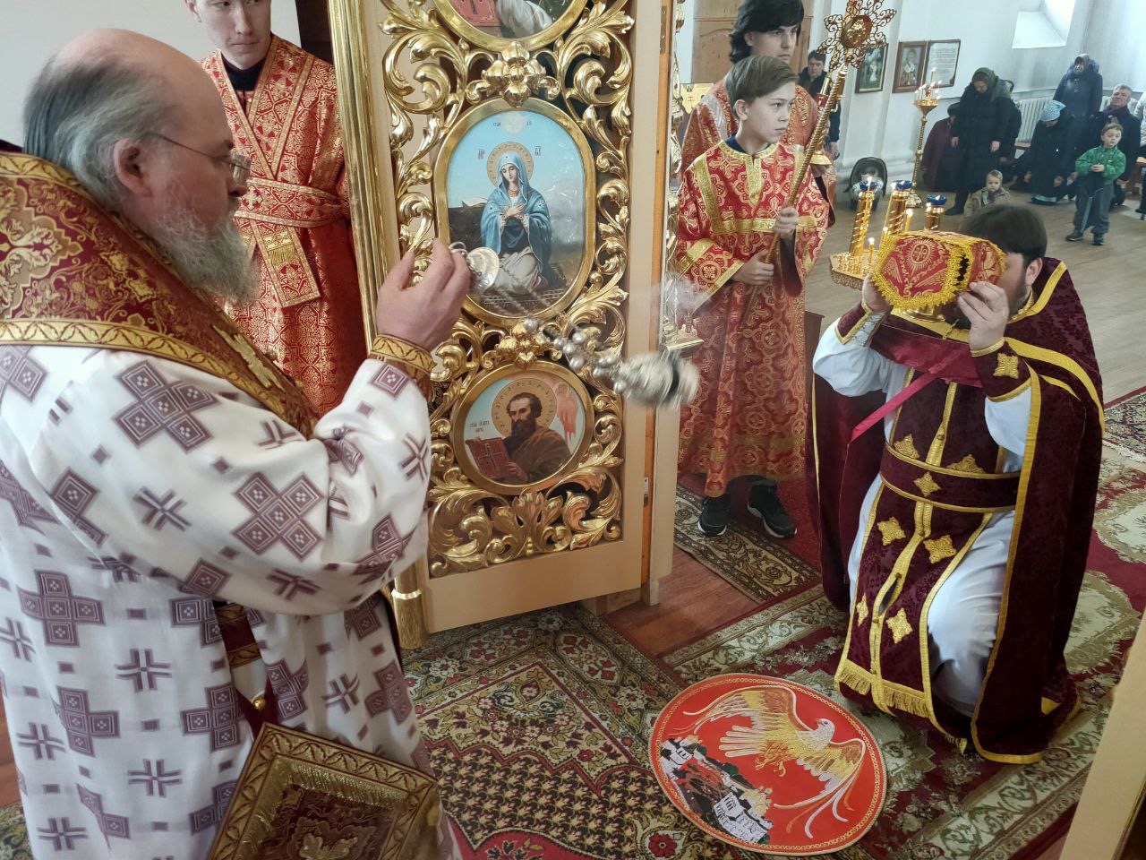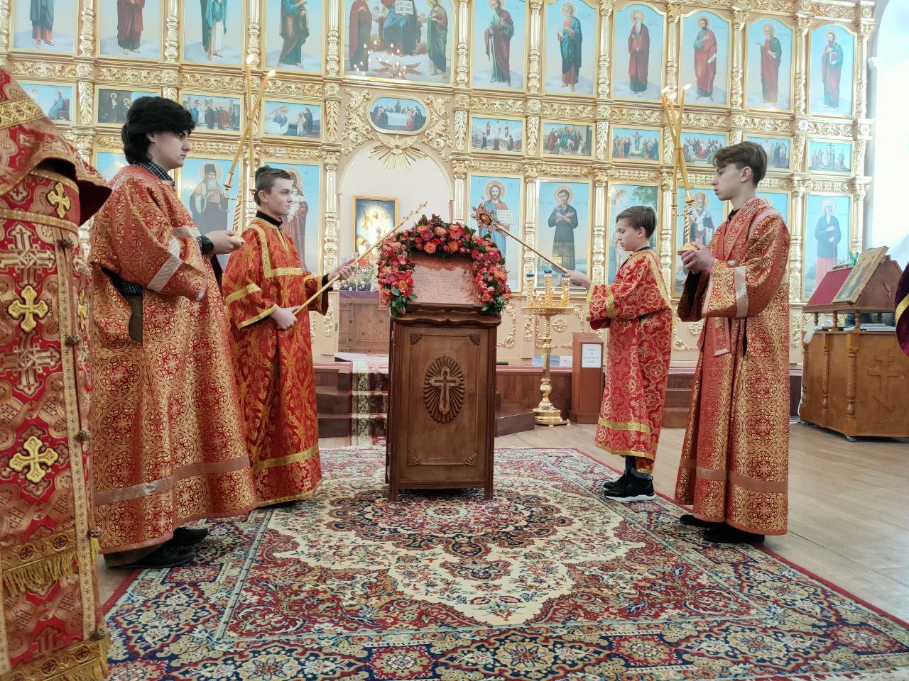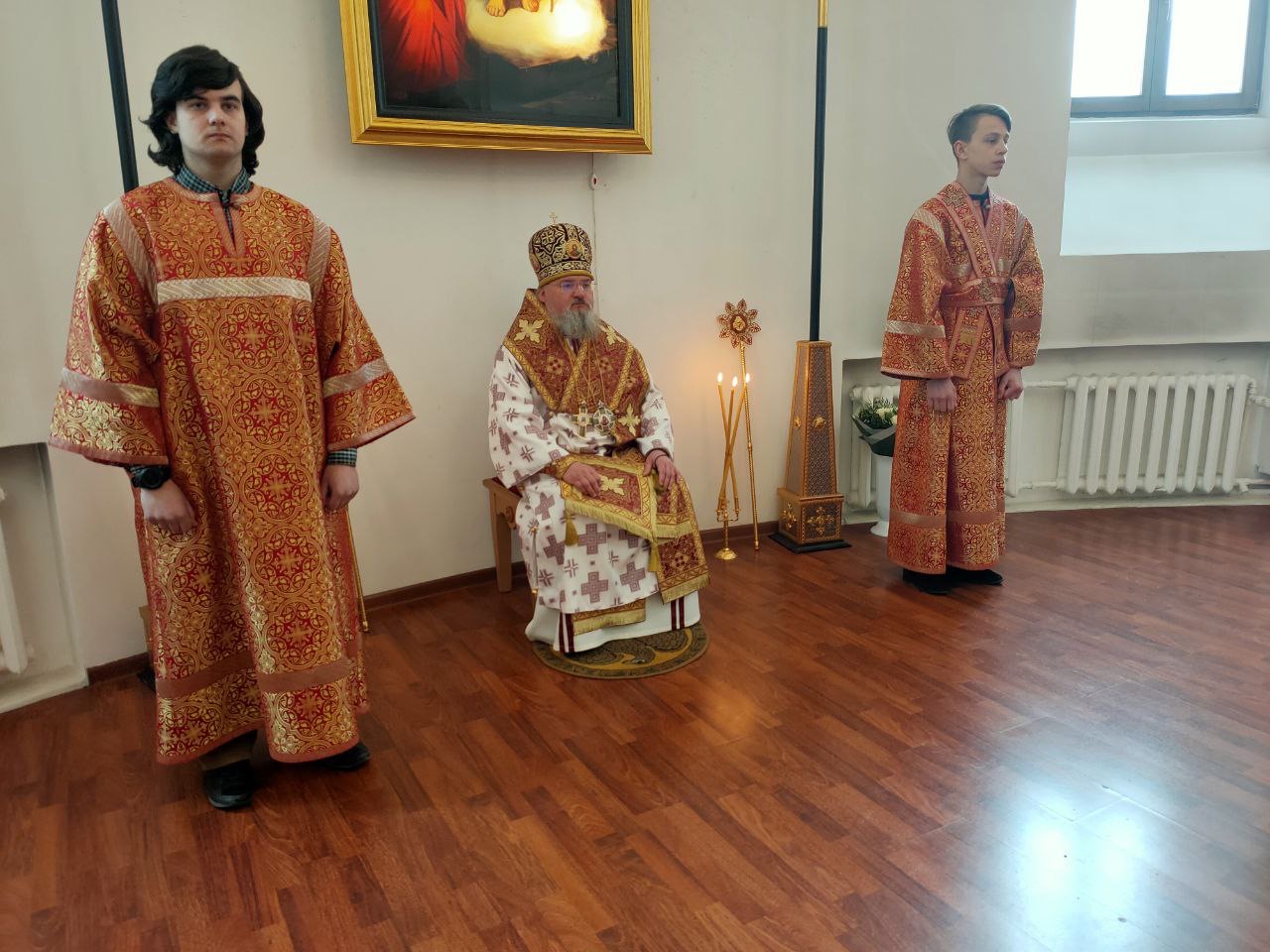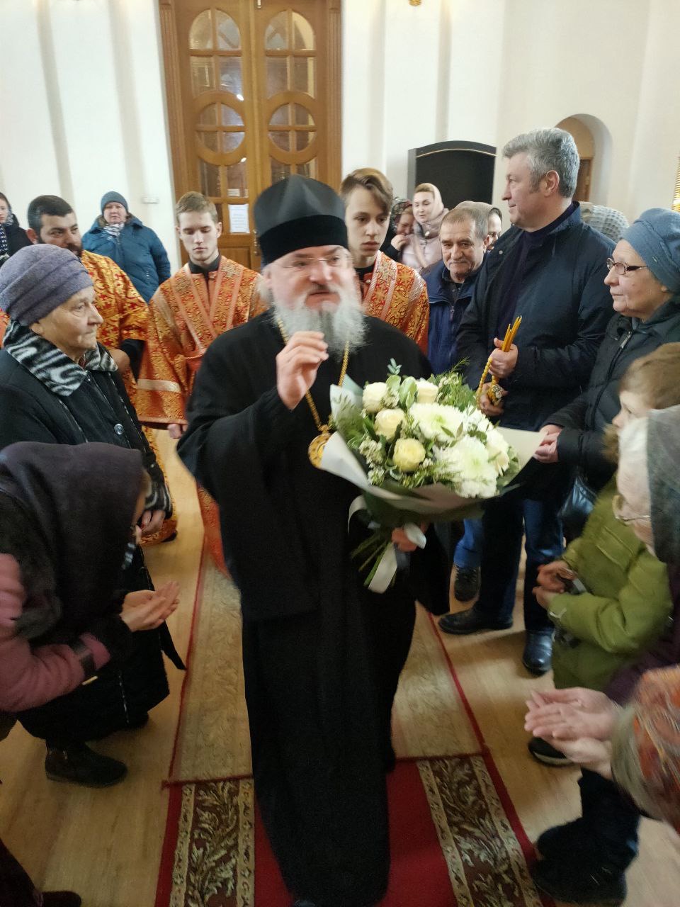 Преосвященному владыке сослужили: протоиерей Антоний Хатунцев, иерей Дионисий Куваев – настоятель храма, иерей Олег Леонов, диакон Евгений Ковригин, иеродиакон Виталий (Павленко) и иеродиакон Лука (Старостин).