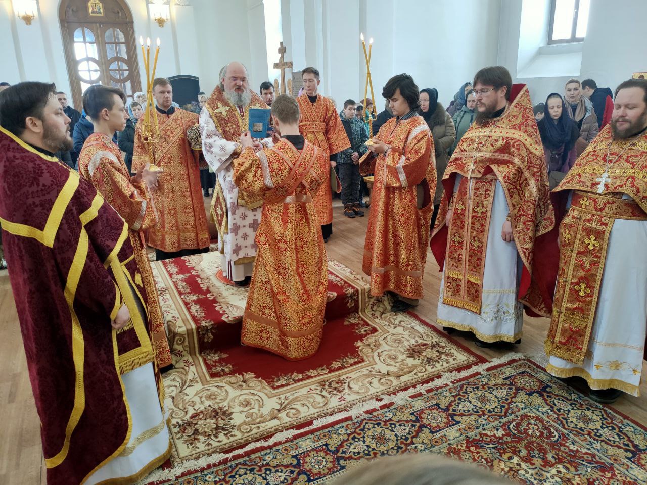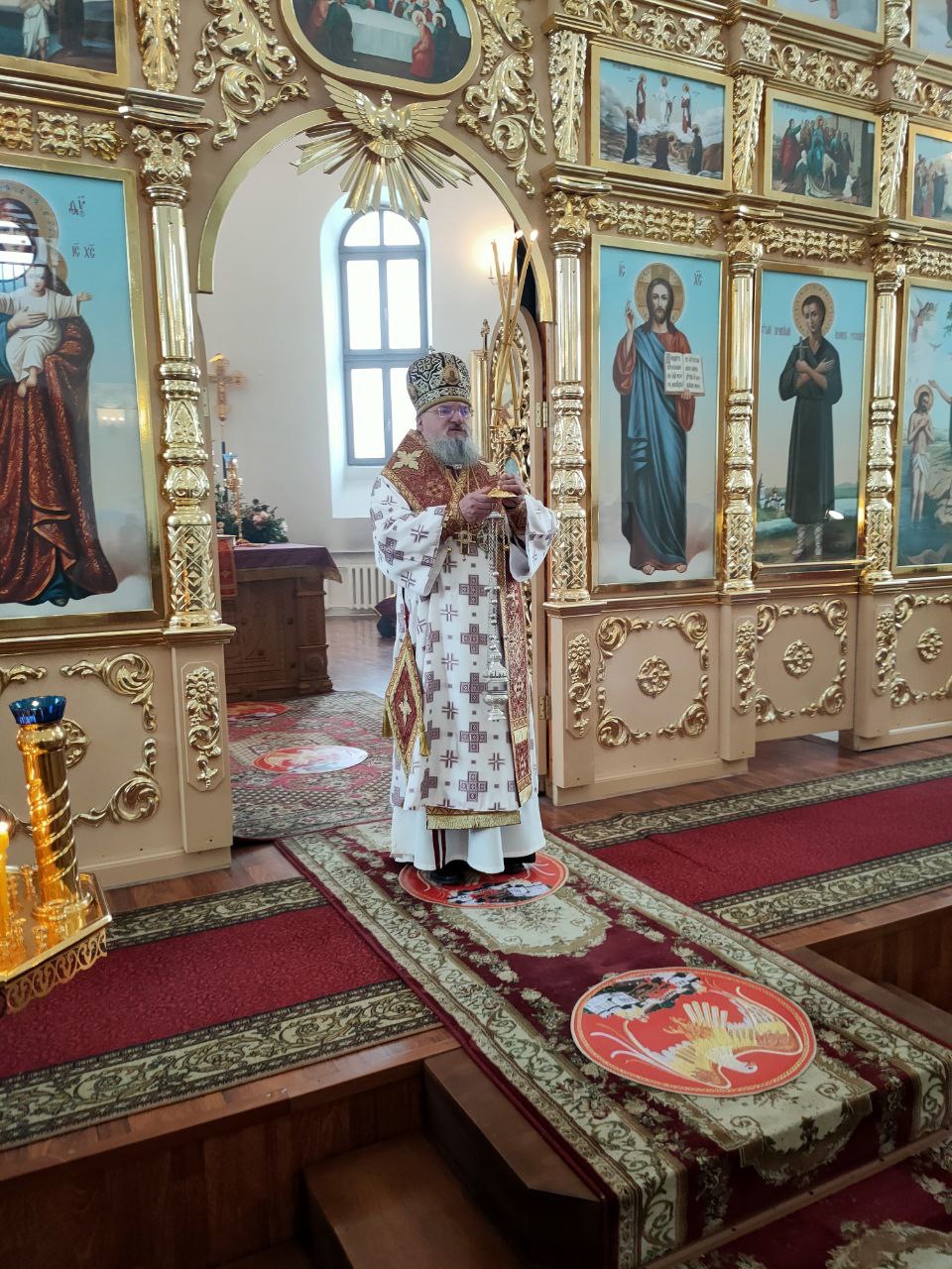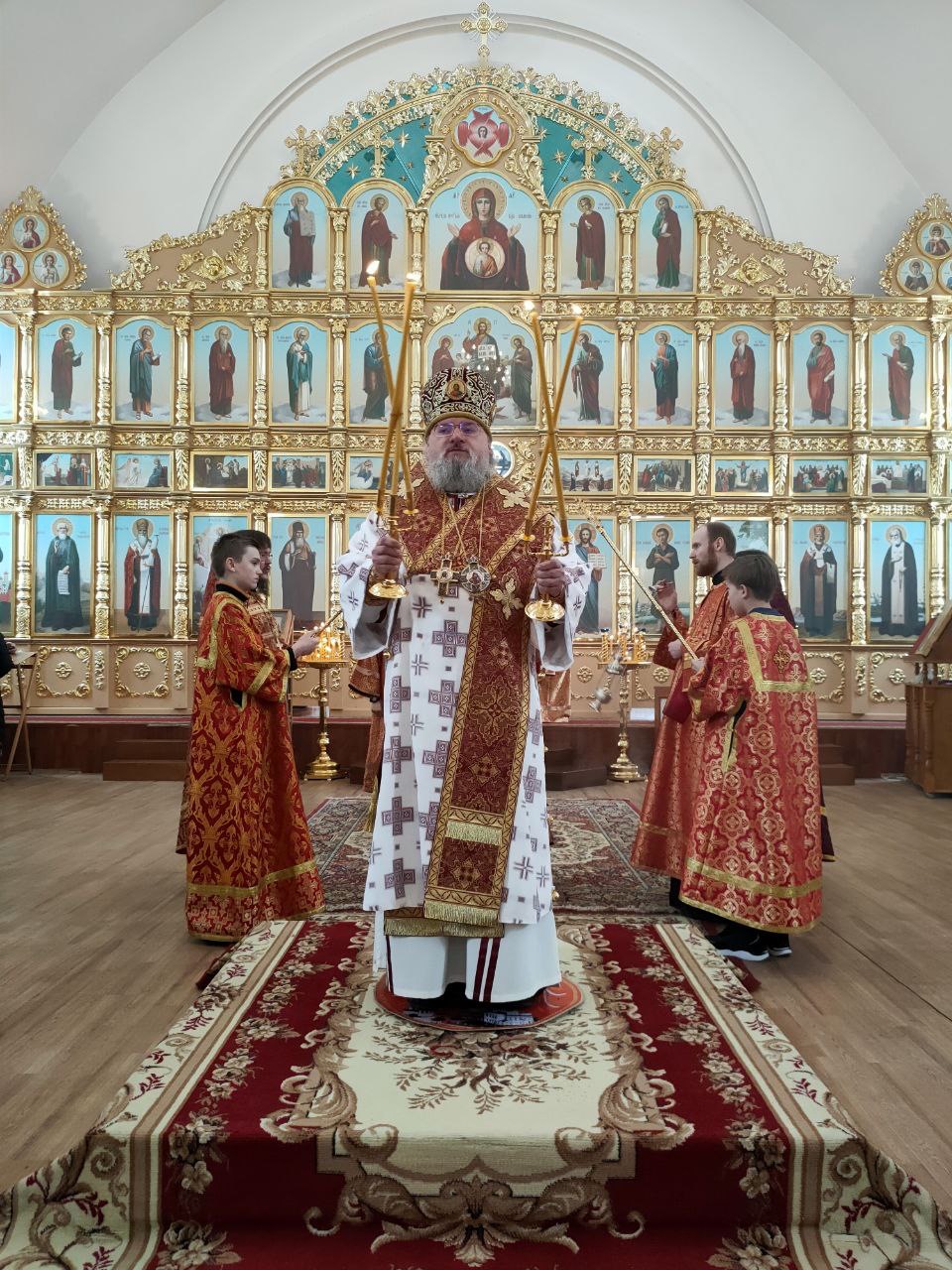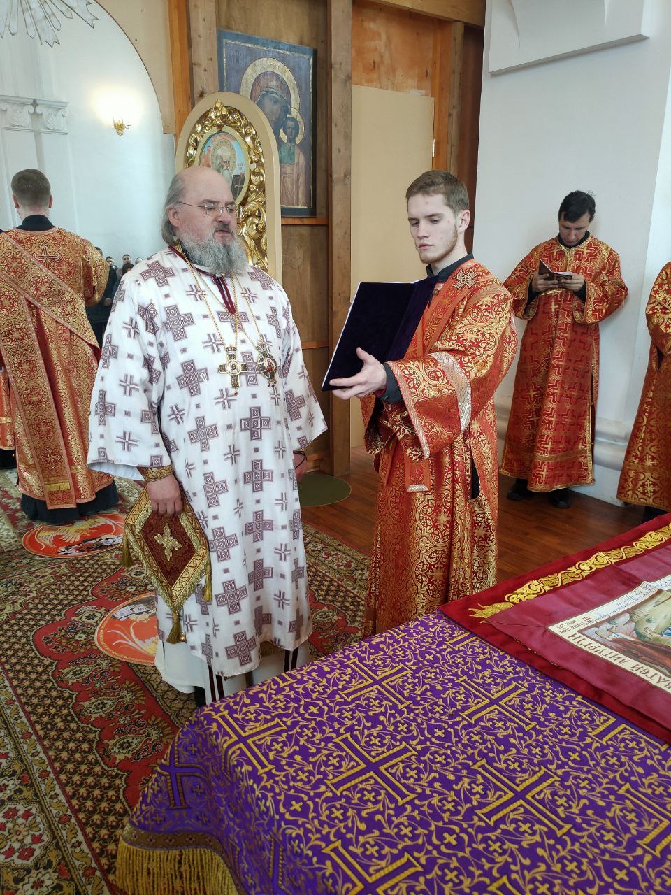 Преосвященному владыке сослужили: протоиерей Антоний Хатунцев, иерей Дионисий Куваев – настоятель храма, иерей Олег Леонов, диакон Евгений Ковригин, иеродиакон Виталий (Павленко) и иеродиакон Лука (Старостин).