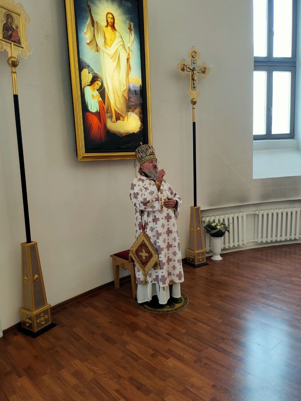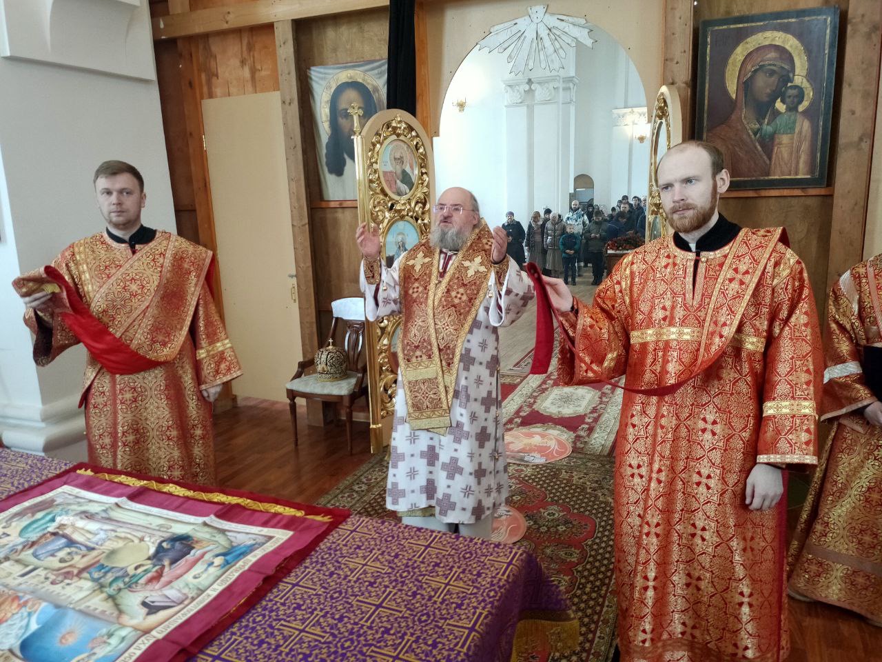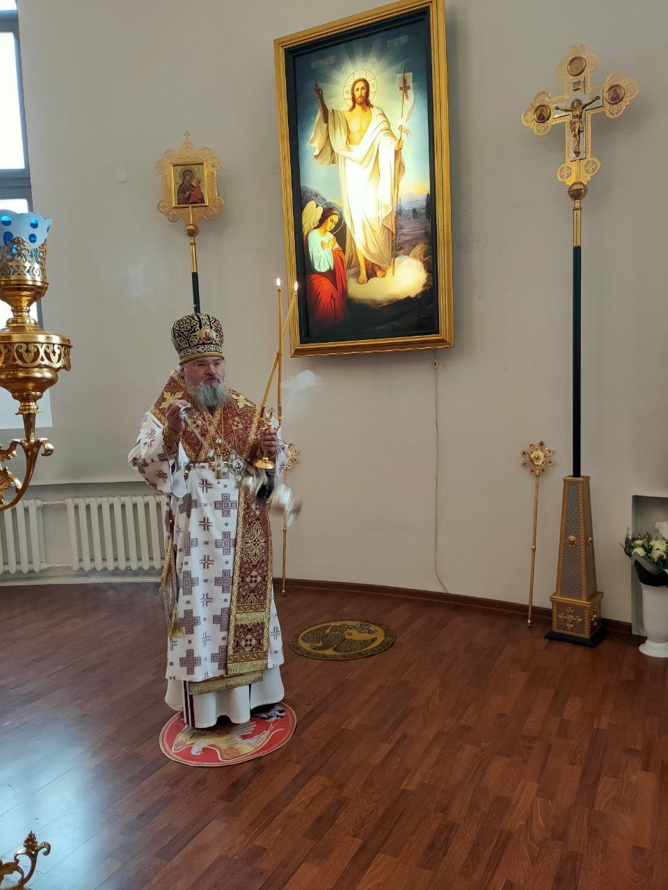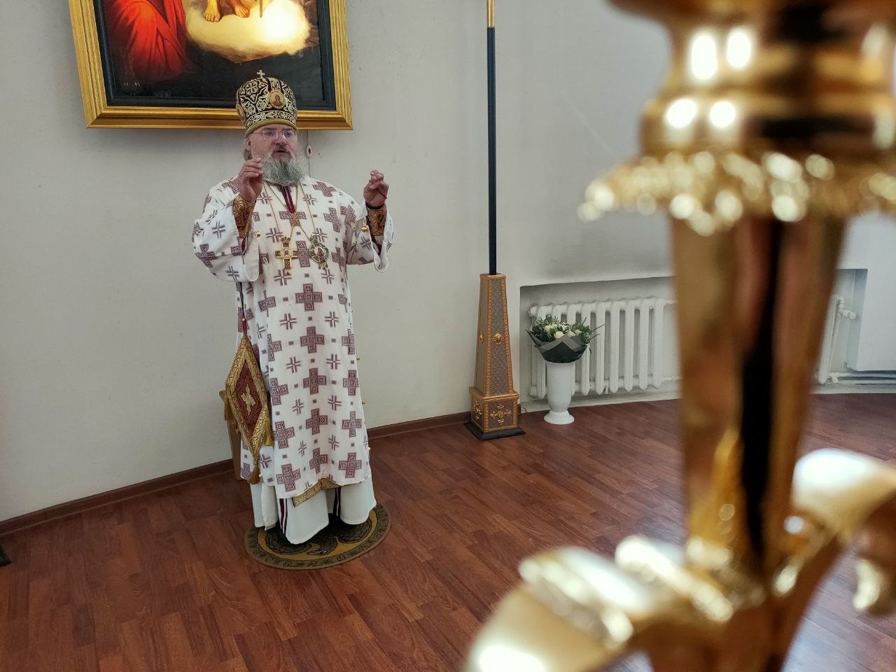 Преосвященному владыке сослужили: протоиерей Антоний Хатунцев, иерей Дионисий Куваев – настоятель храма, иерей Олег Леонов, диакон Евгений Ковригин, иеродиакон Виталий (Павленко) и иеродиакон Лука (Старостин).