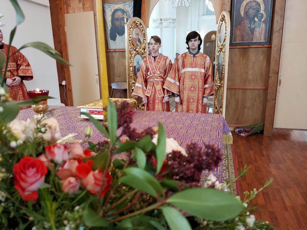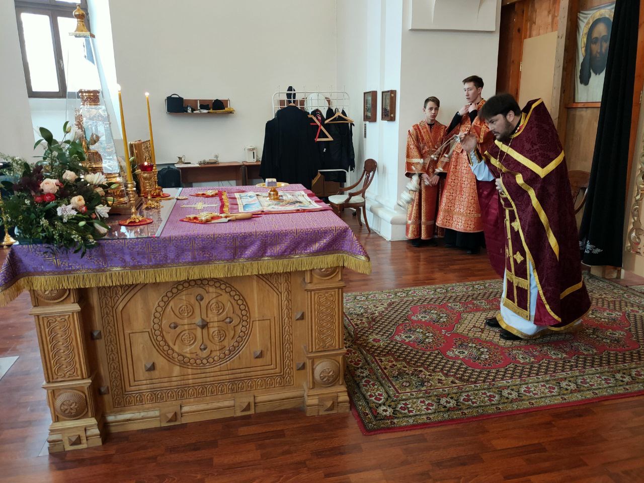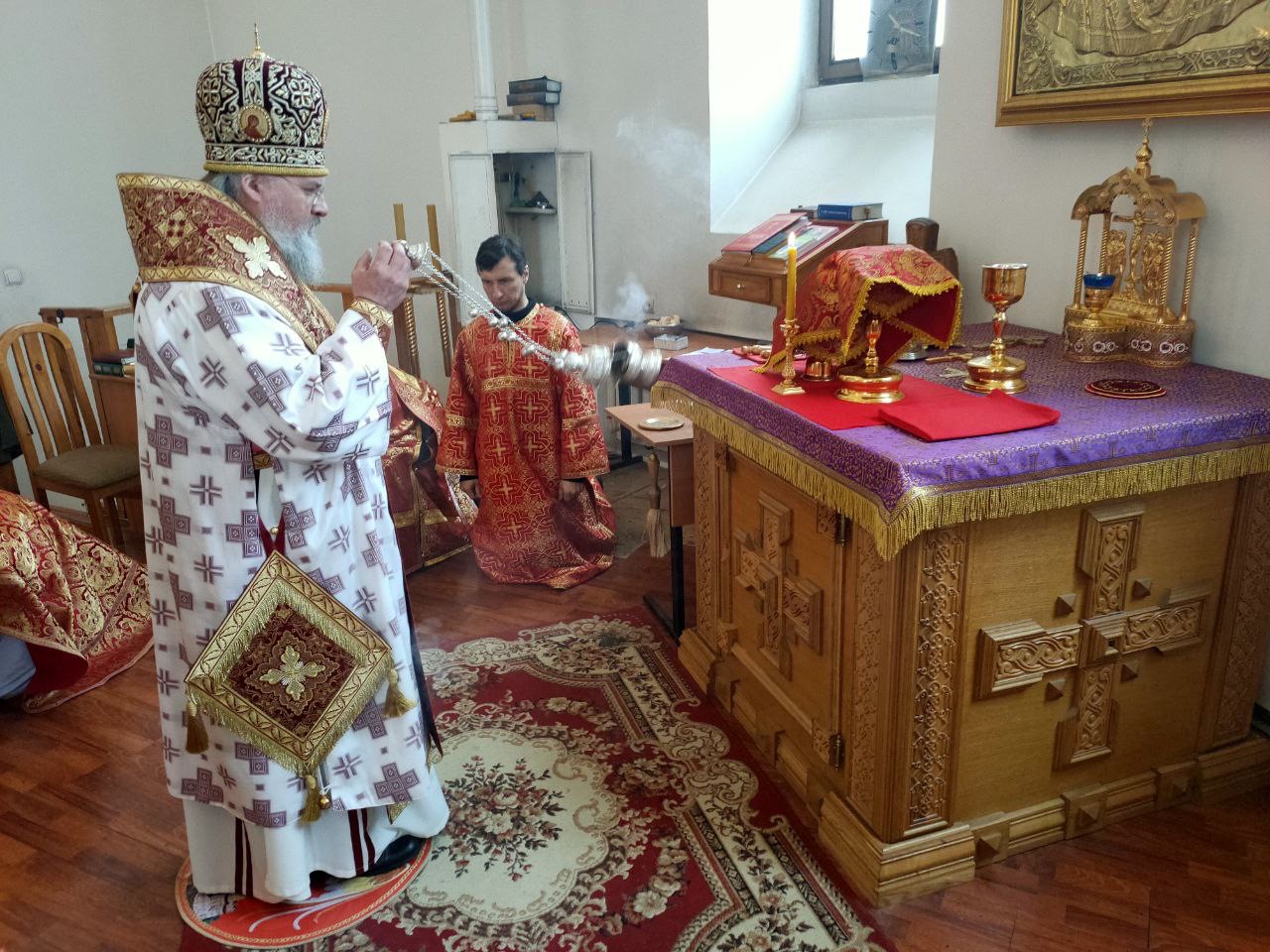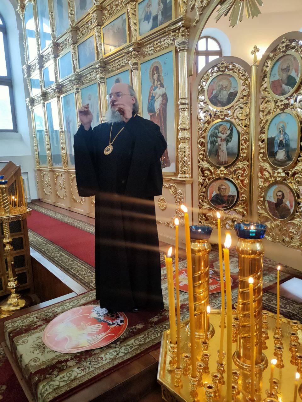 Преосвященному владыке сослужили: протоиерей Антоний Хатунцев, иерей Дионисий Куваев – настоятель храма, иерей Олег Леонов, диакон Евгений Ковригин, иеродиакон Виталий (Павленко) и иеродиакон Лука (Старостин).