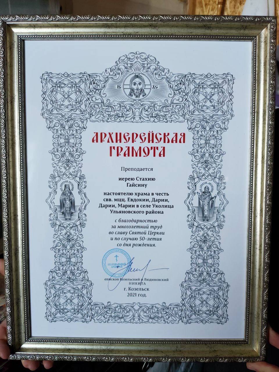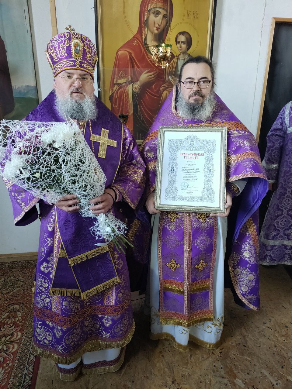 Архипастырь поздравил иерея Стахия Гайсина с пятидесятилетием со дня рождения и вручил ему благодарственную Архиерейскую грамоту.