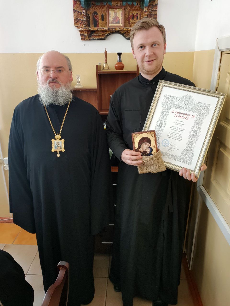 По окончании богослужения владыка приветствовал старшего диакона Козельской епархии Евгений Ковригина с десятилетием хиротонии и вручил ему благодарственную Архиерейскую грамоту и памятный подарок.