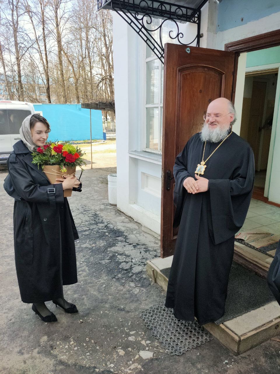 Архипастырь также поздравил с днем рождения супругу настоятеля Никольского храма в селе Бояновичи Хвастовичского благочиния иерея Андрея Ахмедова матушку Елену и преподнес ей букет цветов.
