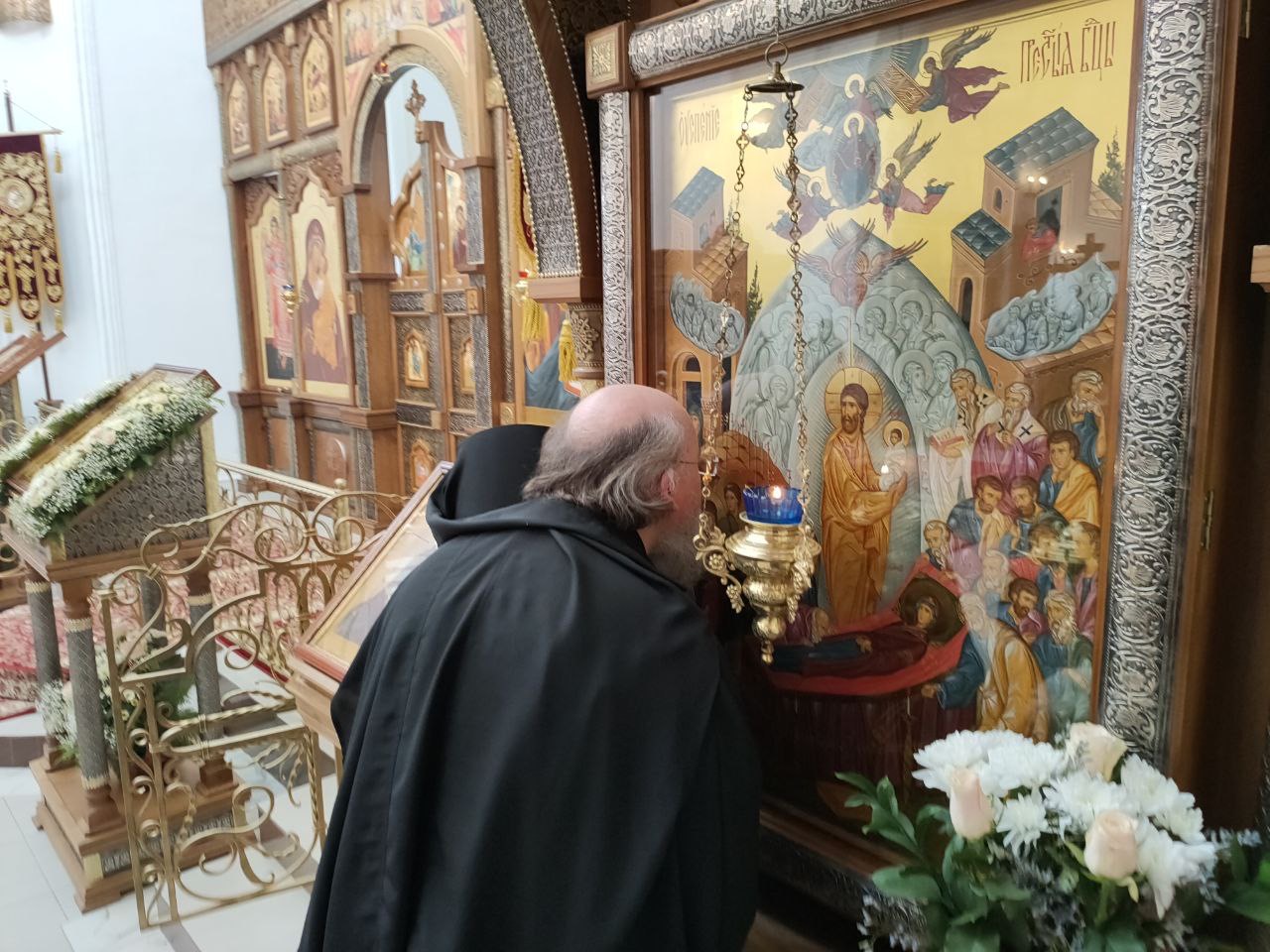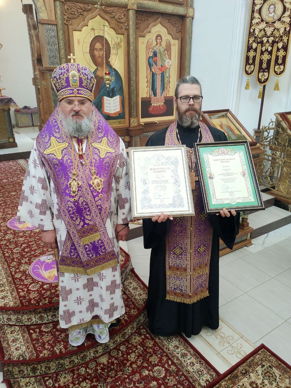 Архипастырь поздравил клирика монастыря иерея Алексия Бокова с патилетием иерейской хиротонии и сорокапятилетием со дня рождения и вручил ему благодарственную Архиерейскую грамоту.
