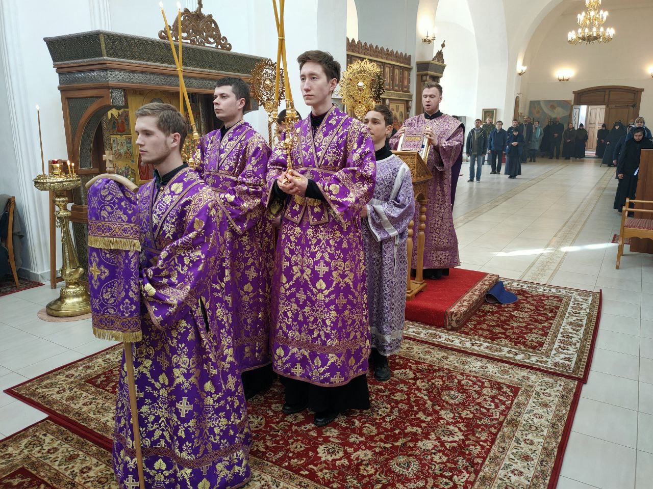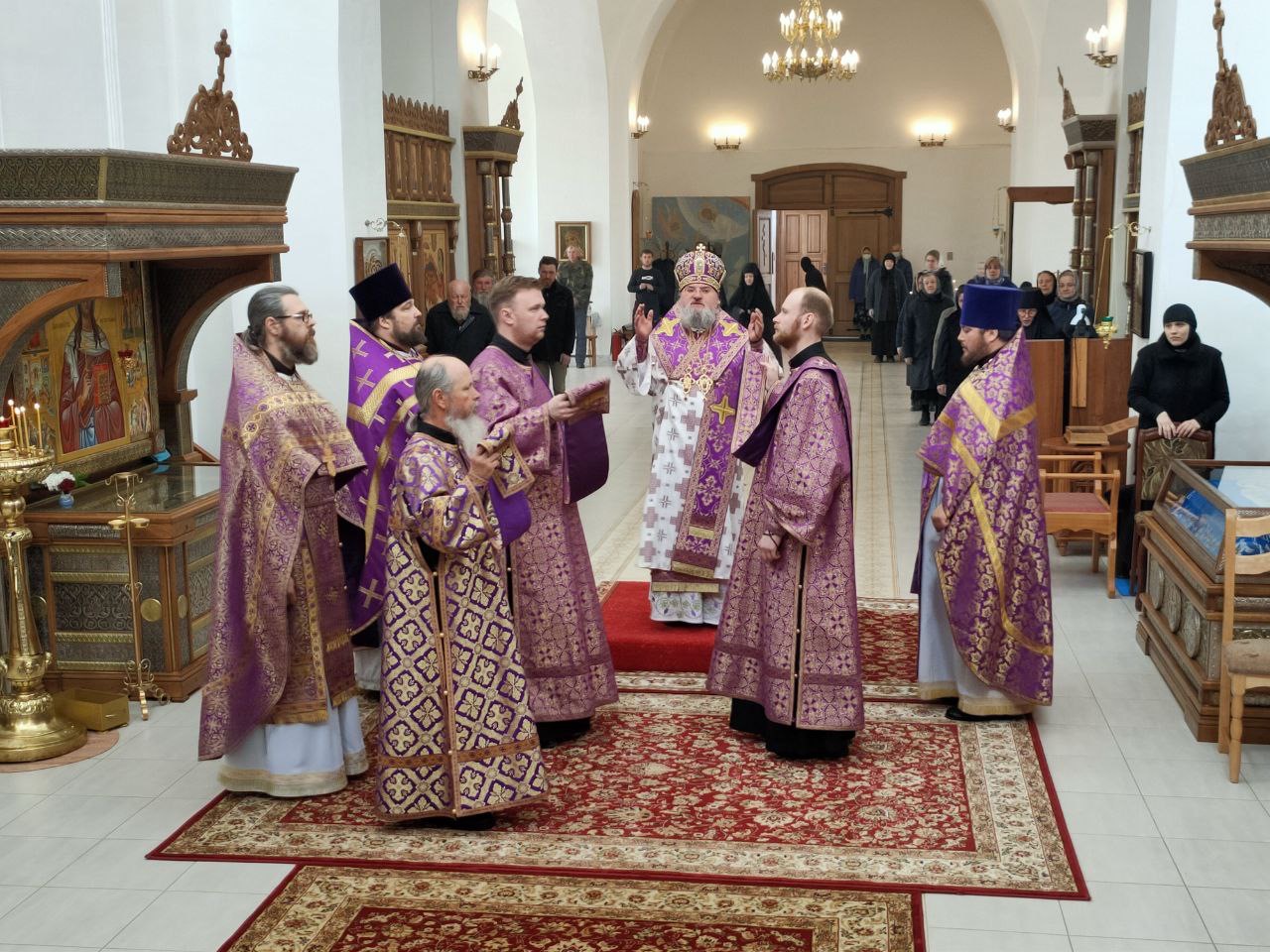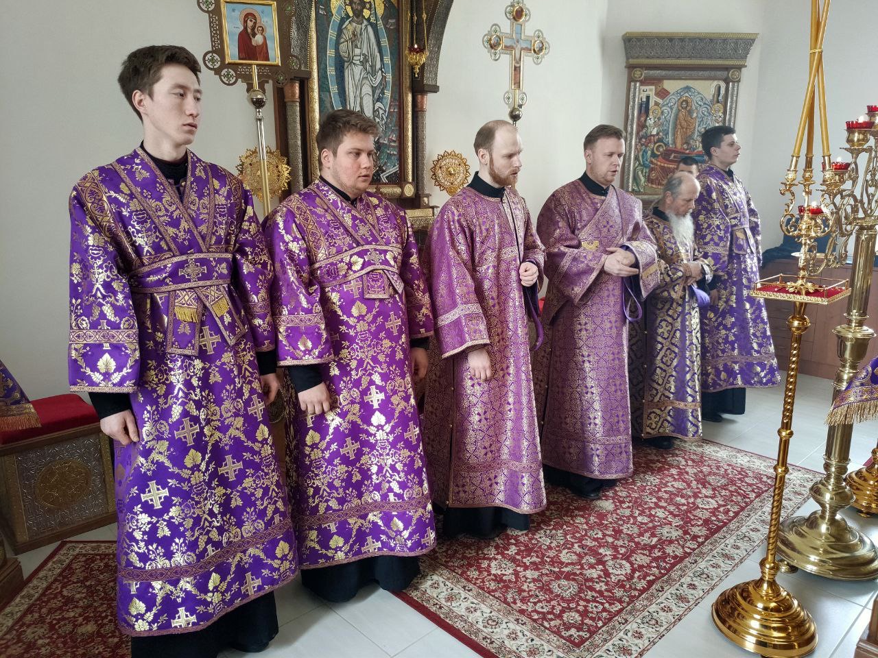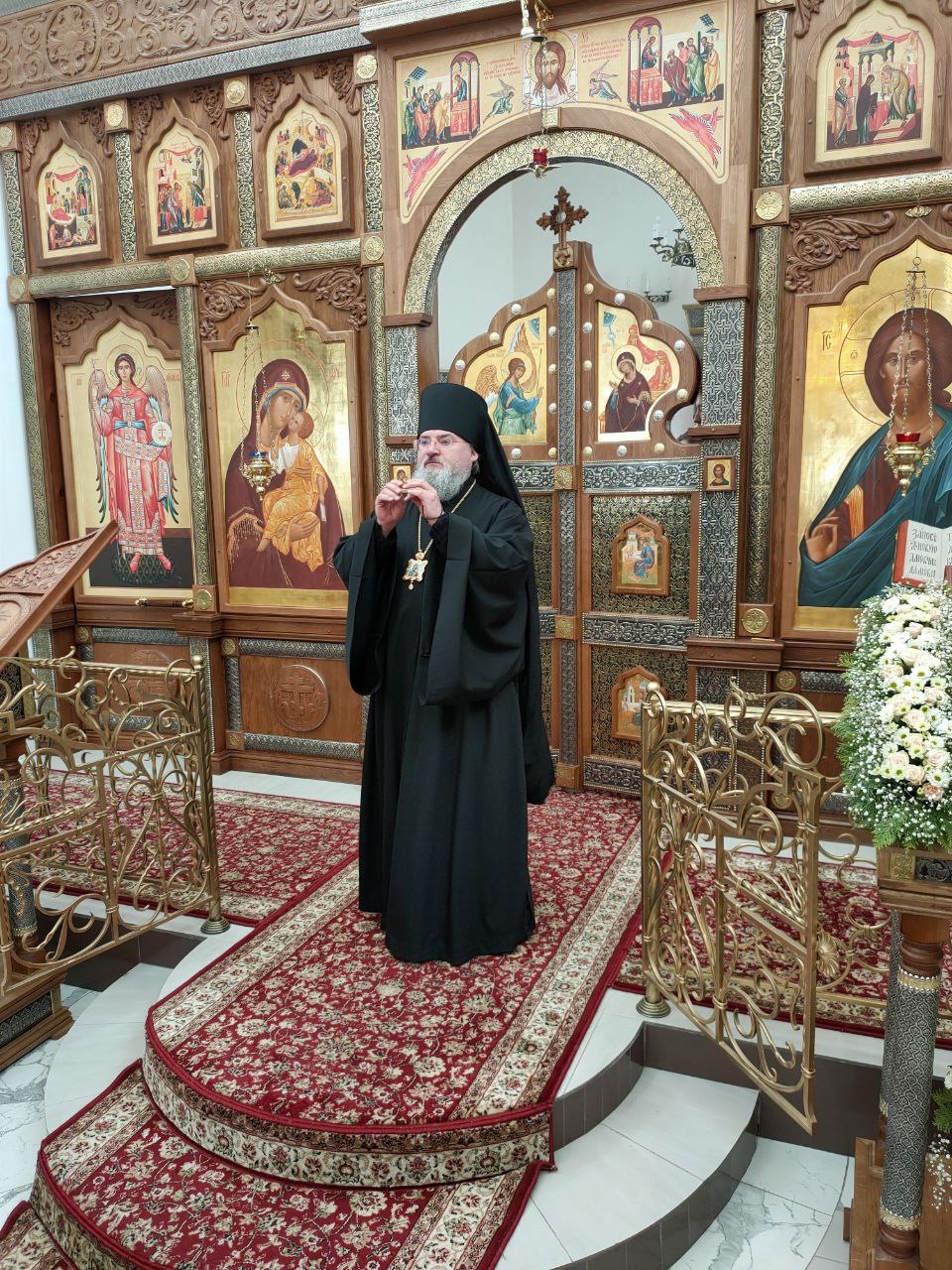 Его Преосвященству сослужили: протоиерей Владимир Бахаев, секретарь епархии; протоиерей Антоний Хатунцев, иерей Алексий Боков, диакон Евгений Ковригин, иеродиакон Алексий (Гудименко) и иеродиакон Лука (Старостин).