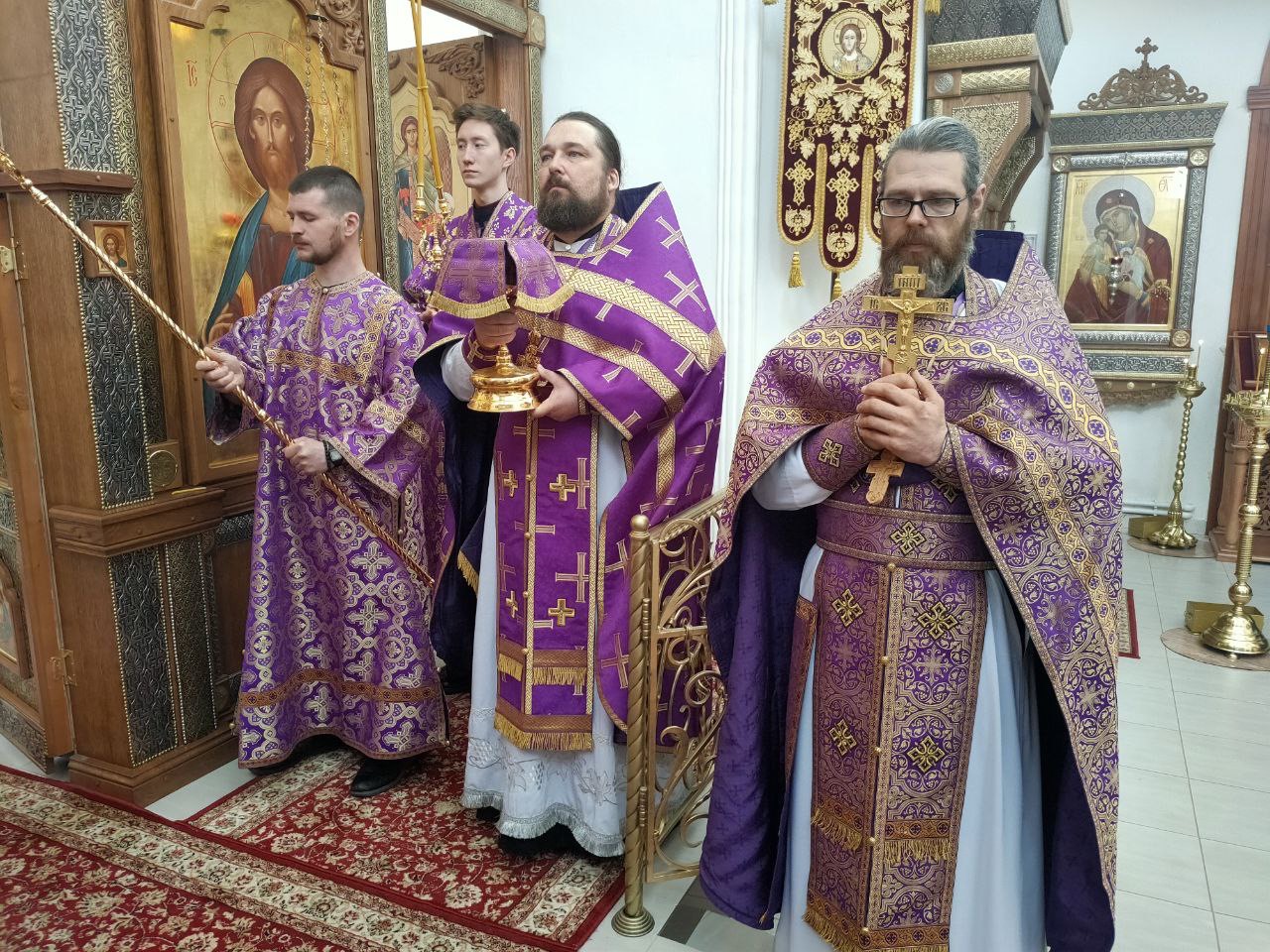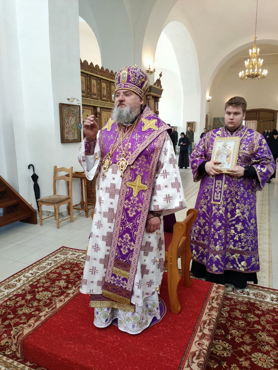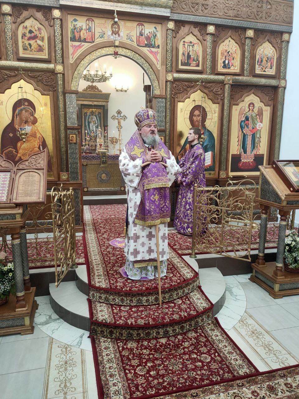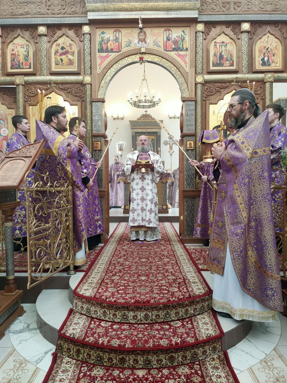 Его Преосвященству сослужили: протоиерей Владимир Бахаев, секретарь епархии; протоиерей Антоний Хатунцев, иерей Алексий Боков, диакон Евгений Ковригин, иеродиакон Алексий (Гудименко) и иеродиакон Лука (Старостин).