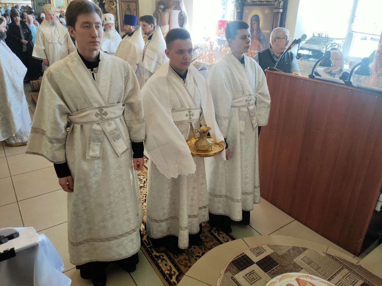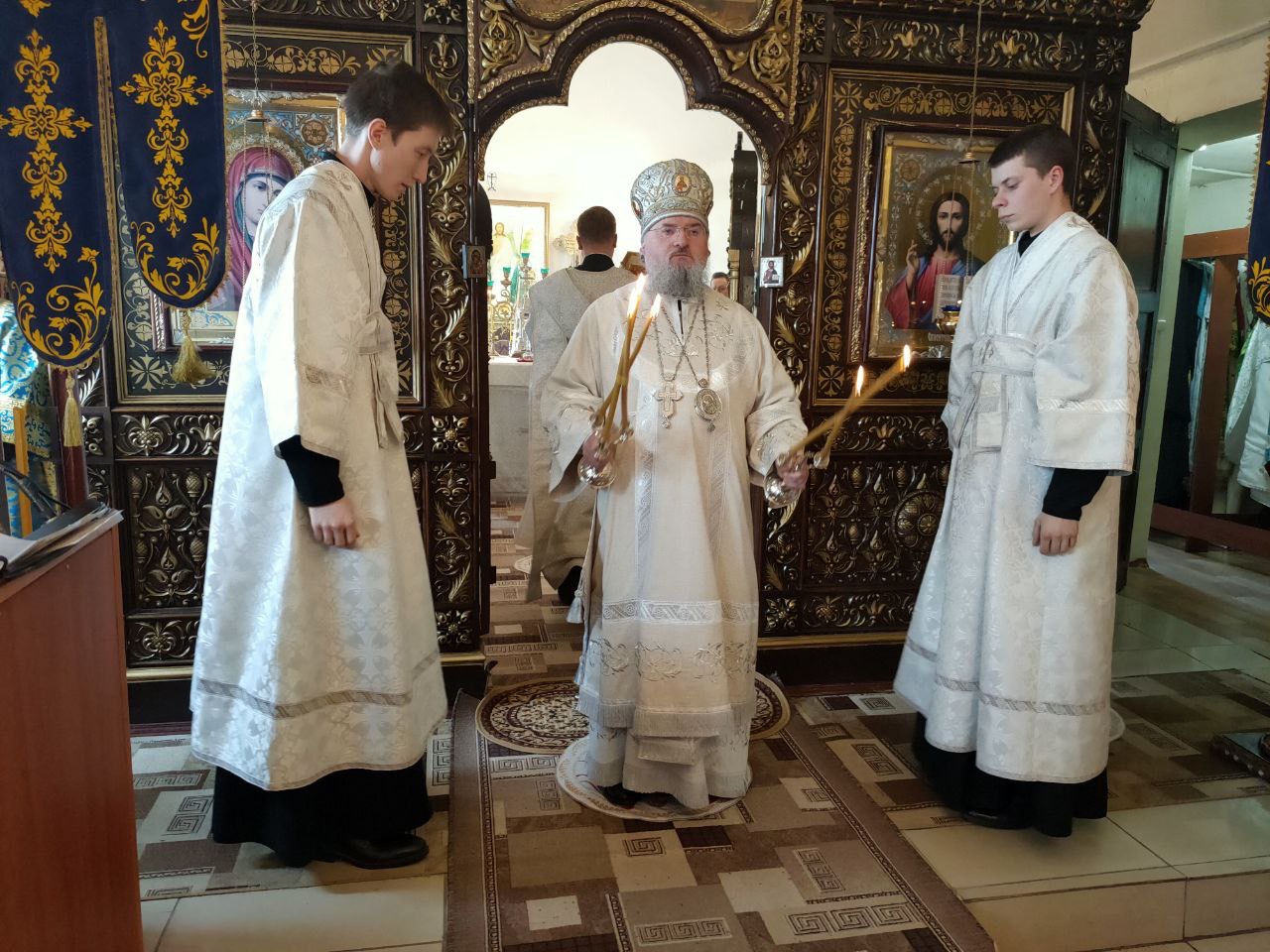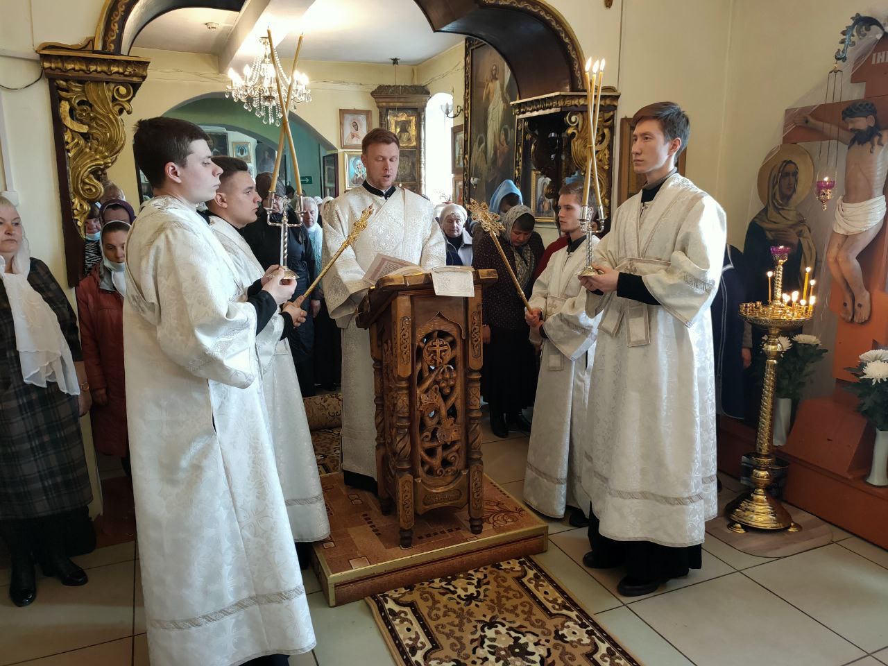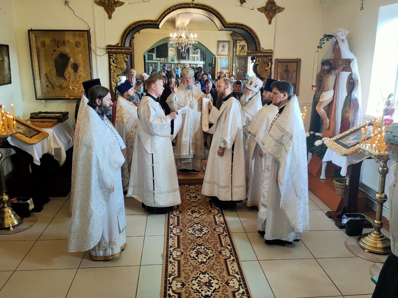 Его Преосвященству сослужили: протоиерей Василий Биляк – благочинный округа, протоиерей Алексий Жиганов – духовник епархии, протоиерей Михаил Карпенко – настоятель храма, протоиерей Антоний Хатунцев, иерей Георгий Краснов, иерей Иоанн Майоров, диакон Евгений Ковригин и иеродиакон Лука (Старостин).