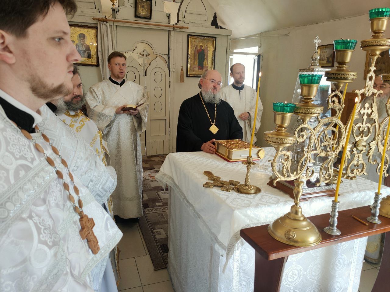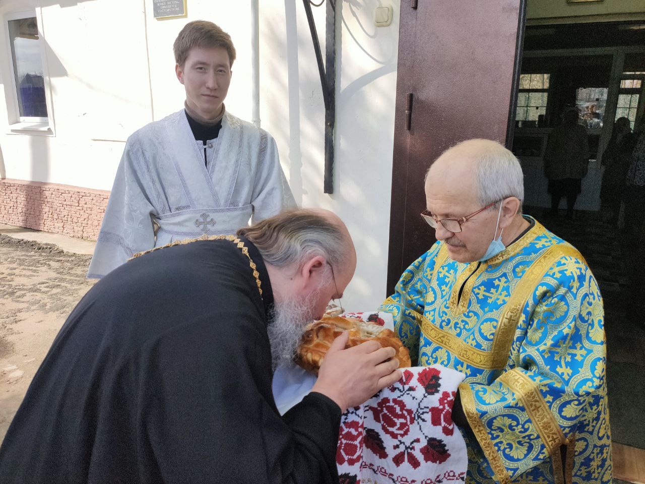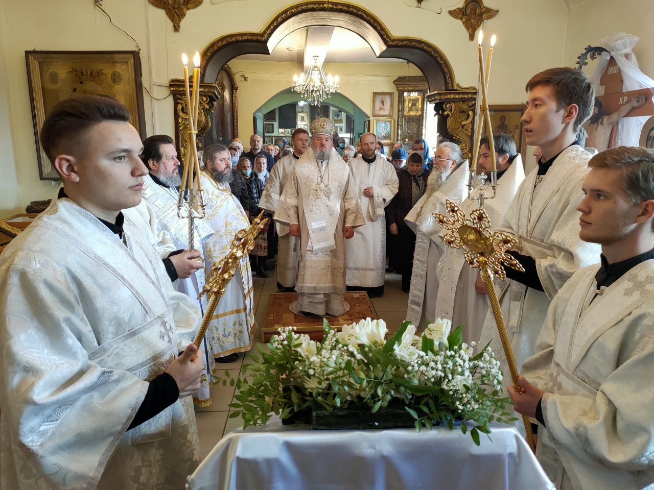 Его Преосвященству сослужили: протоиерей Василий Биляк – благочинный округа, протоиерей Алексий Жиганов – духовник епархии, протоиерей Михаил Карпенко – настоятель храма, протоиерей Антоний Хатунцев, иерей Георгий Краснов, иерей Иоанн Майоров, диакон Евгений Ковригин и иеродиакон Лука (Старостин).