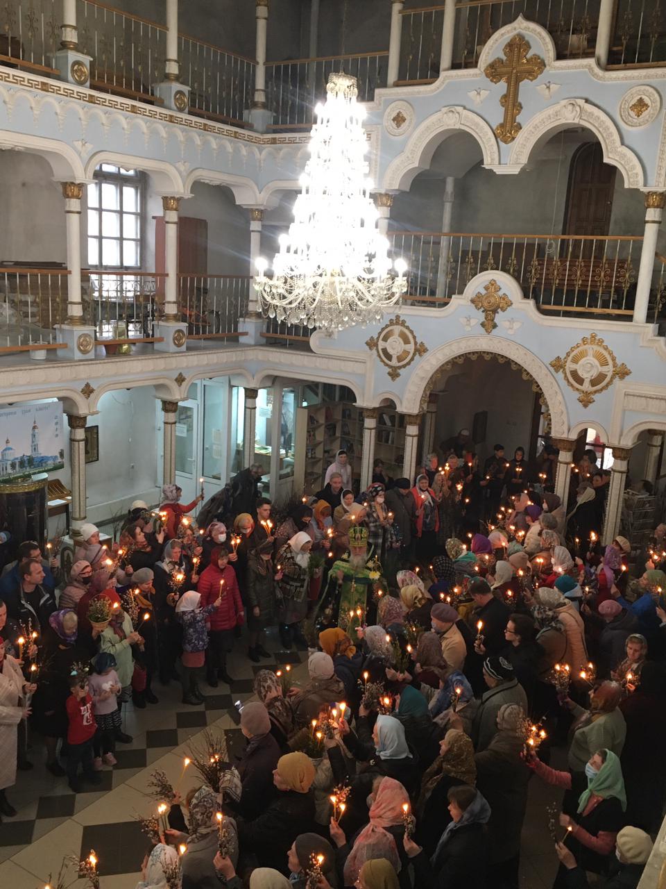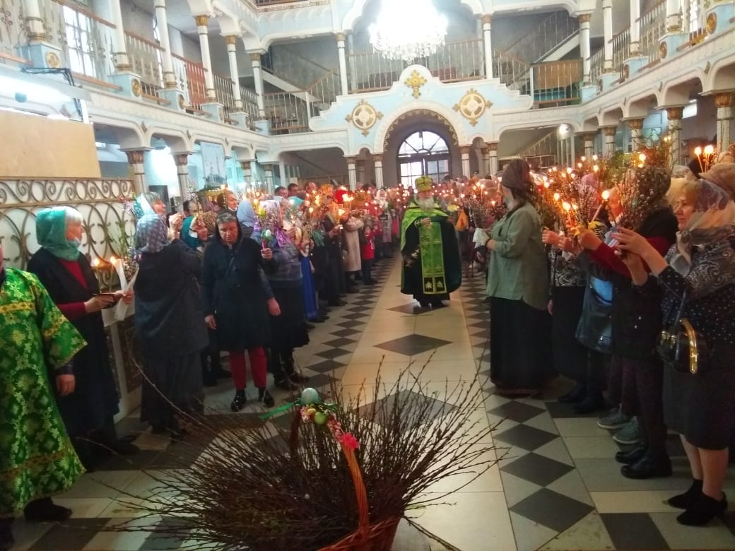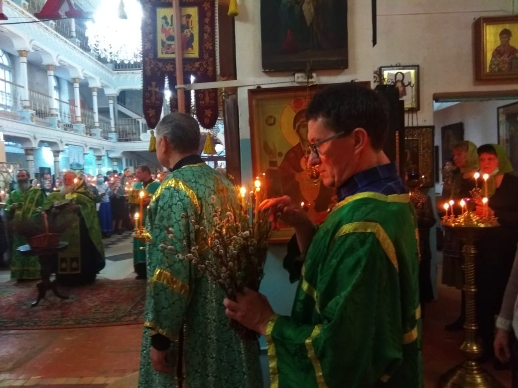 Вечером, 24 апреля 2021 года, в канун праздника Входа Господня в Иерусалим, в Казанском соборе города Людиново настоятель собора протоиерей Алексий Жиганов в сослужении клириков собора иерея Алексия Сначёва и диакона Андрея Соколова совершили Всенощное бдение.