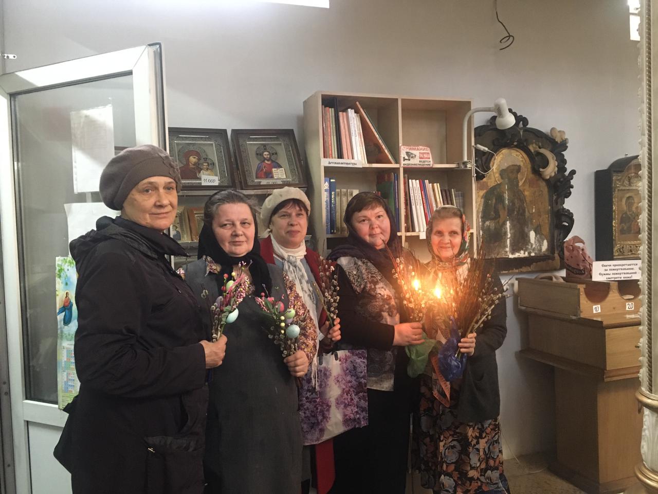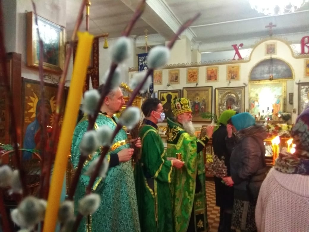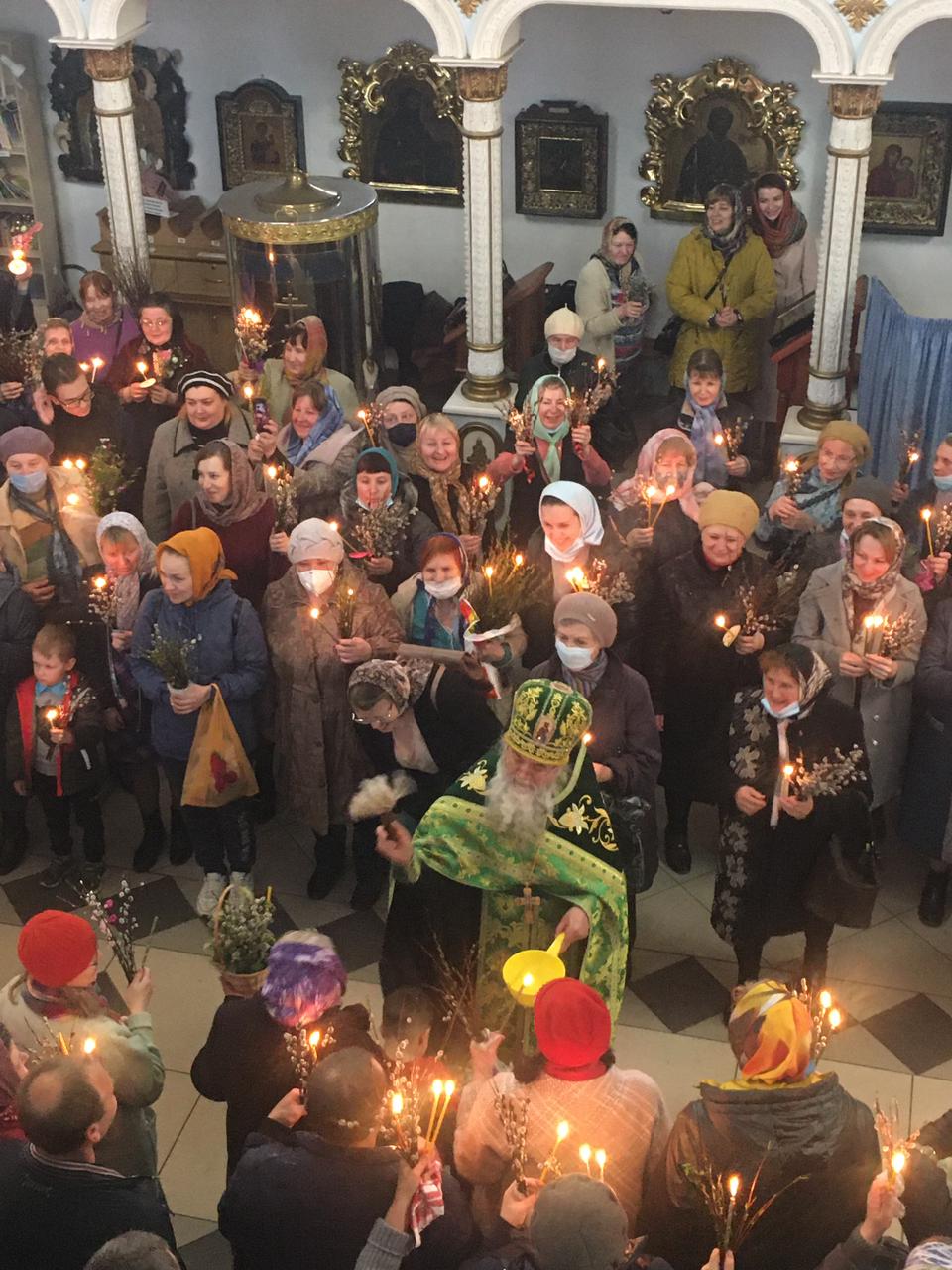 После чтения Евангелия отец Алексий совершил Чин освящения веточек верб, которые были принесены богомольцами на богослужение.