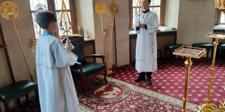 За богослужением владыка вознес молитву о избавлении от смертоносного поветрия и особую молитву о мире на Святой Земле.