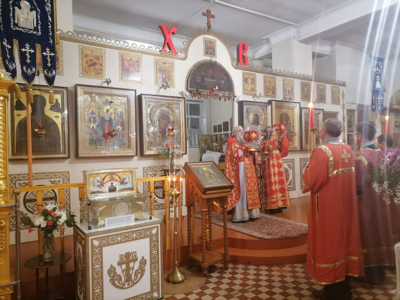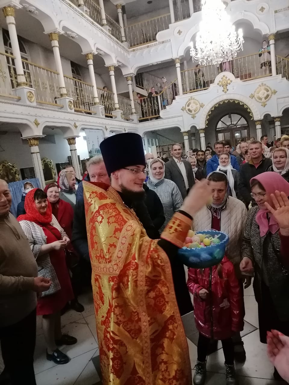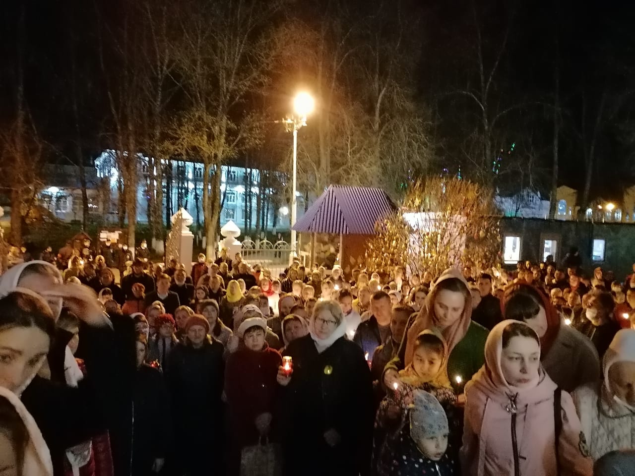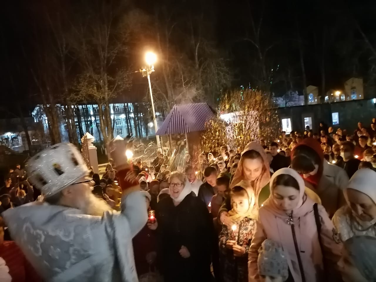 Ровно в полночь начался Крестный ход. Под колокольный звон и пение «Воскресение Твое, Христе Спасе…» священники и верующие со свечами обошли храм, настоятель собора возгласил первое «Христос Воскресе!» и началось Пасхальное Богослужение.