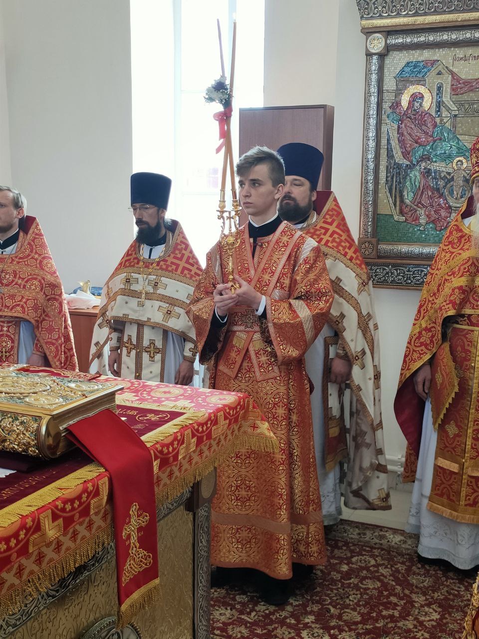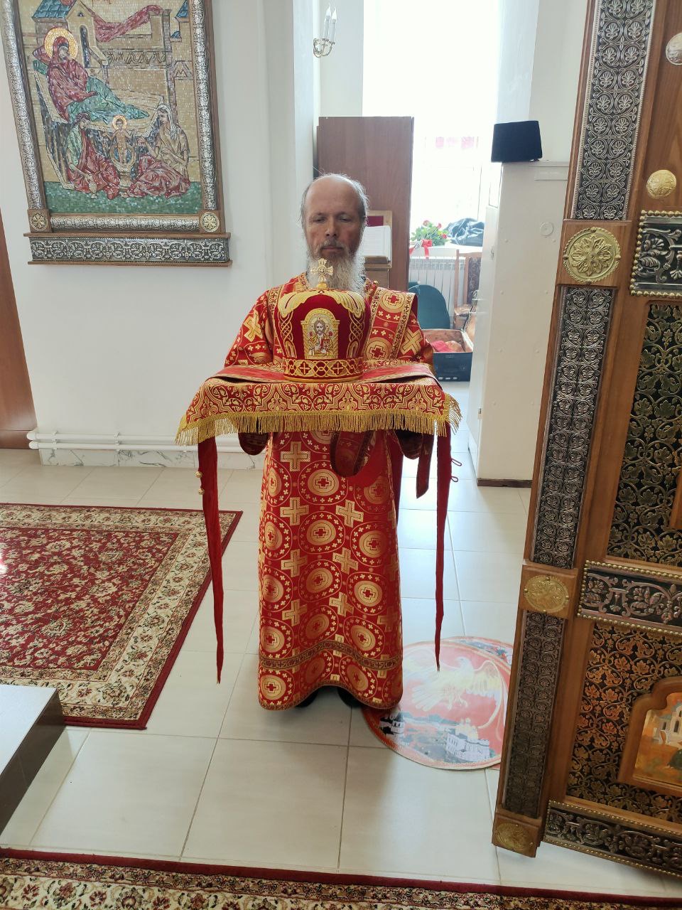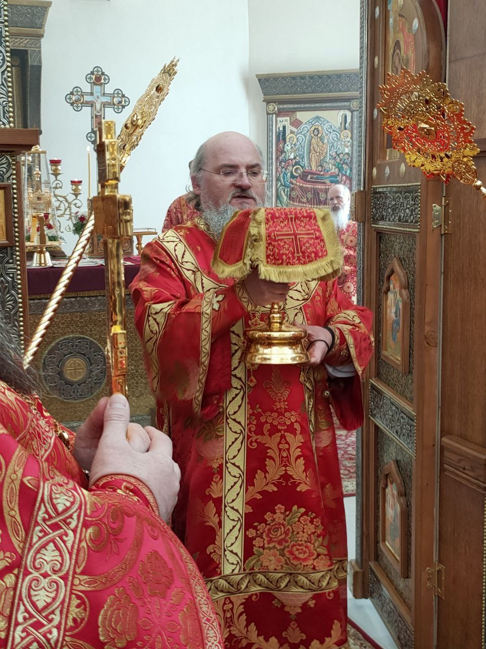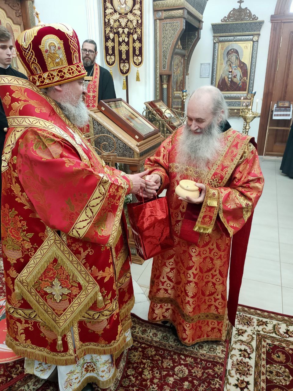 Затем владыка обратился со словами поздравления к иеродиакону Виталию (Павленко), у которого также в этот день случились святые именины, и ему архипастырь вручил просфору и памятный подарок.