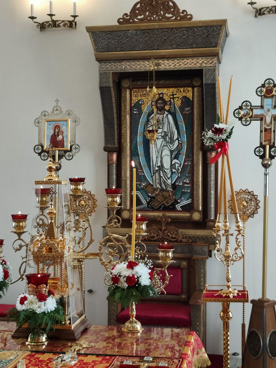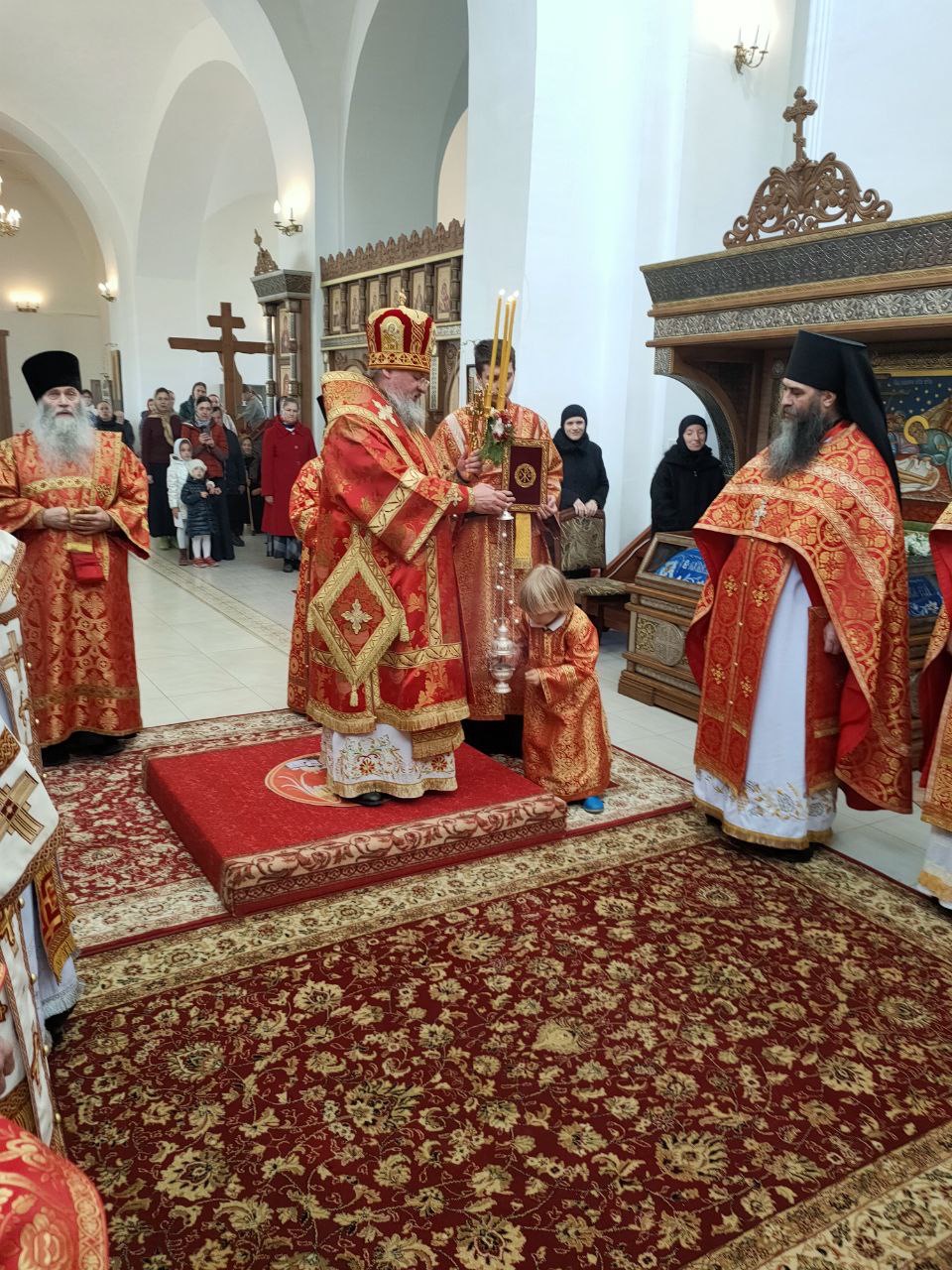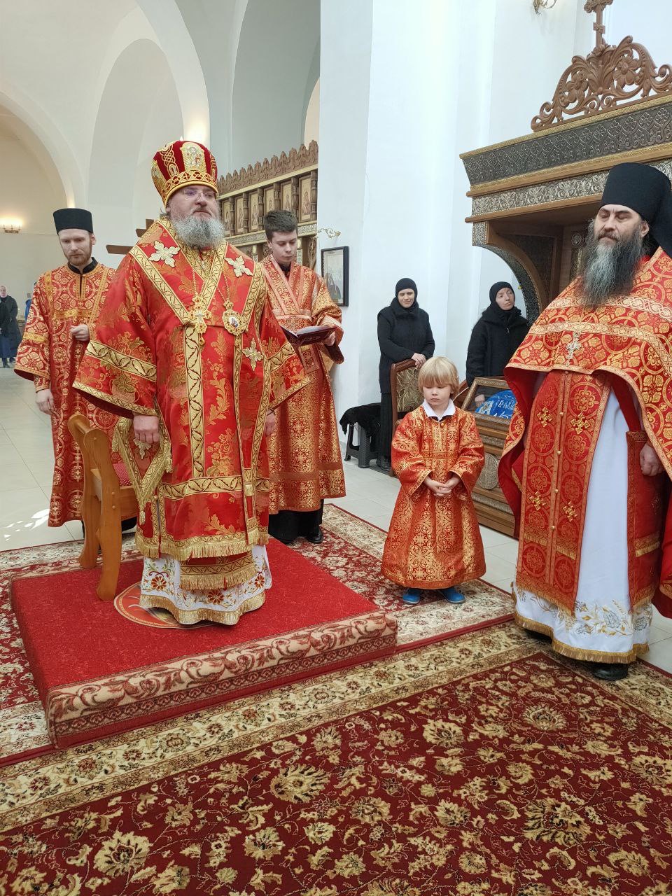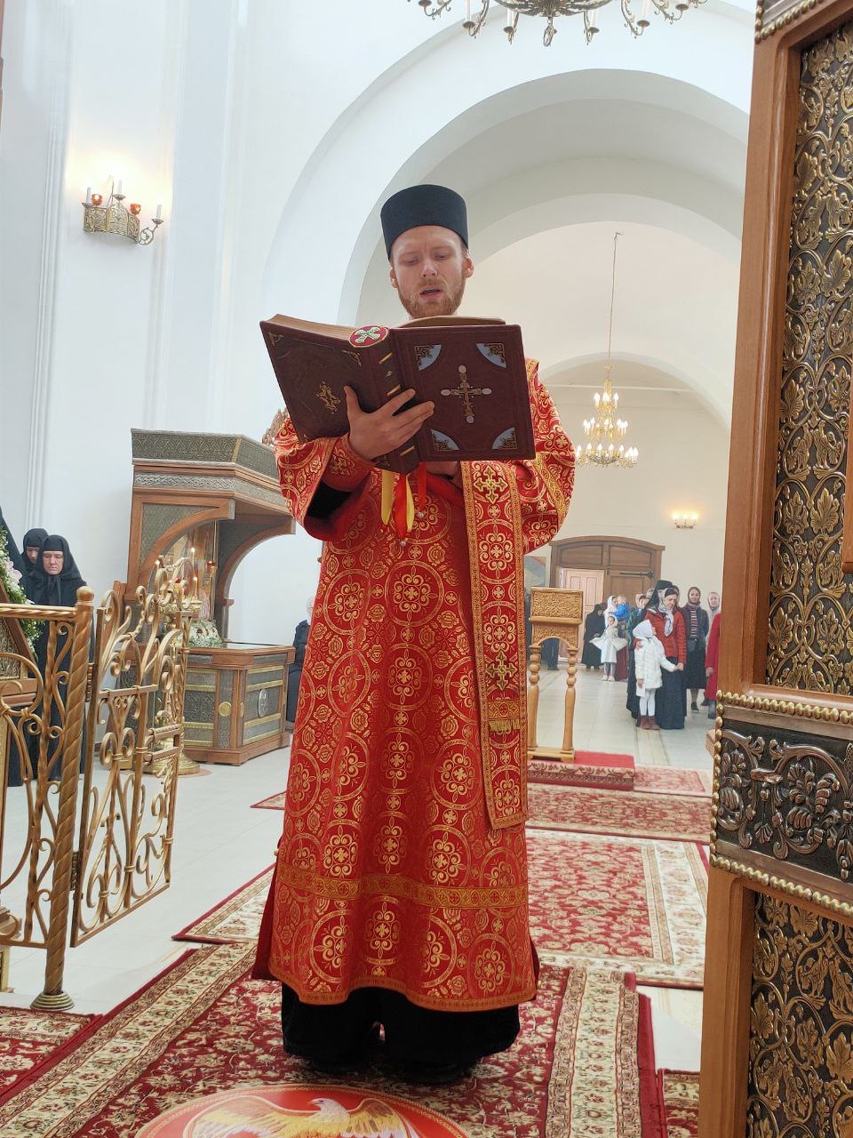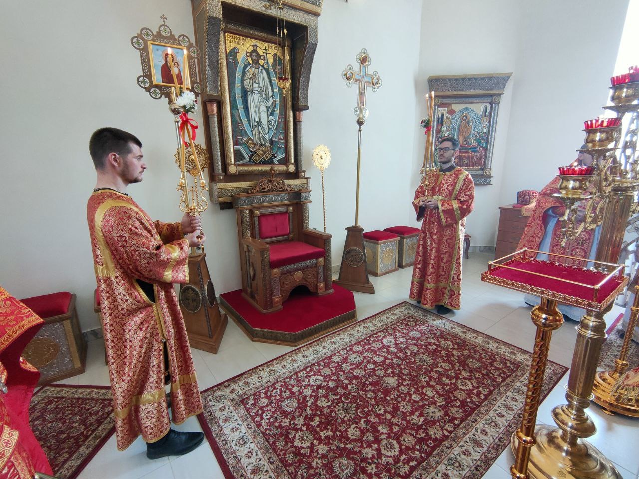 Затем владыка обратился со словами поздравления к иеродиакону Виталию (Павленко), у которого также в этот день случились святые именины, и ему архипастырь вручил просфору и памятный подарок.