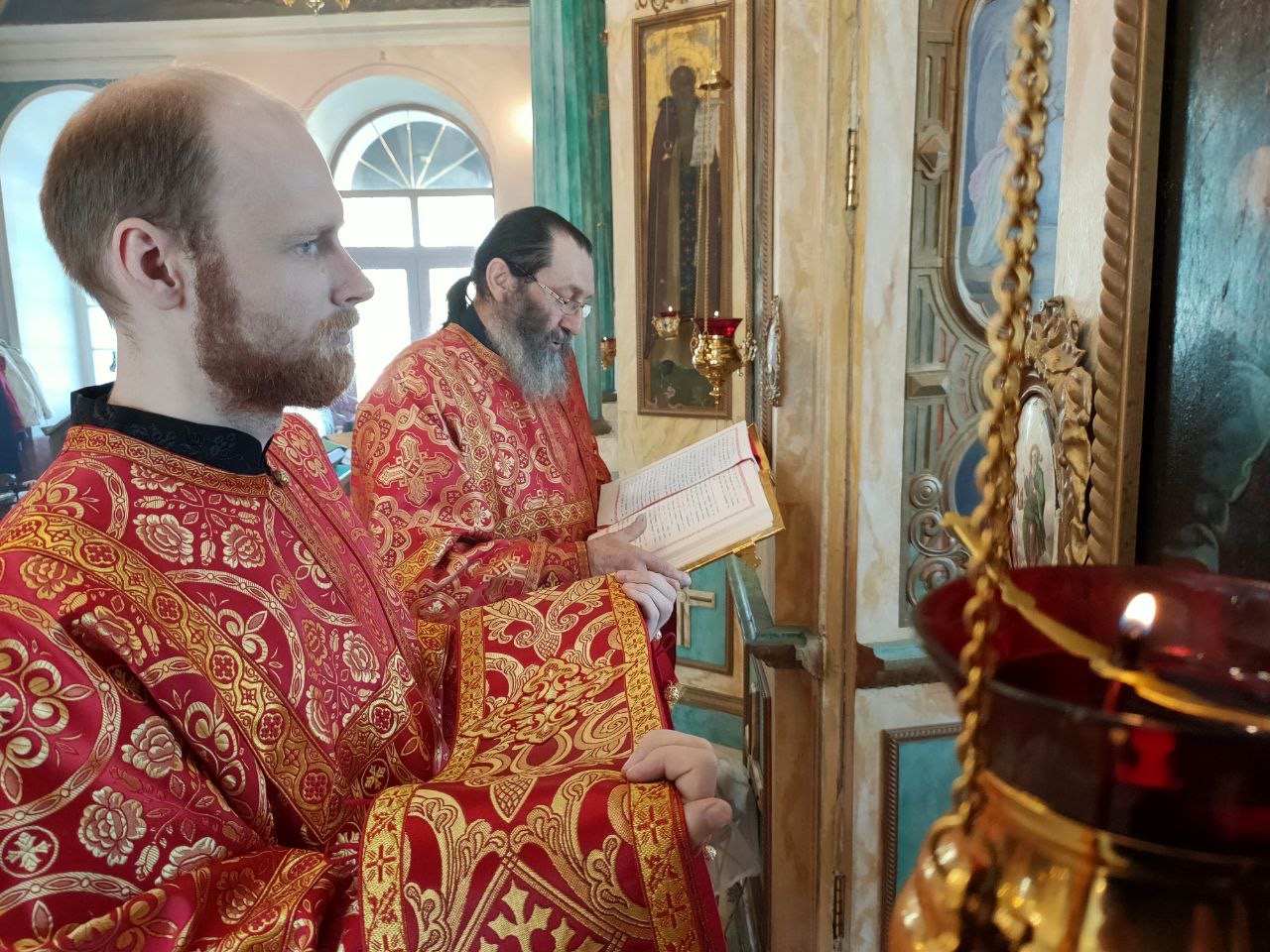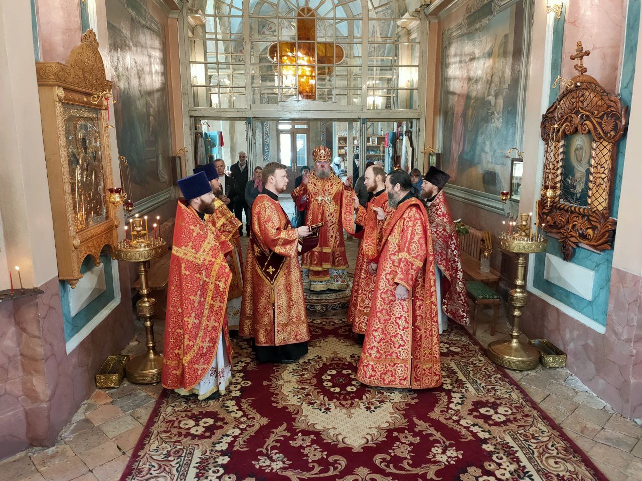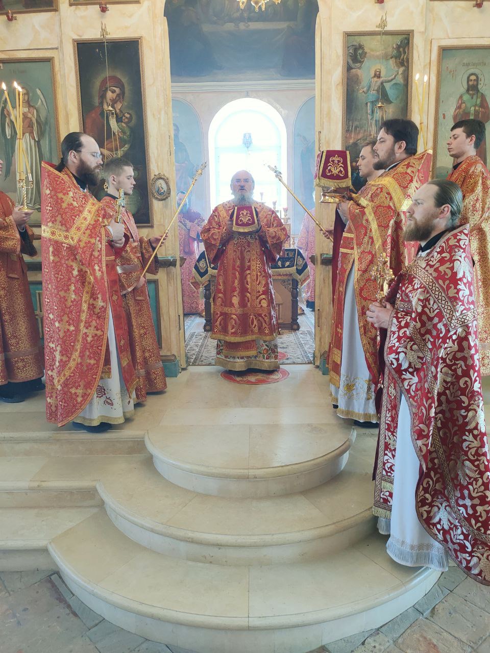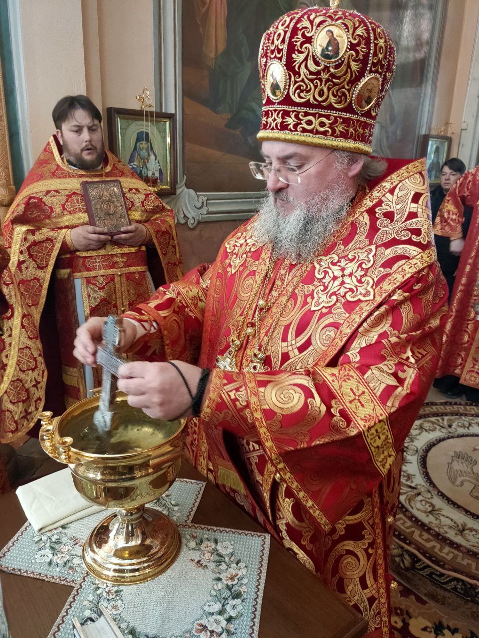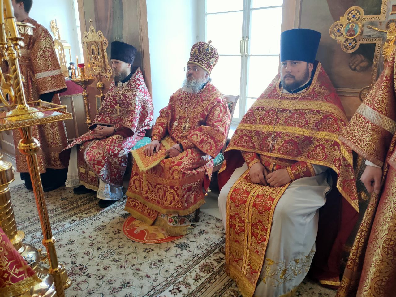 Преосвященному владыке сослужили: протоиерей Антоний Хатунцев, настоятель храма — иерей Тихон Худяков, иерей Симеон Худяков, диакон Евгений Ковригин, диакон Евгений Васильев, диакон Валерий Волков и иеродиакон Лука (Старостин).