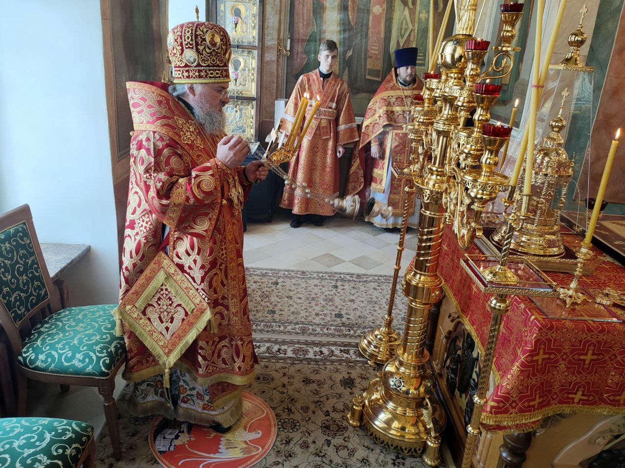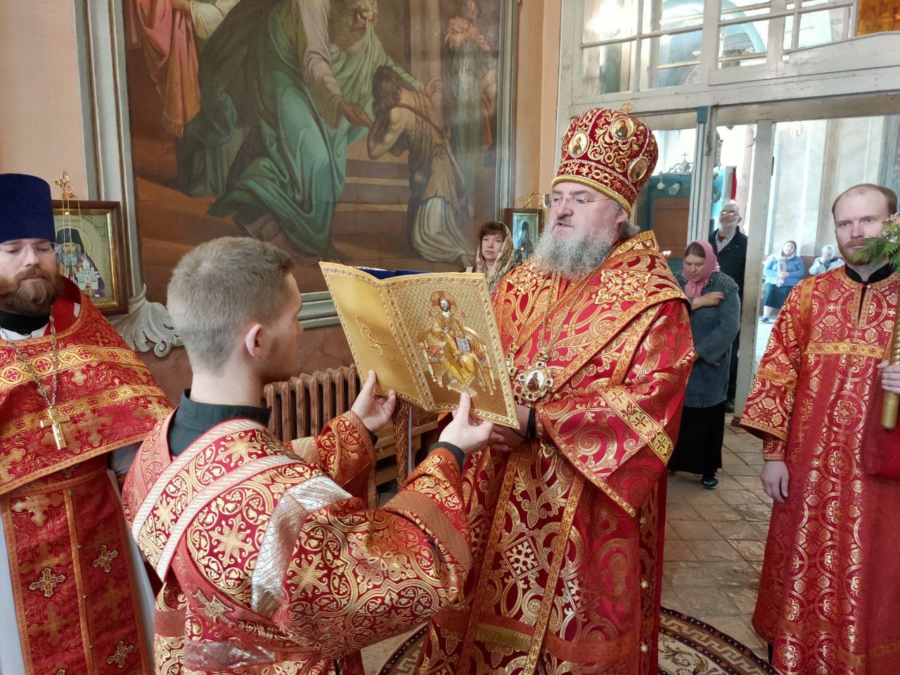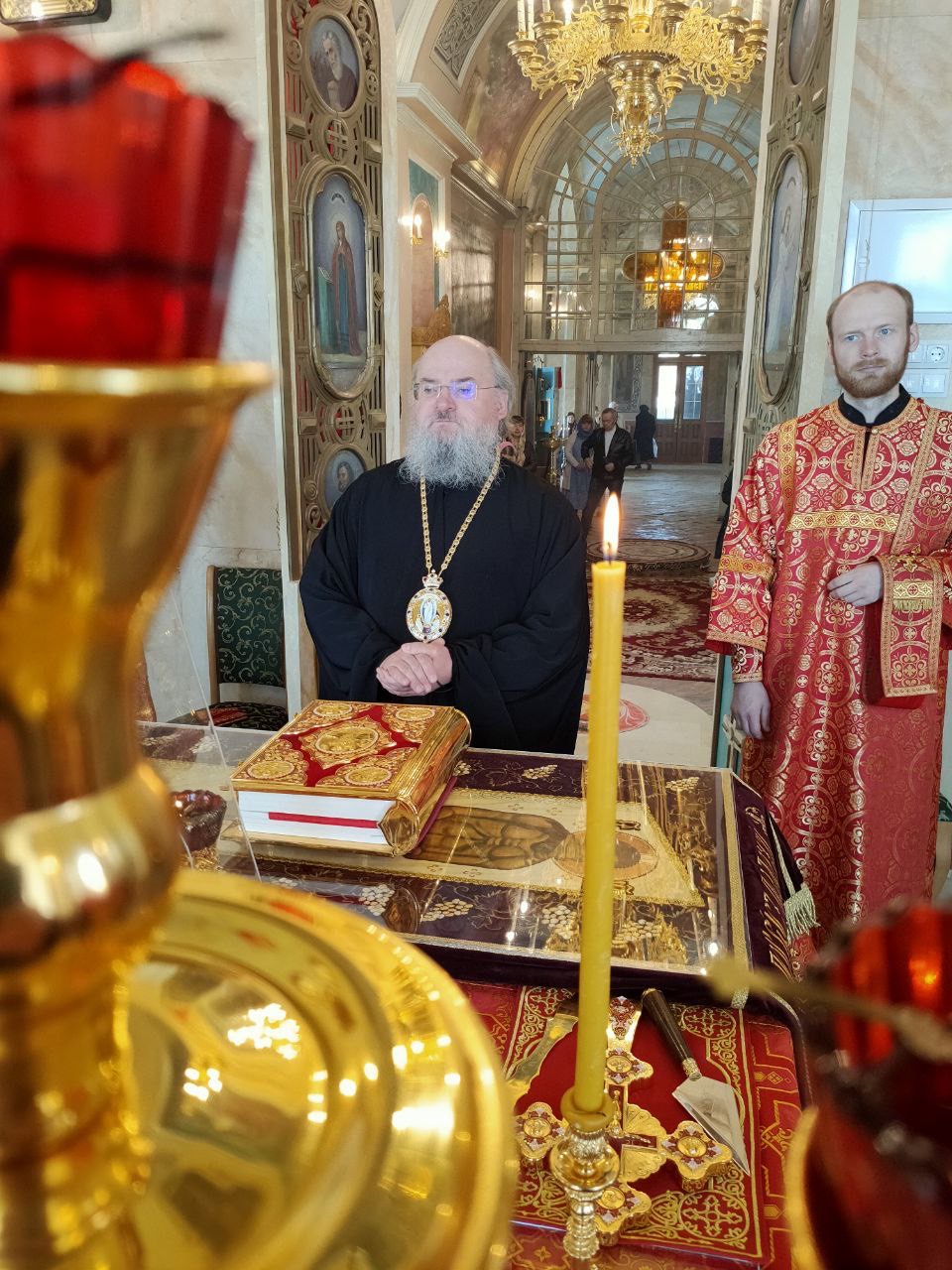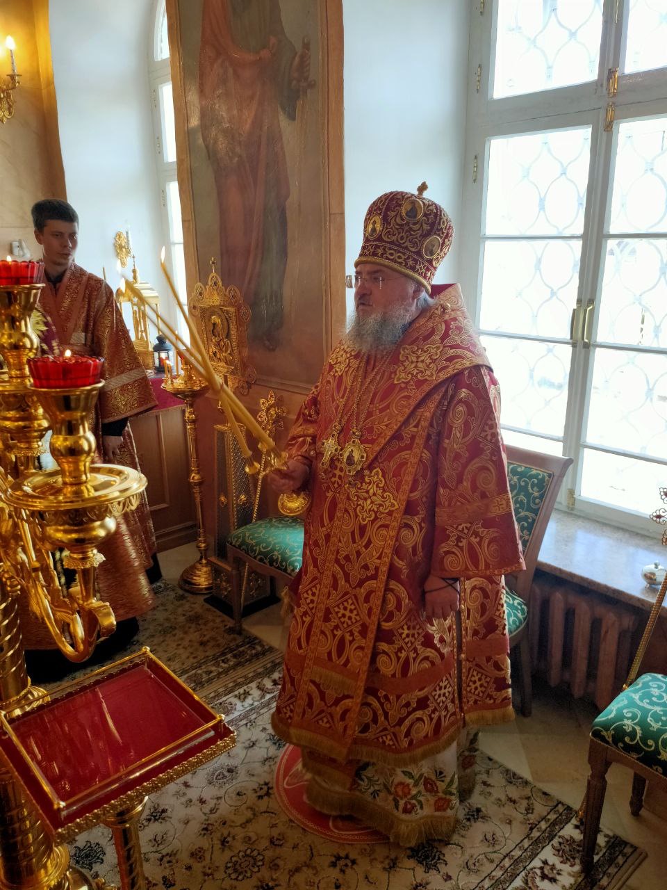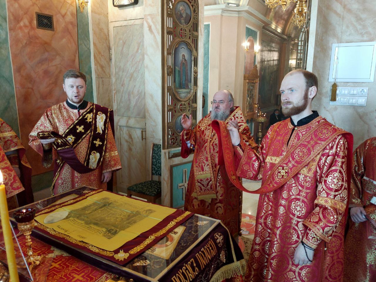 Преосвященному владыке сослужили: протоиерей Антоний Хатунцев, настоятель храма — иерей Тихон Худяков, иерей Симеон Худяков, диакон Евгений Ковригин, диакон Евгений Васильев, диакон Валерий Волков и иеродиакон Лука (Старостин).