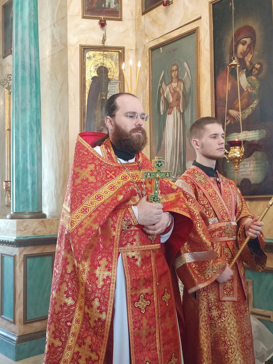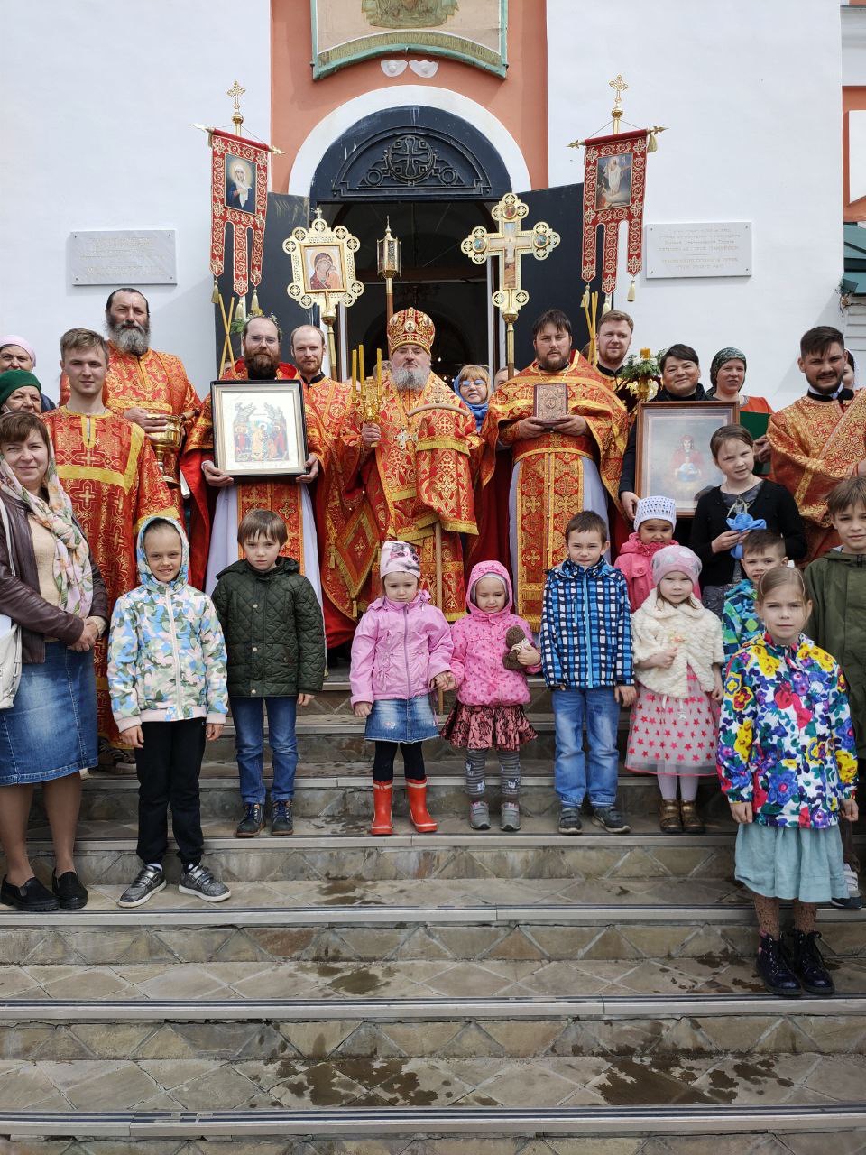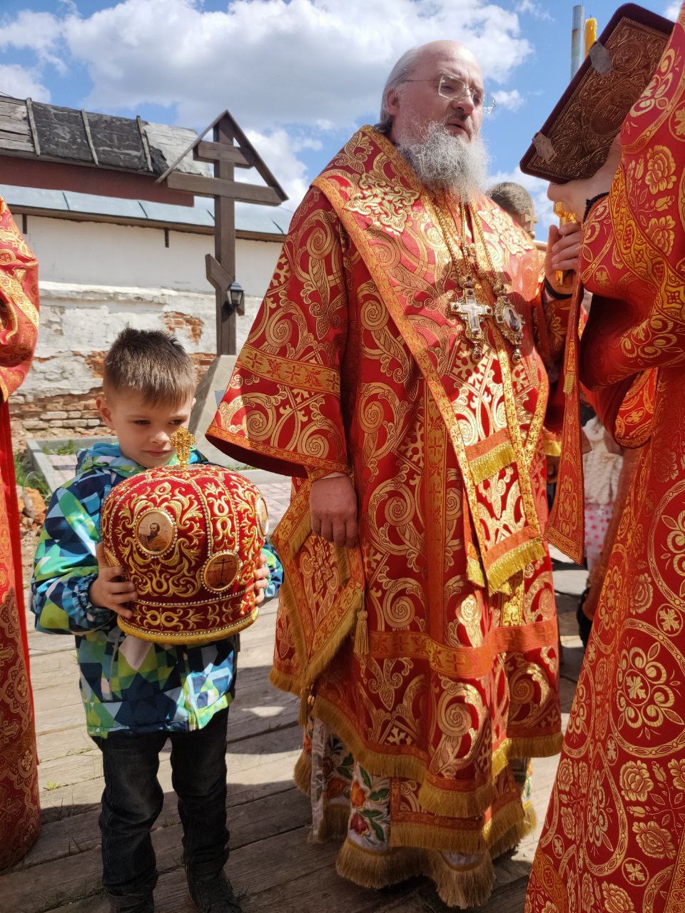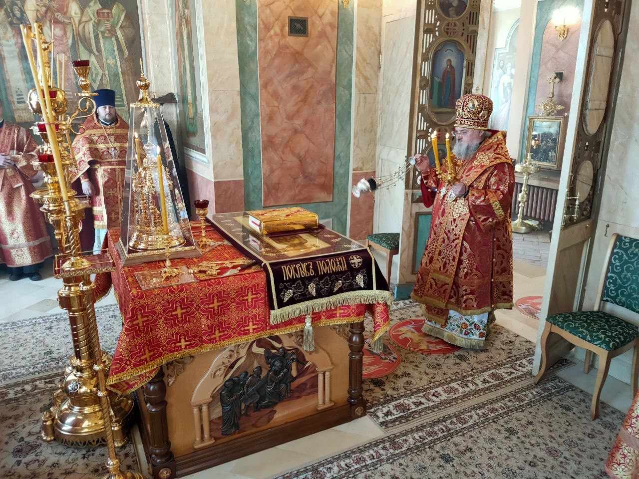 Преосвященному владыке сослужили: протоиерей Антоний Хатунцев, настоятель храма — иерей Тихон Худяков, иерей Симеон Худяков, диакон Евгений Ковригин, диакон Евгений Васильев, диакон Валерий Волков и иеродиакон Лука (Старостин).