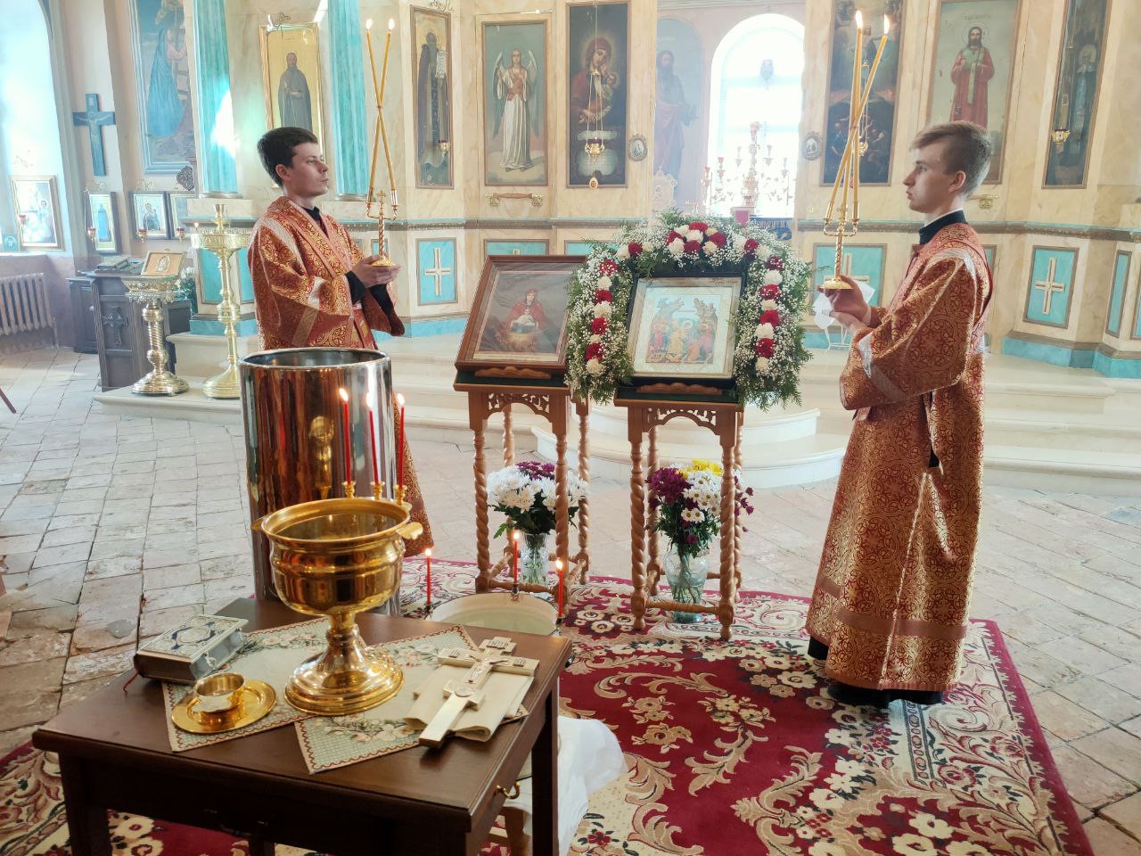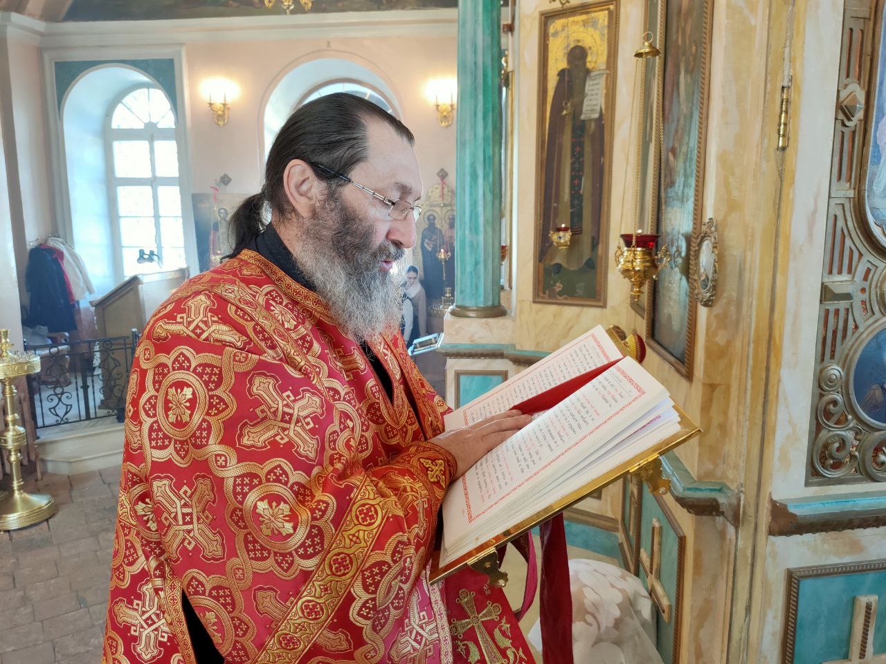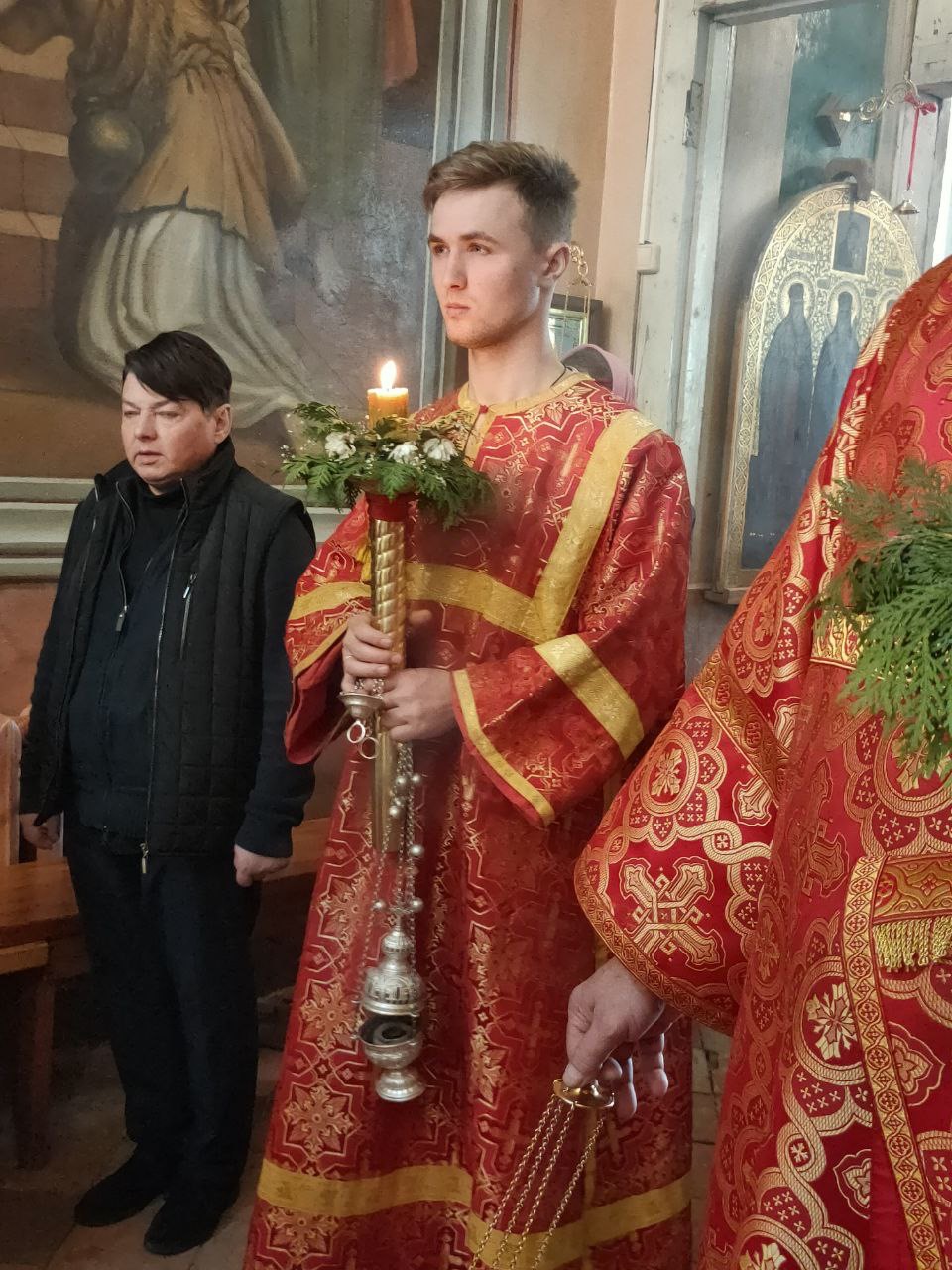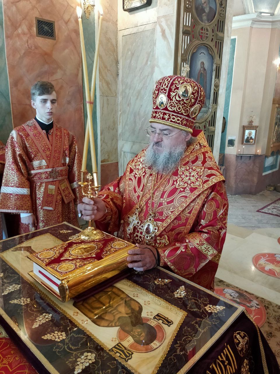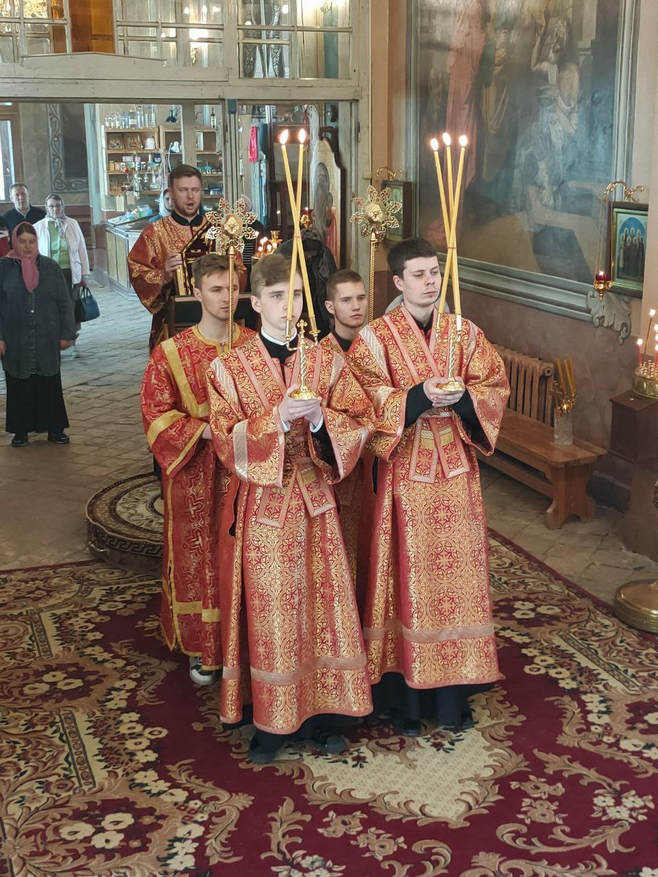 Преосвященному владыке сослужили: протоиерей Антоний Хатунцев, настоятель храма — иерей Тихон Худяков, иерей Симеон Худяков, диакон Евгений Ковригин, диакон Евгений Васильев, диакон Валерий Волков и иеродиакон Лука (Старостин).