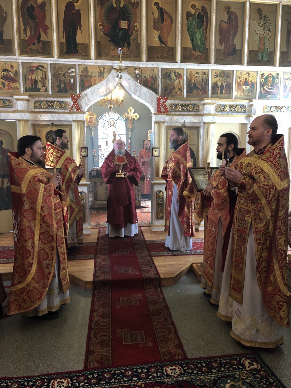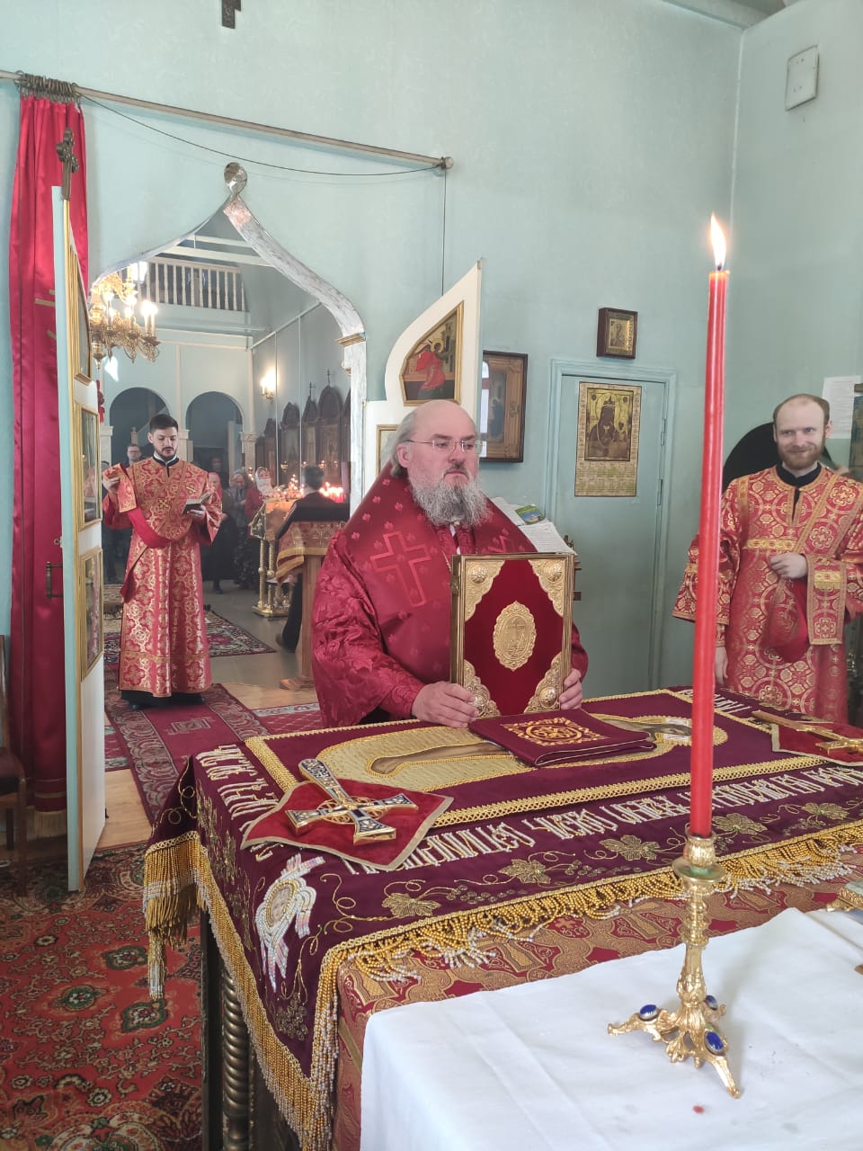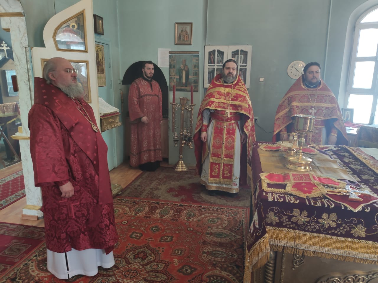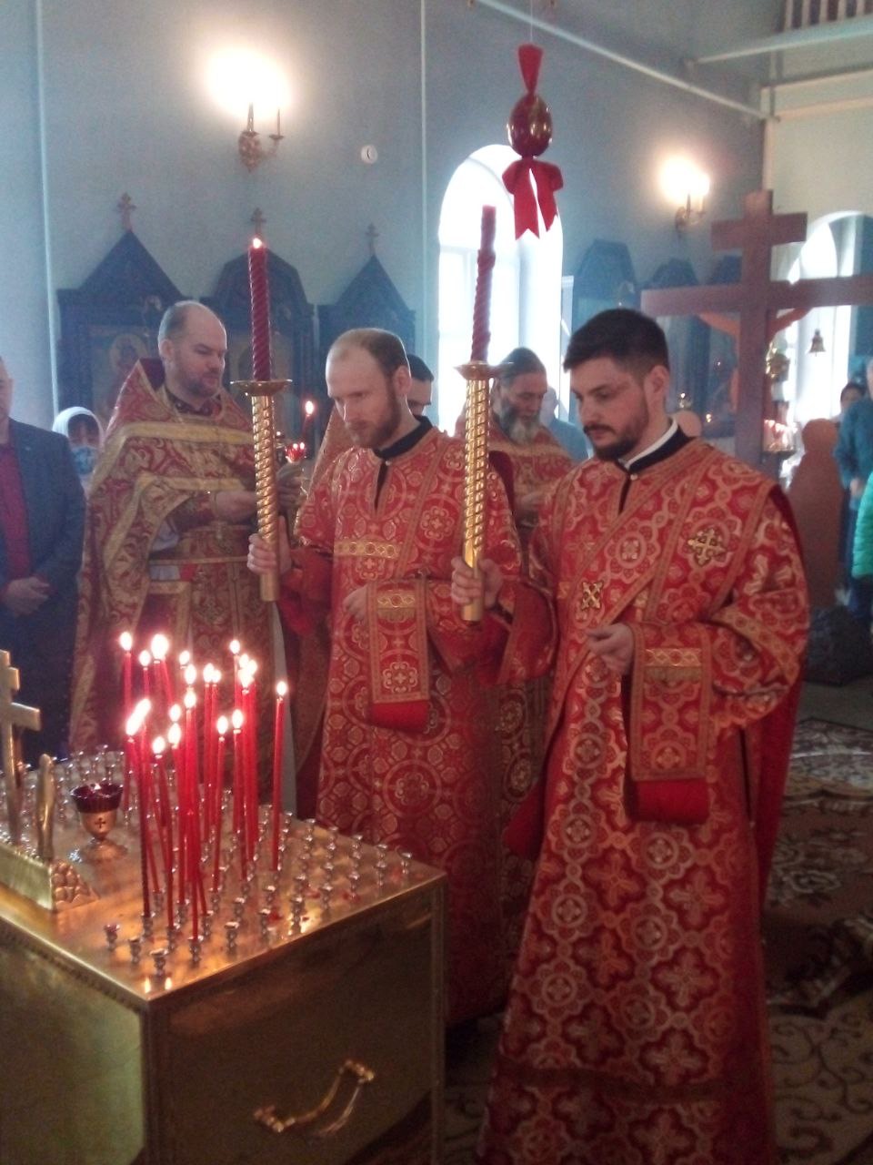 Преосвященнейшему владыке сослужили: благочинный округа протоиерей Сергий Вишняков, протоиерей Павел Синицын – настоятель храма, протоиерей Георгий Кривенко, протоиерей Антоний Хатунцев, иерей Павел Кузнецов, диакон Евгений Васильев и иеродиакон Лука (Старостин).