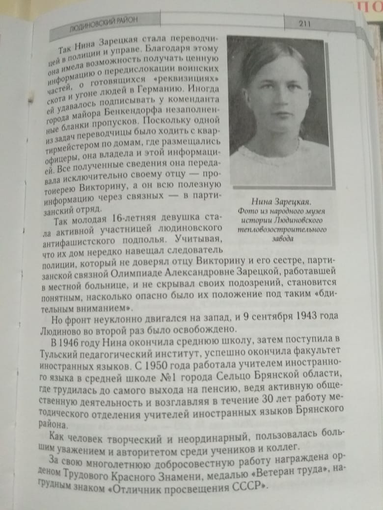 Нине Викториновне Зарецкой, уже ушедшей из земной жизни, 9 мая 2021 года исполнилось бы 95 лет со дня рождения. Память об этой удивительной хрупкой женщине живет в сердцах потомков, а её сила духа и отвага, преданность Родине во все года может служить примером патриотизма для любого поколения. В музее церковно – исторического краеведения при Казанском соборе хранятся личные вещи семьи Зарецких, фотографии разных лет. В библиотеке Казанского собора собраны документальные и художественные материалы, а также интересная литература о подвиге Людиновских подпольщиков.