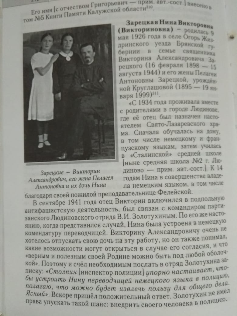 С началом немецко-фашистской оккупации священник Викторин Зарецкий включился в антифашистскую деятельность, был связан с партизанским отрядом В.И. Золотухина. По его же настоянию, когда представился случай, Нина была устроена в немецкую комендатуру переводчицей. Отцу не хотелось отпускать дочь на такую опасную работу. Ведь для неокрепшей души это было опасным испытанием. Терзаемый противоречивыми чувствами, он также прекрасно понимал, что в борьбе с врагом открываются новые возможности и перспективы. Так шестнадцатилетняя девушка стала активной участницей Людиновского антифашистского подполья.