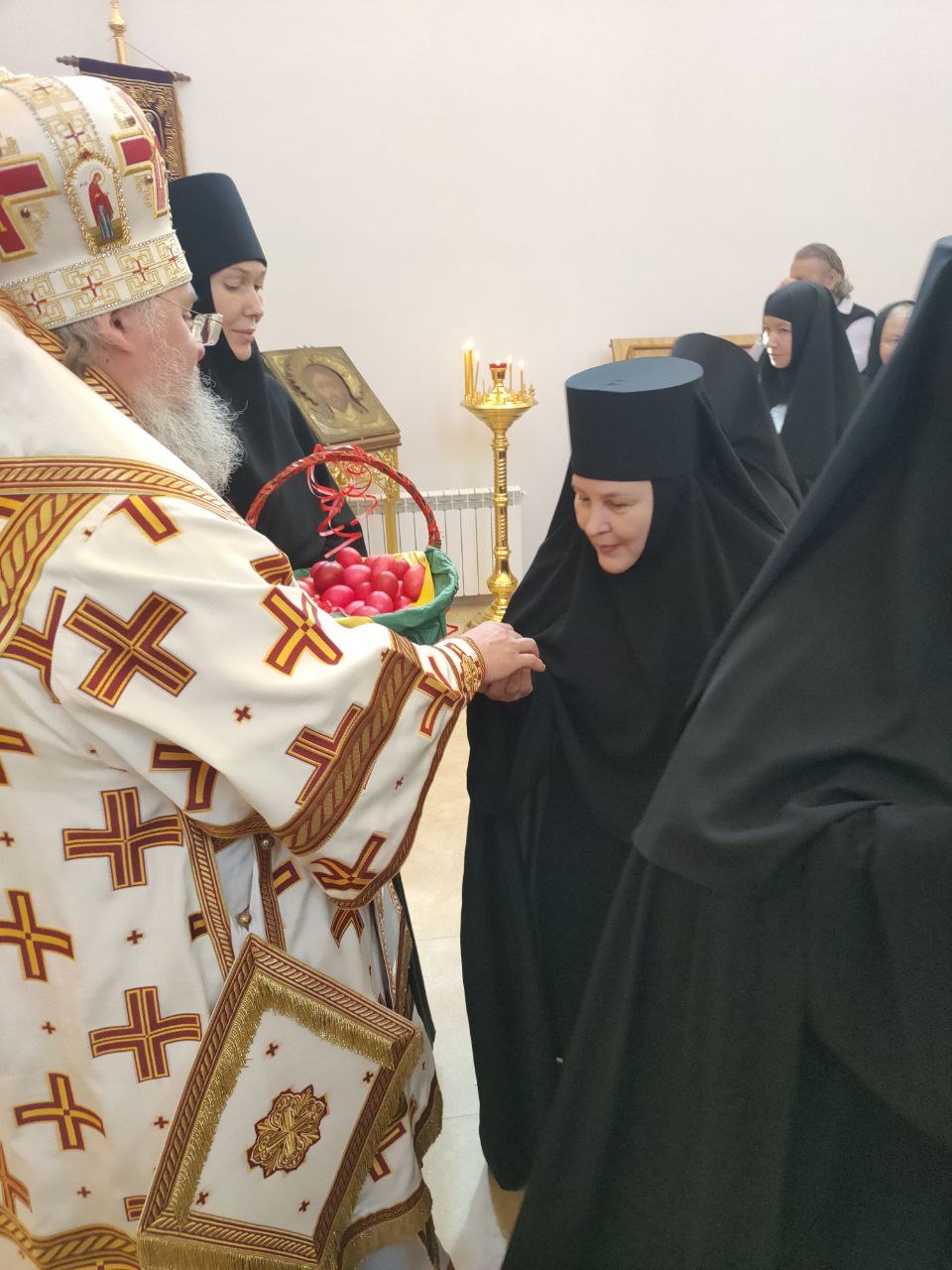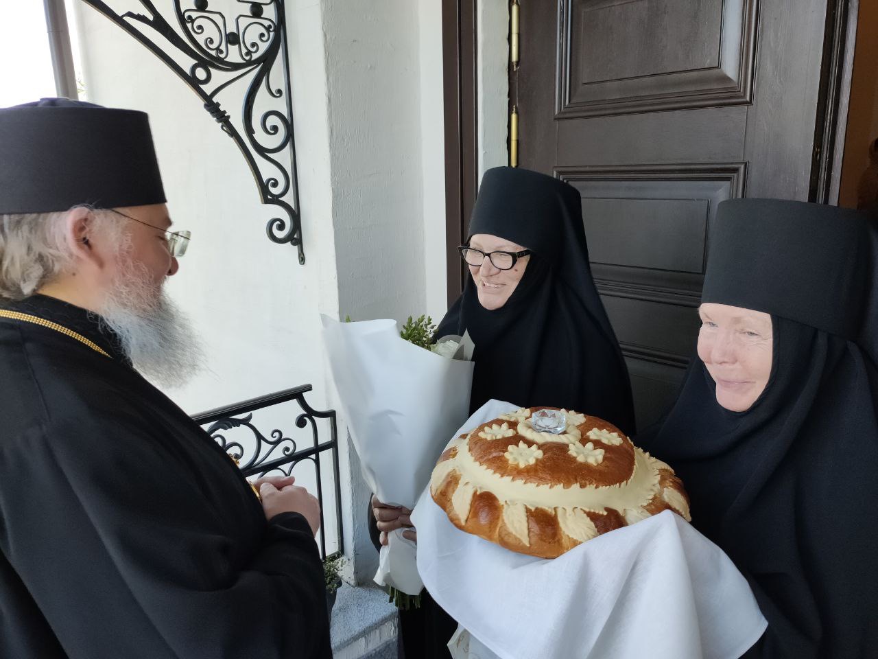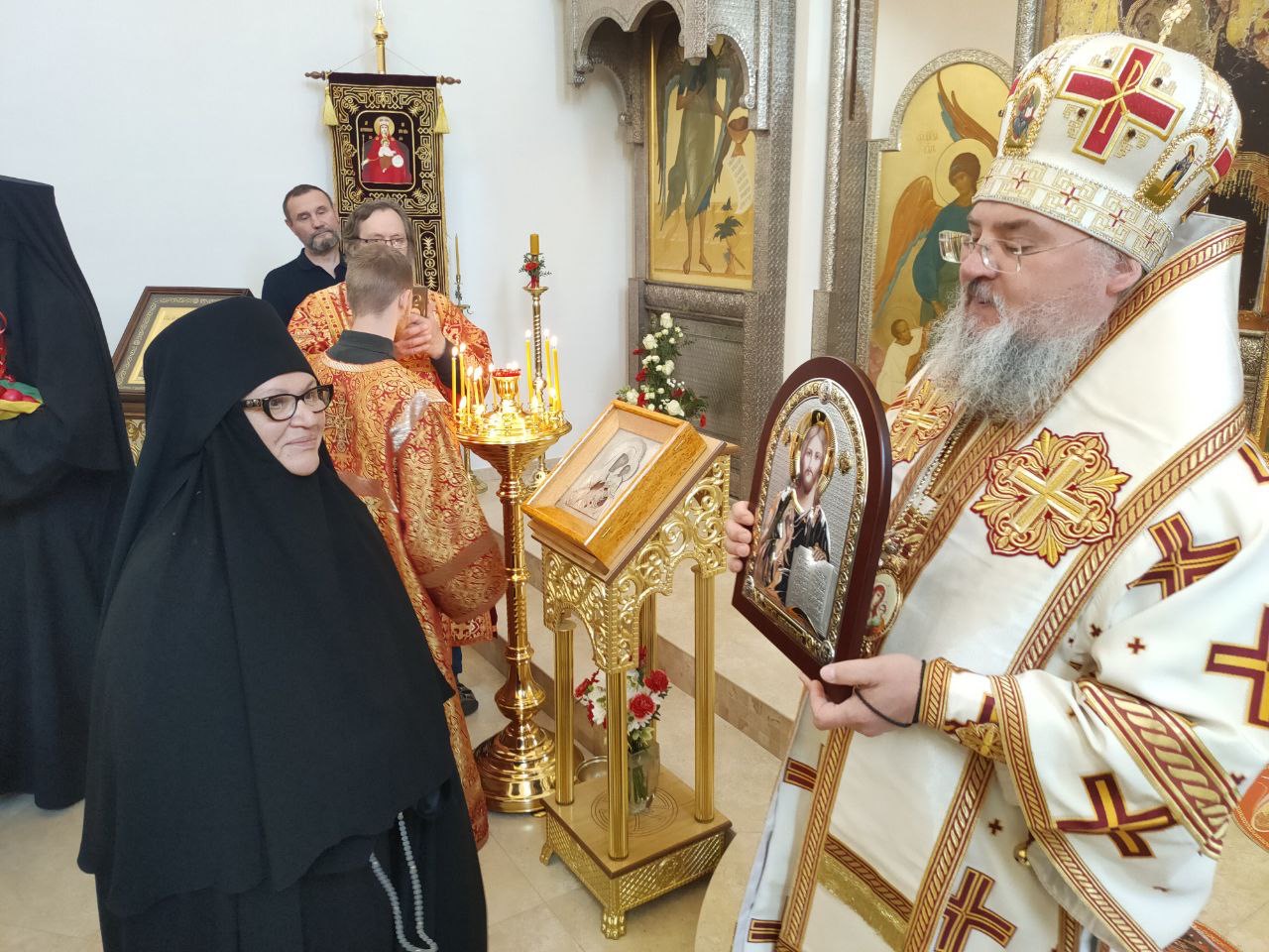 В завершении богослужения владыка поздравил всех участников богослужения с праздником святых Жен Мироносиц, а старшую сестру обители монахиню Иоанну (Павлову) с днем тезоименитства и преподнес ей святую просфору и икону Спасителя.