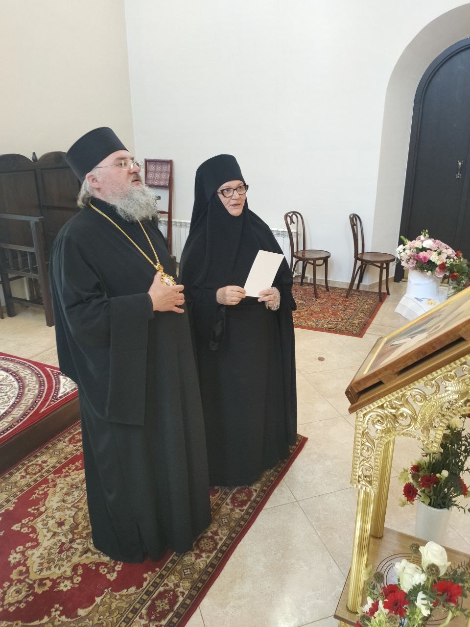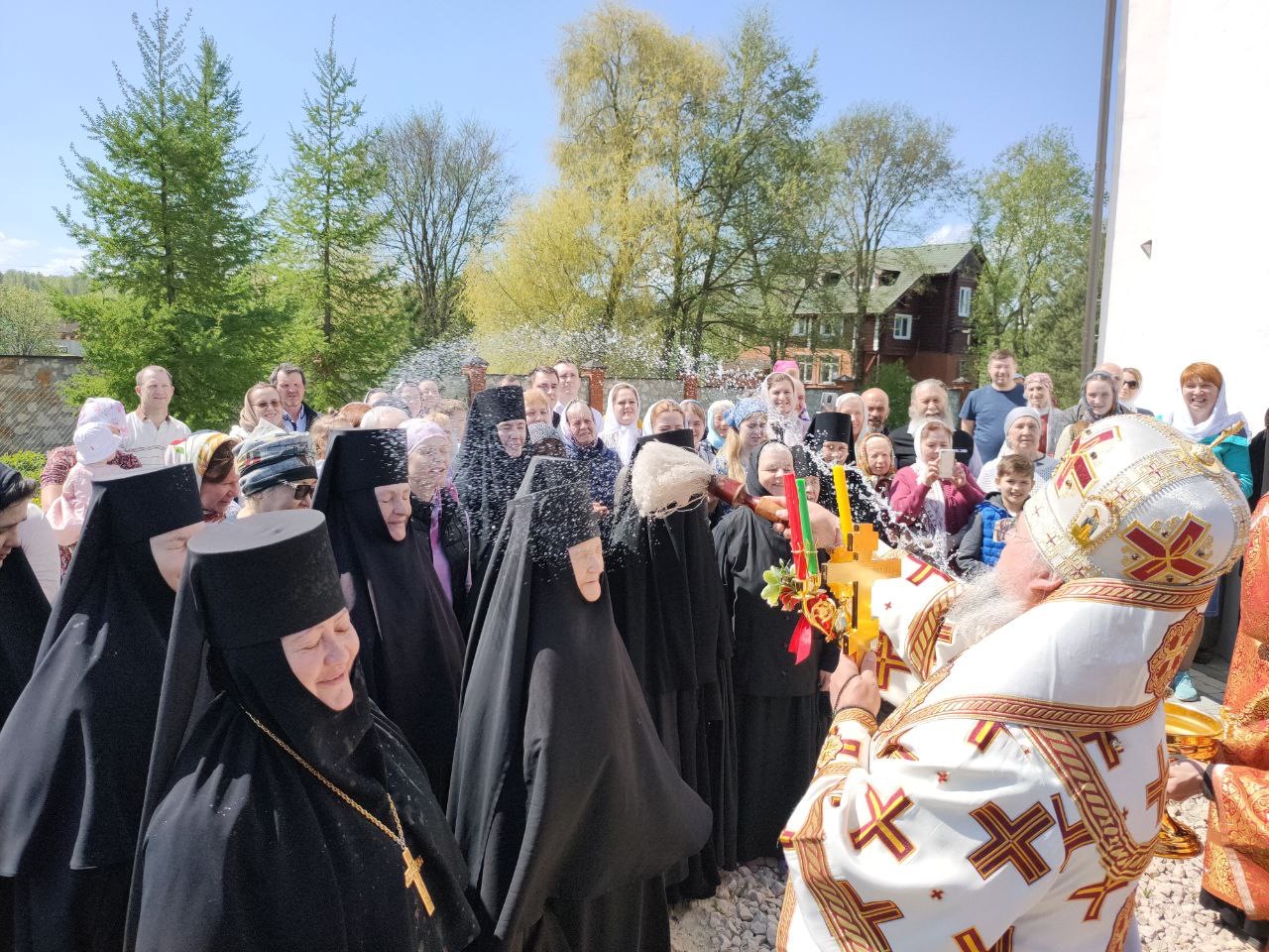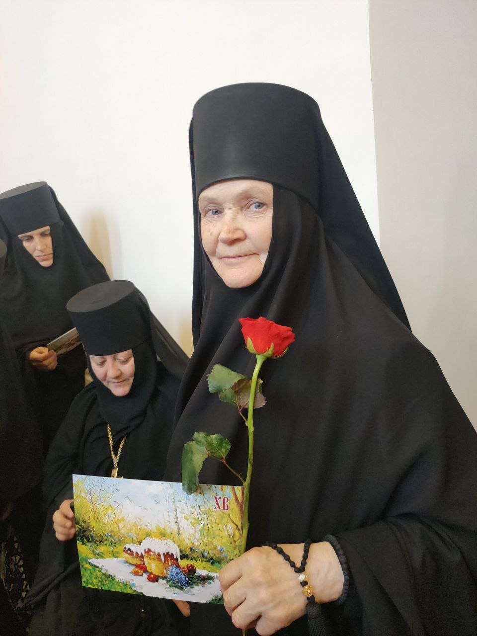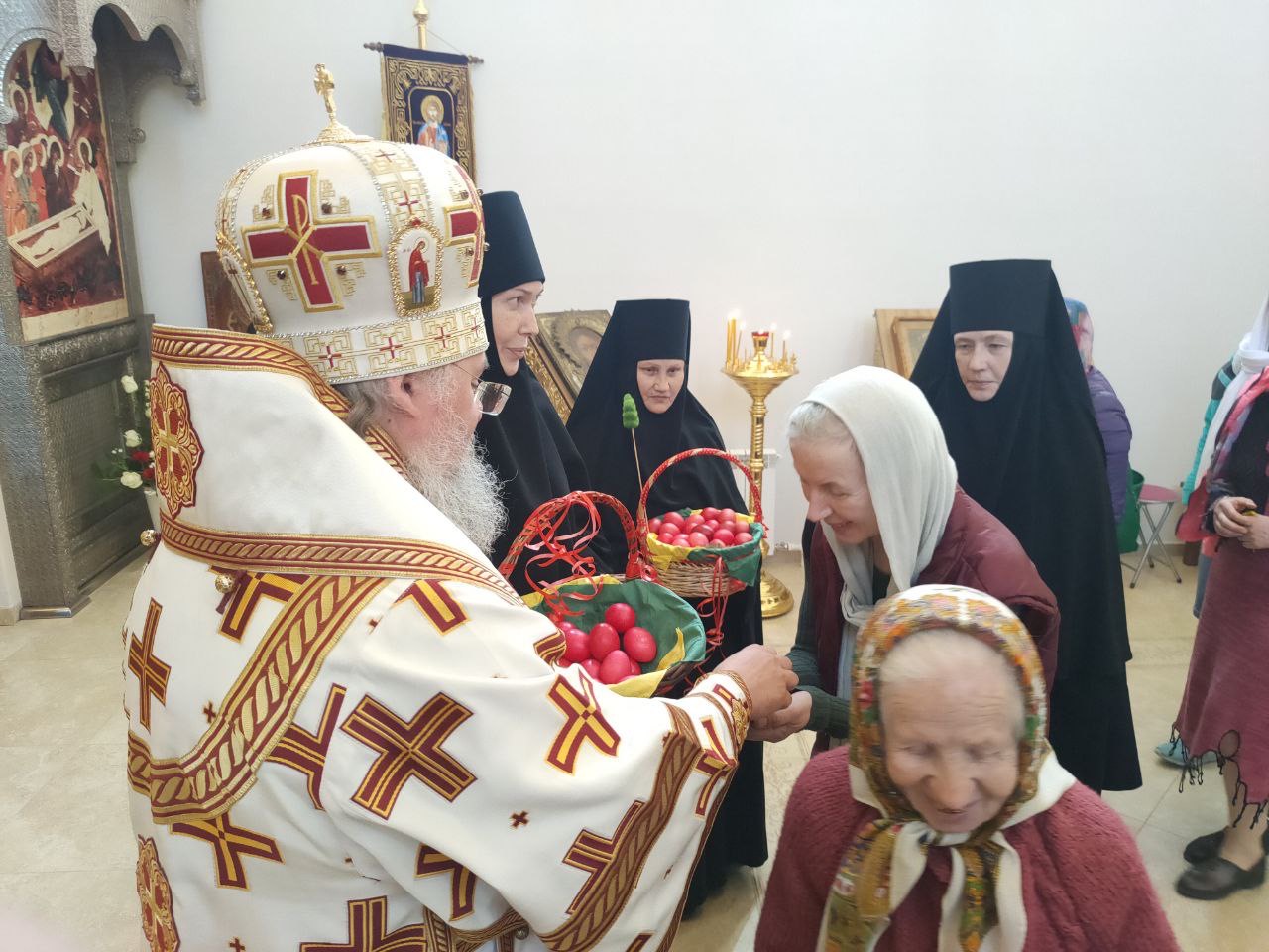 В завершении богослужения владыка поздравил всех участников богослужения с праздником святых Жен Мироносиц, а старшую сестру обители монахиню Иоанну (Павлову) с днем тезоименитства и преподнес ей святую просфору и икону Спасителя.