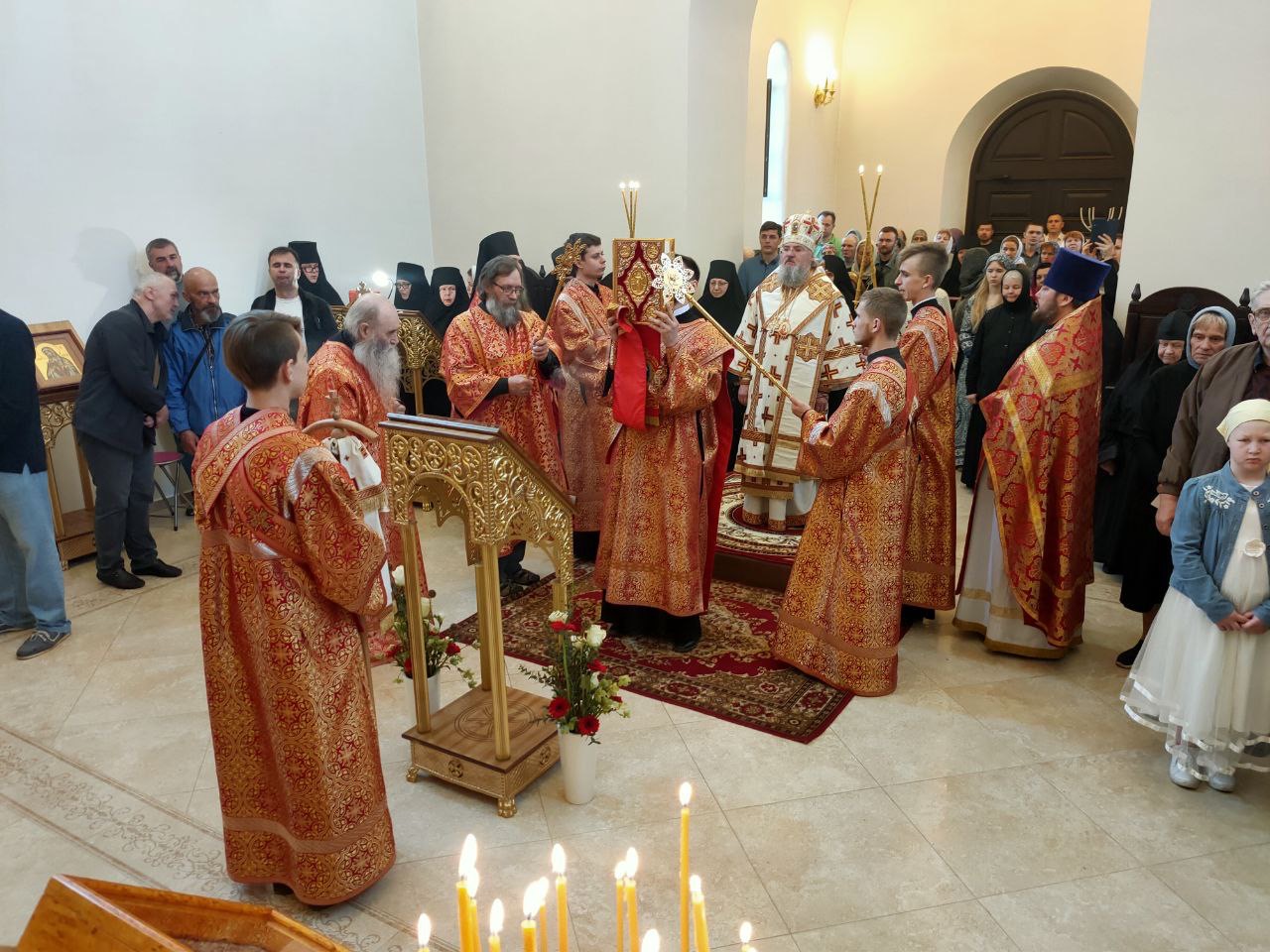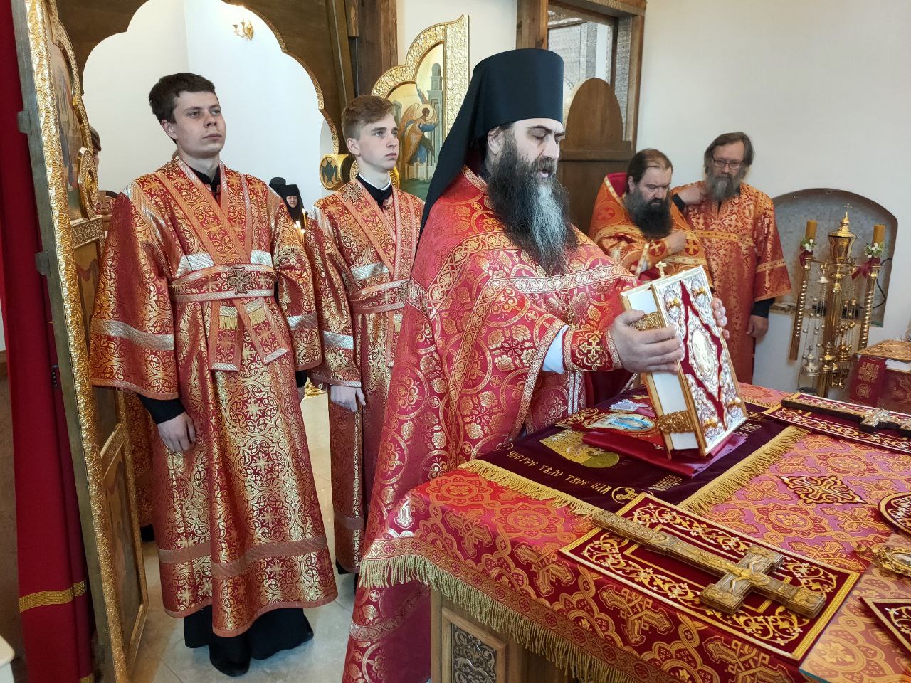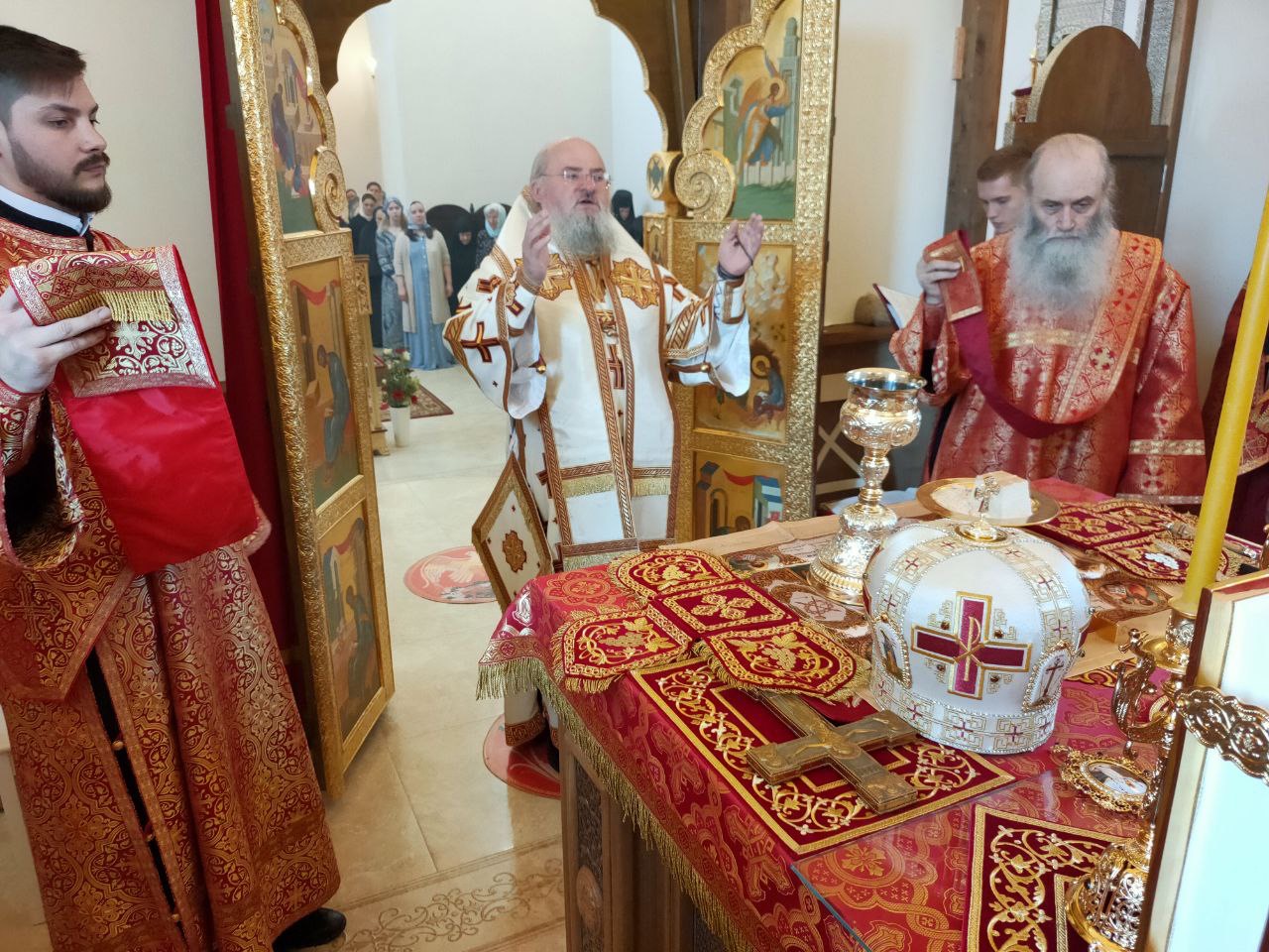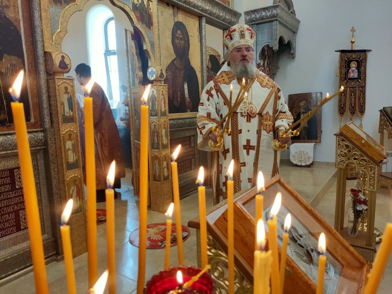 Архипастырю сослужили: игумен Михаил (Семенов) – наместник монастыря Спаса Нерукотворного пустынь, протоиерей Антоний Хатунцев, иеромонах Игнатий (Киселев), диакон Евгений Васильев и иеродиакон Виталий (Павленко).