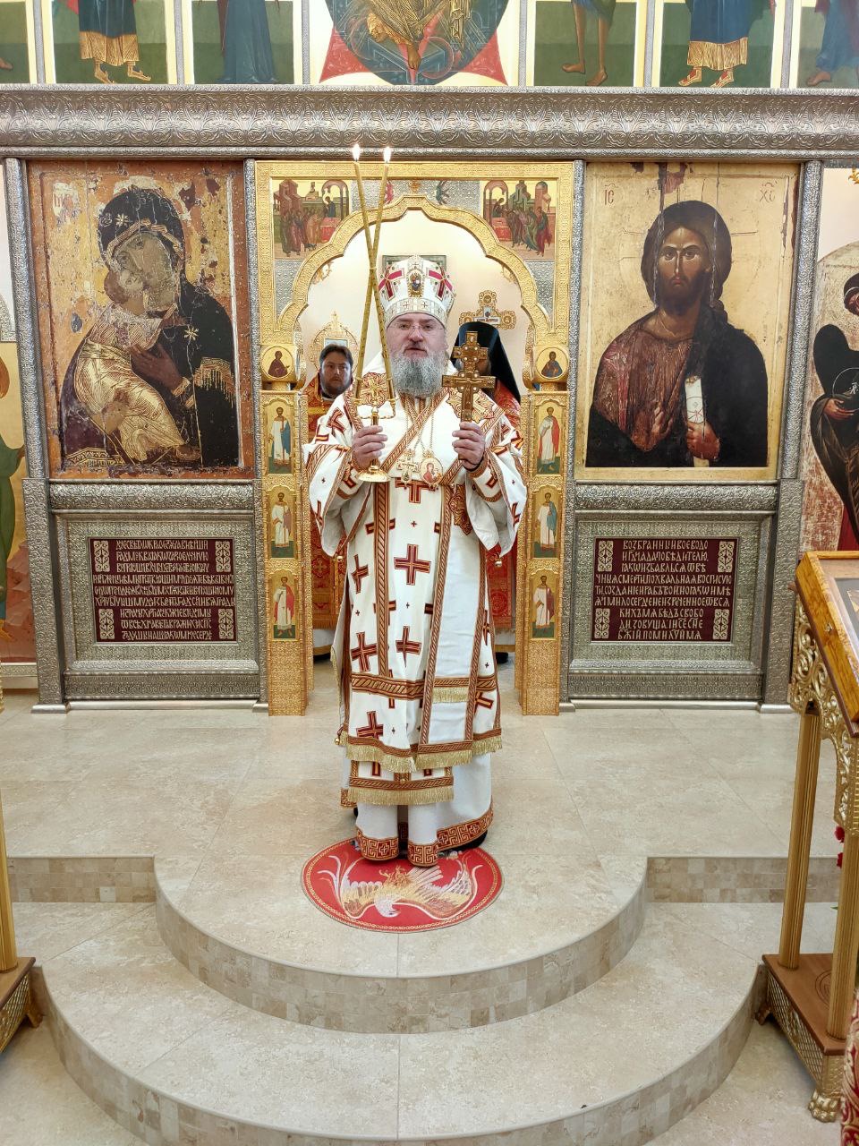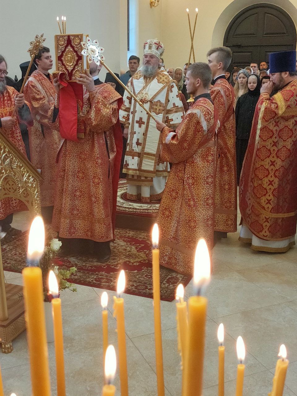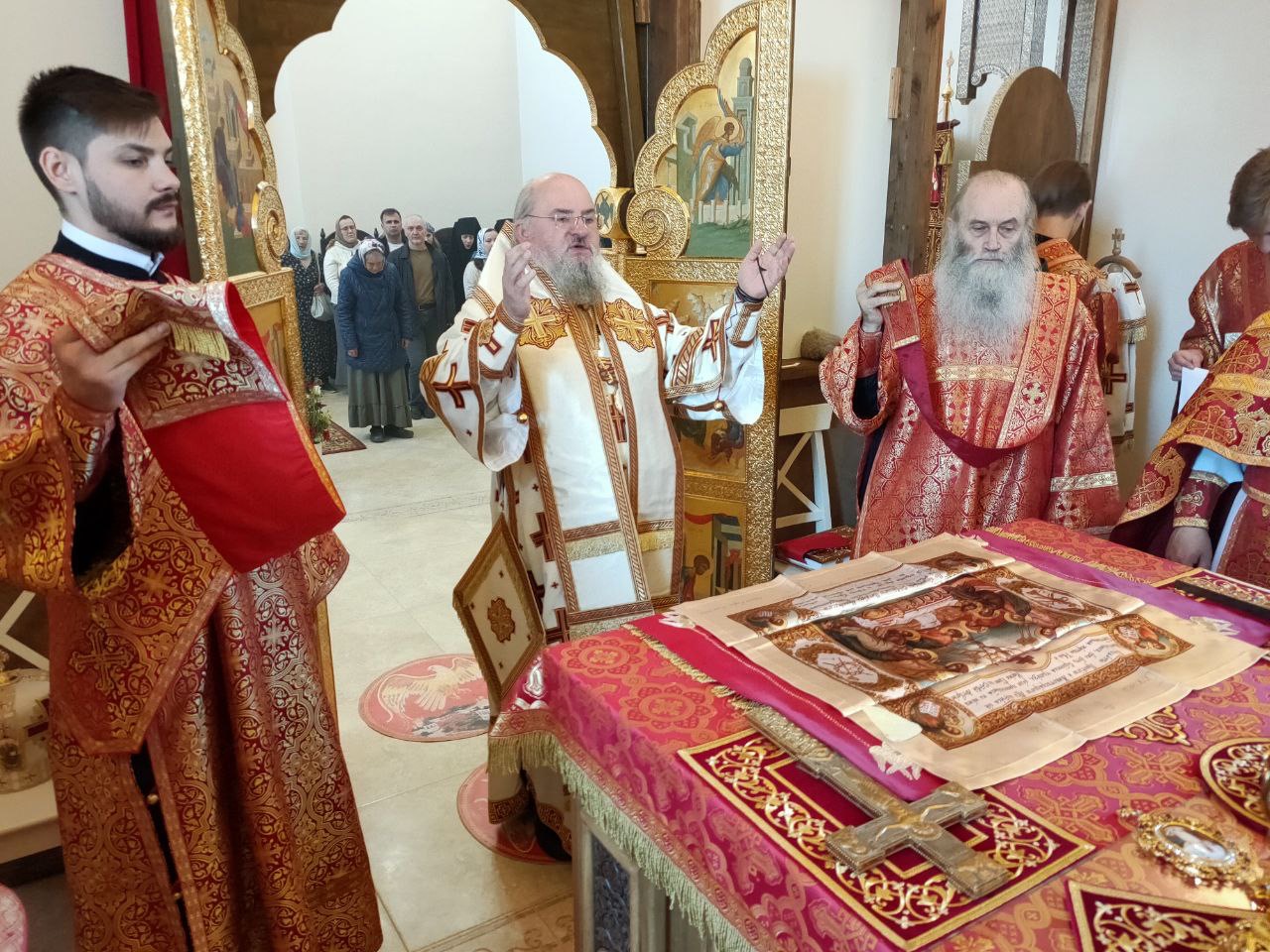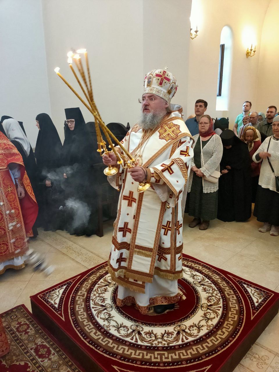 Архипастырю сослужили: игумен Михаил (Семенов) – наместник монастыря Спаса Нерукотворного пустынь, протоиерей Антоний Хатунцев, иеромонах Игнатий (Киселев), диакон Евгений Васильев и иеродиакон Виталий (Павленко).