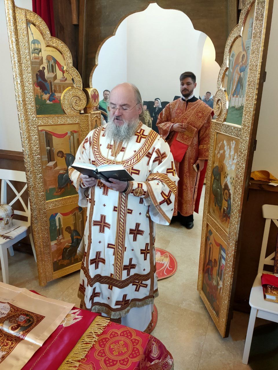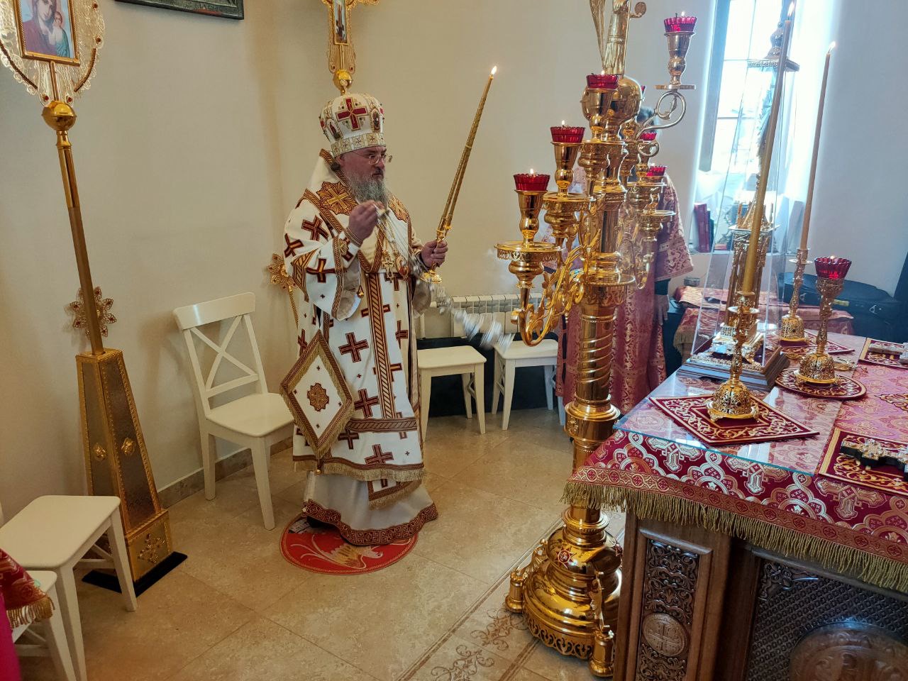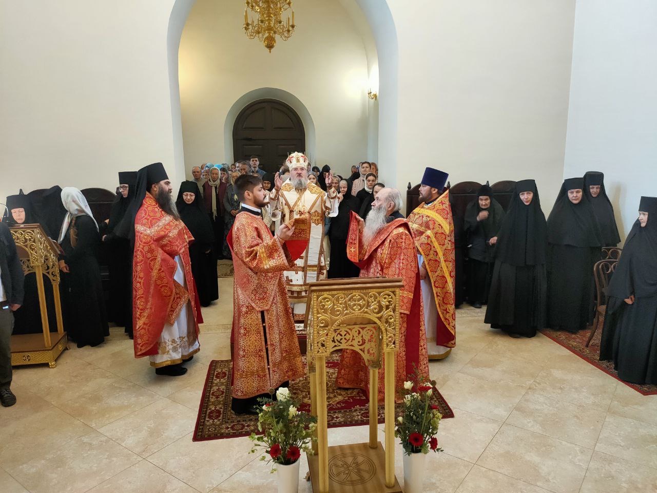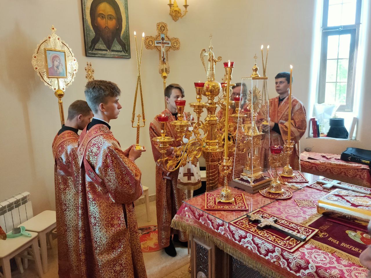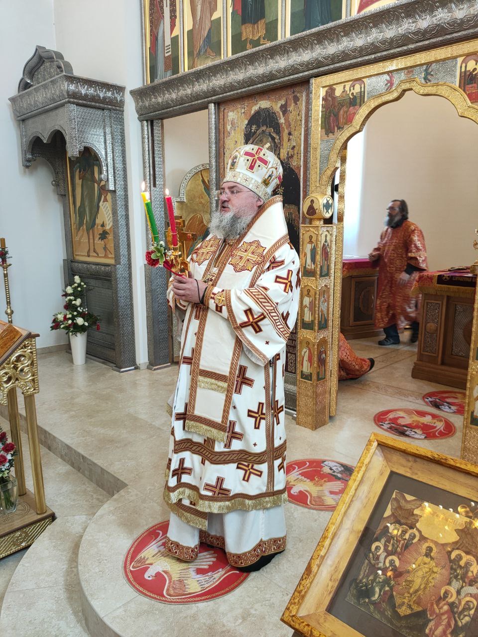 Архипастырю сослужили: игумен Михаил (Семенов) – наместник монастыря Спаса Нерукотворного пустынь, протоиерей Антоний Хатунцев, иеромонах Игнатий (Киселев), диакон Евгений Васильев и иеродиакон Виталий (Павленко).