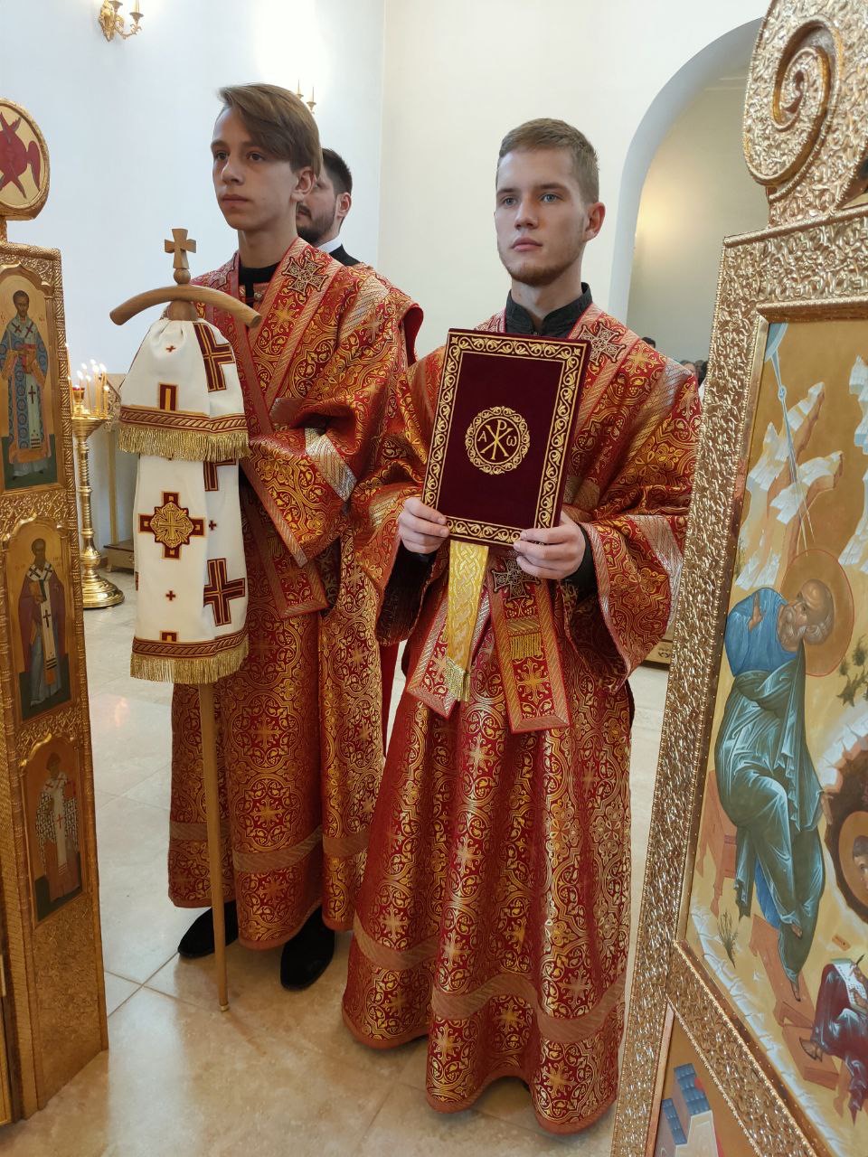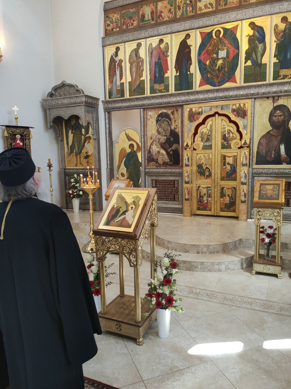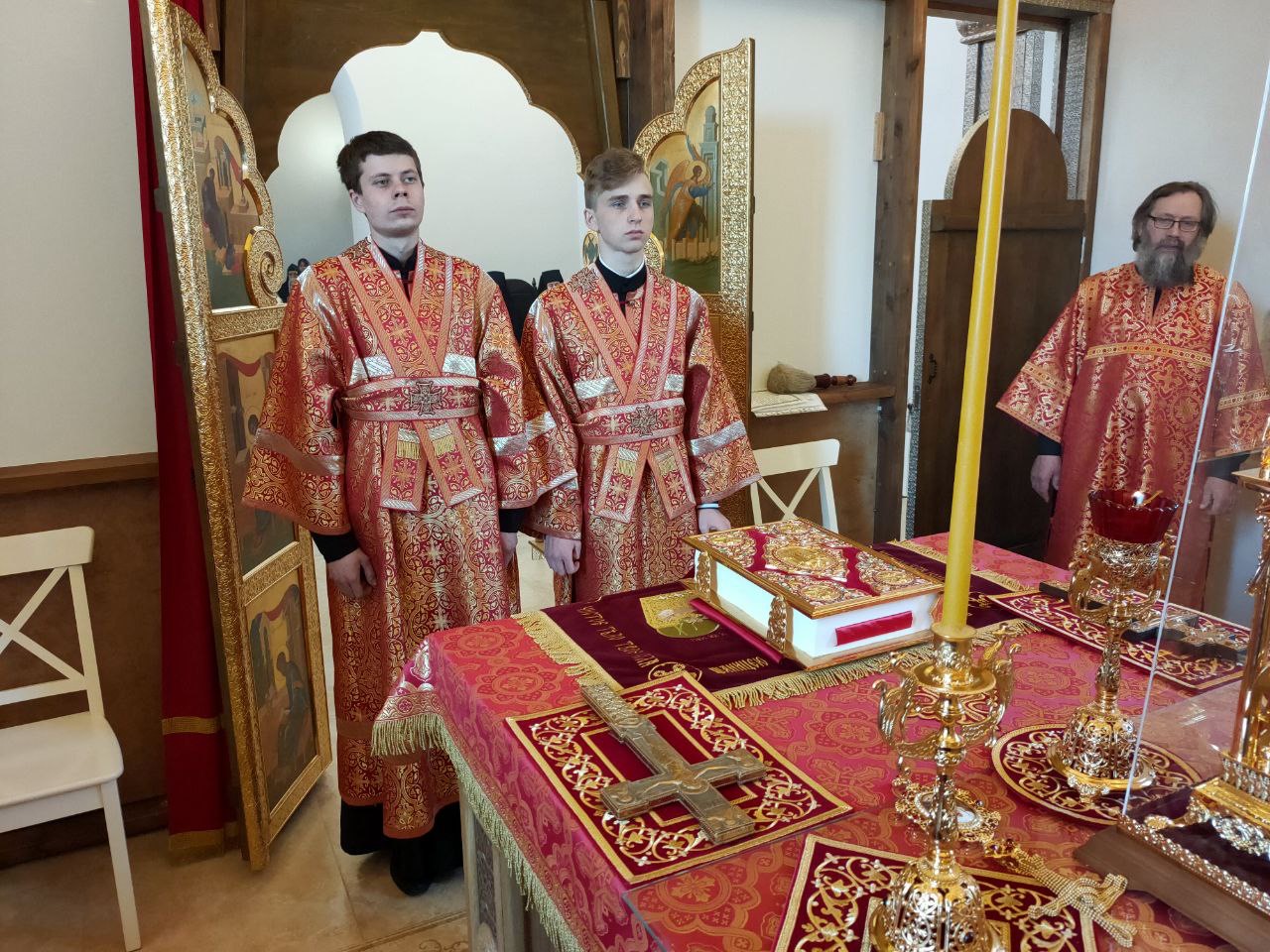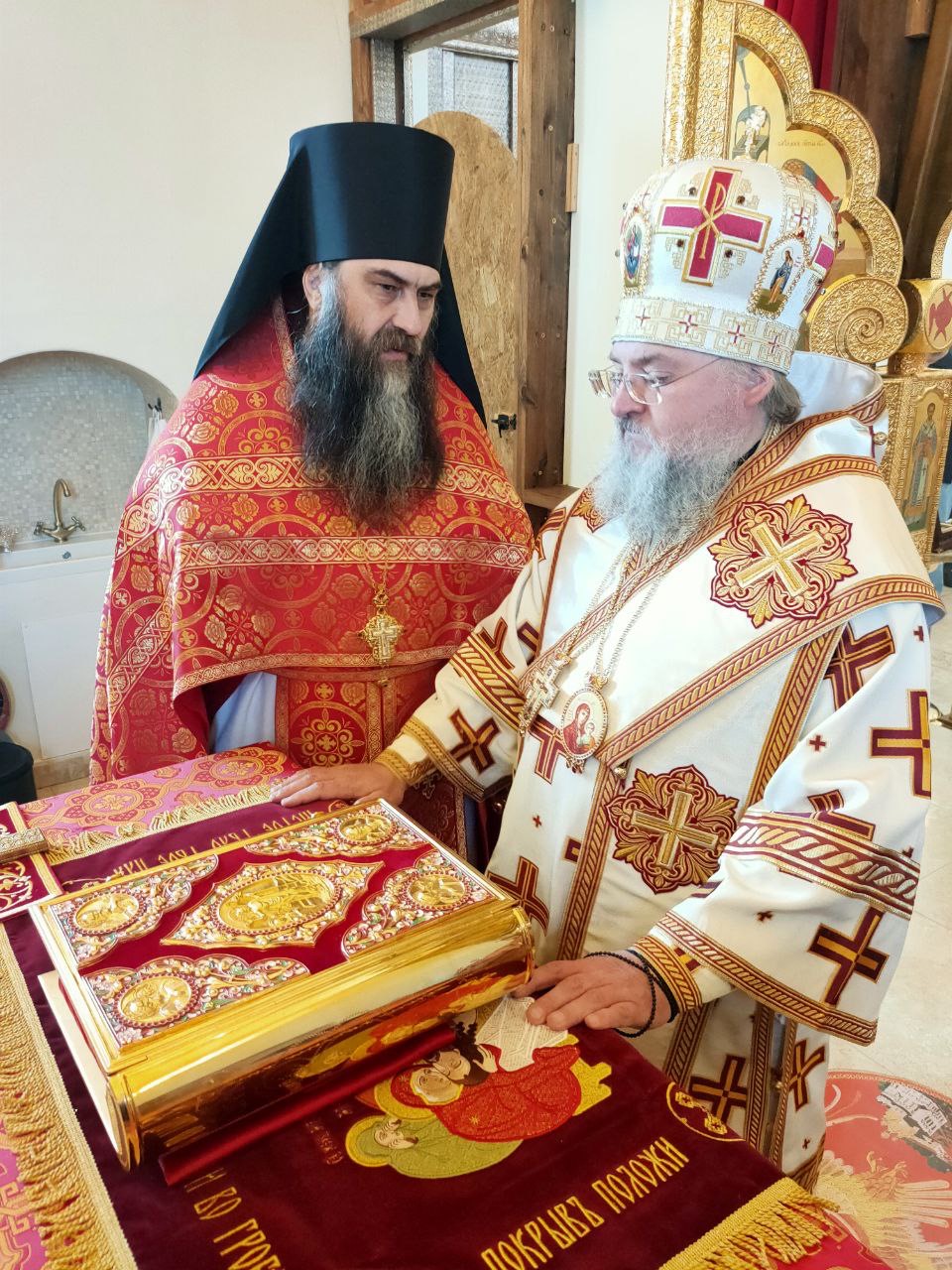 Архипастырю сослужили: игумен Михаил (Семенов) – наместник монастыря Спаса Нерукотворного пустынь, протоиерей Антоний Хатунцев, иеромонах Игнатий (Киселев), диакон Евгений Васильев и иеродиакон Виталий (Павленко).