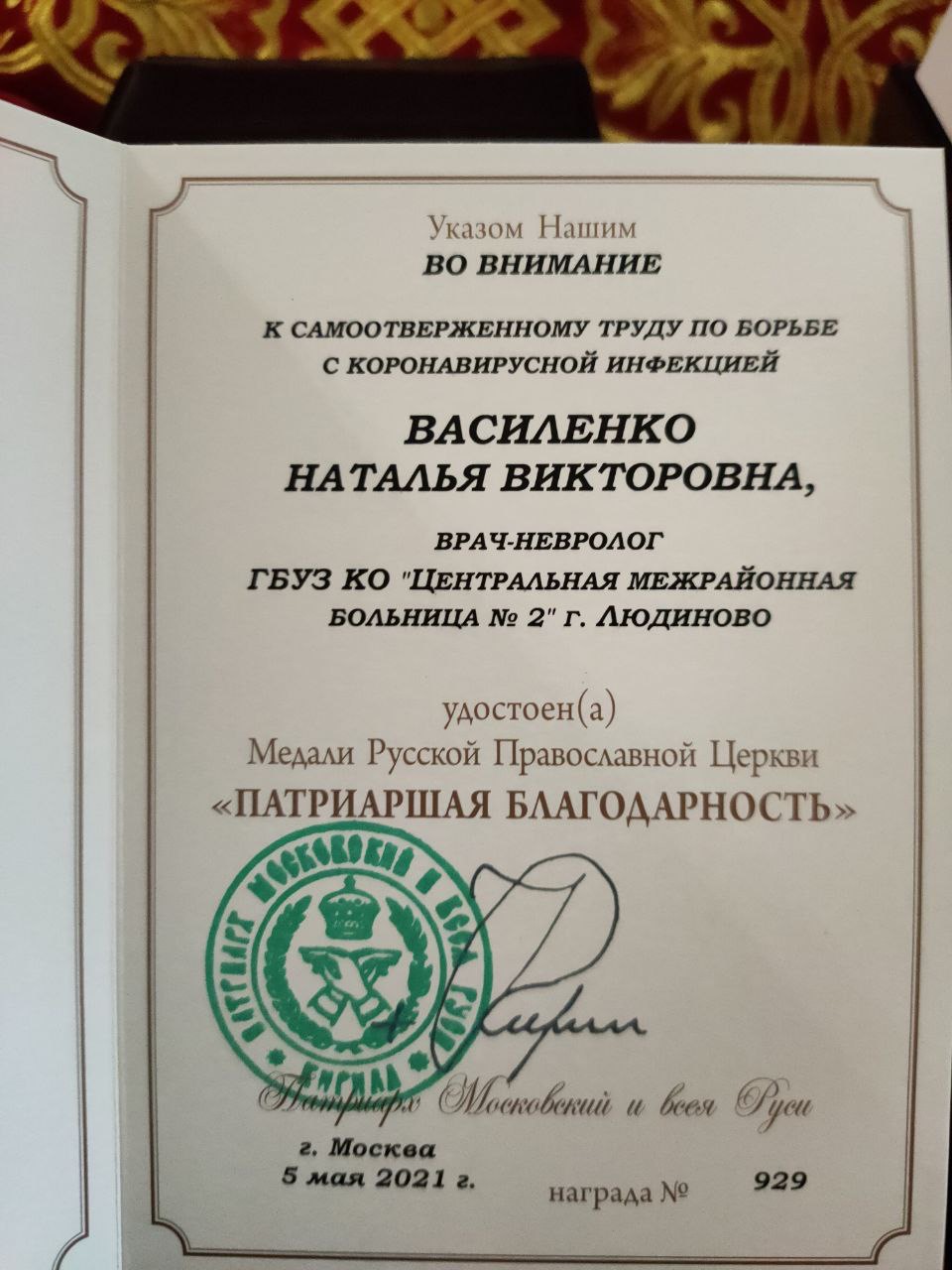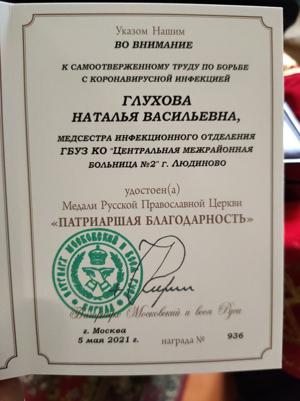 27 мая, после Божественной литургии в Казанском соборе города Людиново, епископ Козельский и Людиновский Никита вручил медали Русской Православной Церкви «Патриаршая Благодарность» медицинским работникам потрудившимся в борьбе с коронавирусной инфекцией.