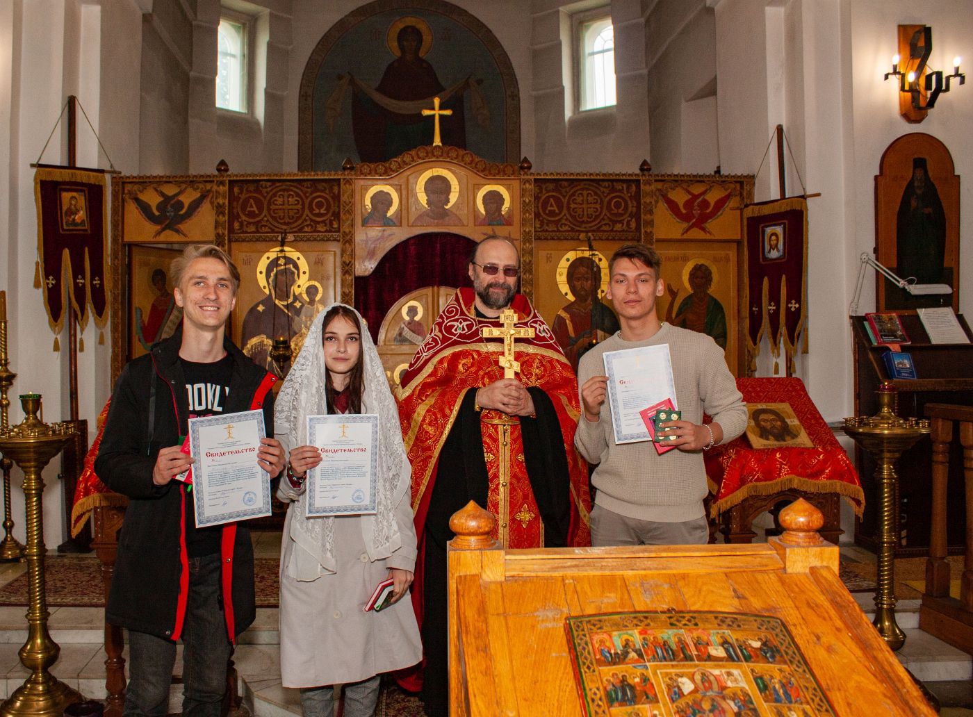 В этом году в воскресной школе 3 выпускника: Николаев Николай, Мыхлик Ангелина и Хохлов Денис. Протоиерей Константин каждому вручил свидетельство об окончании школы и книги.