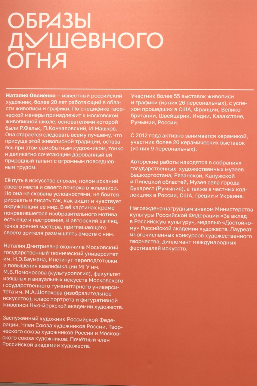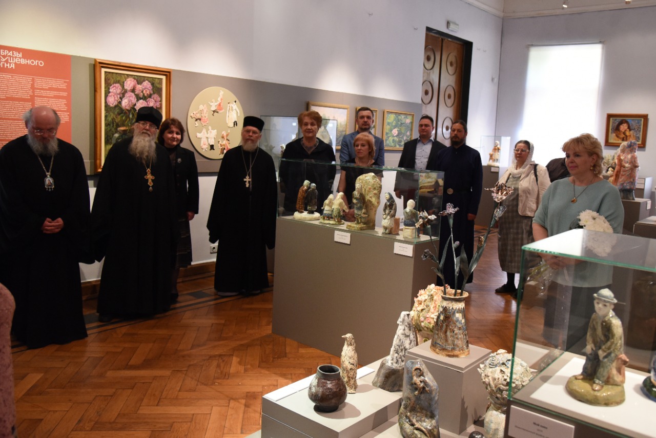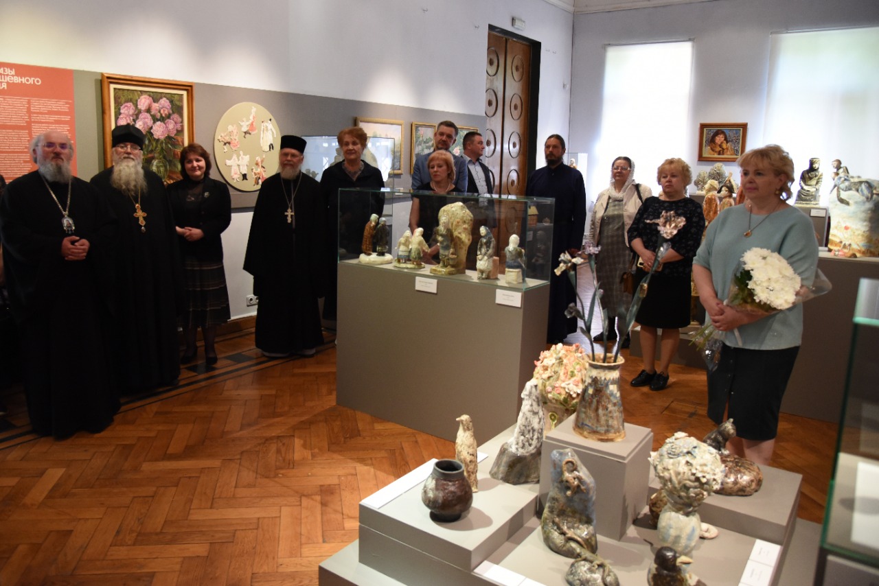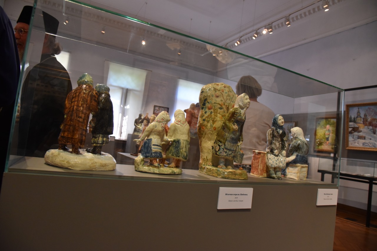 На выставке значительная часть работ посвящена святым людям, меценатам, вере в Бога. И такая искренняя вера в Спасителя, безусловно, не осталась бесплодной. Как из рога изобилия на автора снисходит вдохновение, рождённые в сердце образы воплощаются в глине. Очевидно, что Наталия Дмитриевна Овсиенко очень любит Божий мир, видит и чувствует красоту всего, что создано Творцом. Стремится подарить увиденное ею людям. Художественный талант позволяет Наталии Дмитриевне увидеть необычное в обычном. Запечатлённые ею образы этого мира в разных художественных произведениях порой просты, но за этой простотой скрывается подлинное мастерство художника: выразительная одухотворенность, глубина мысли, доброта души, внутренний свет. Отпечаток света и доброты на всех буквально произведениях Наталии Дмитриевны Овсиенко. Очень трогательно, со знанием дела, повествование художника дополнил её супруг Николай Павлович. Весьма мужественный, неравнодушный человек, горящий духом. Образы душевного огня – это, наверное, и про него в том числе…