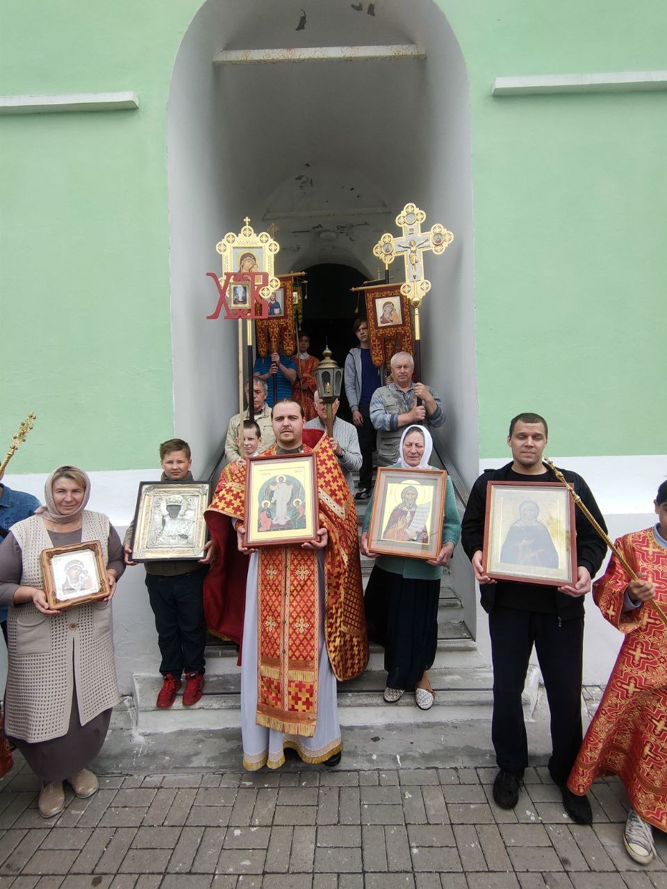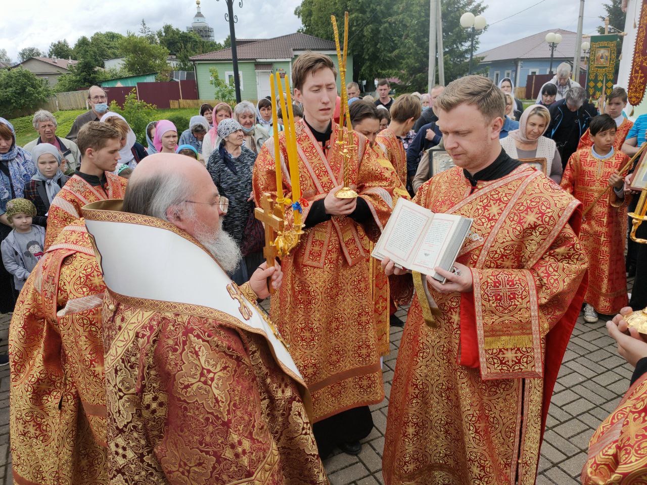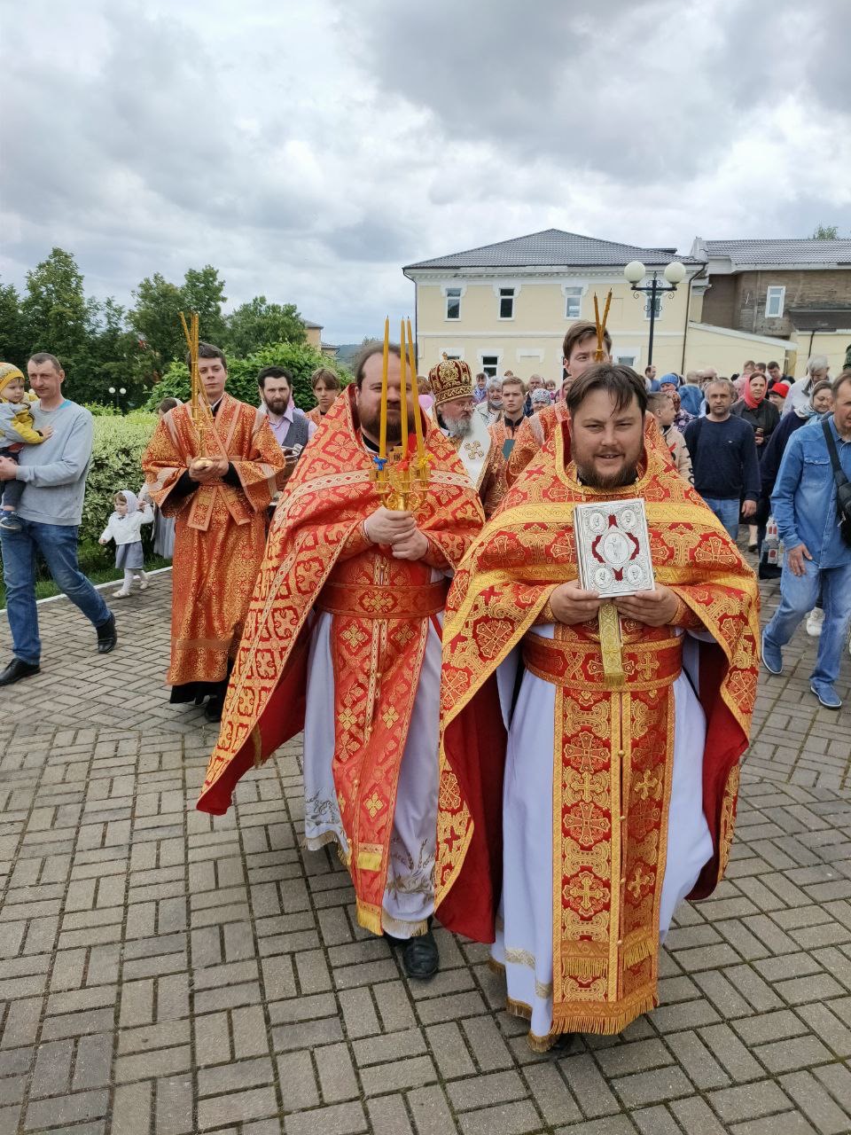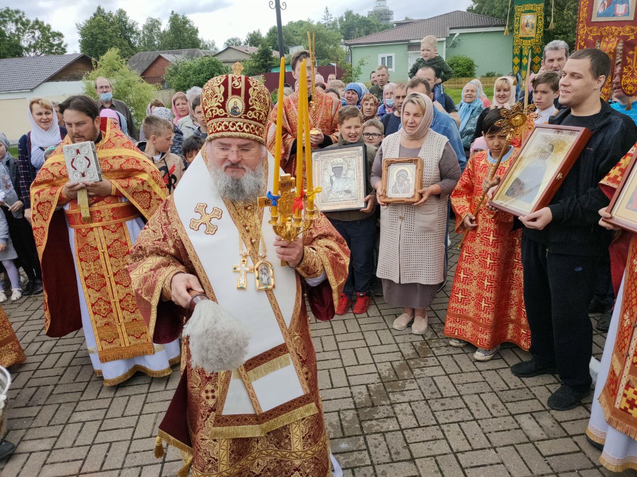 По отпусте литургии священнослужители совершили крестный ход вокруг храма, завершая который, вознеся молитву святой блаженной Ксении, владыка обратился к богомольцам с архипастырским словом.