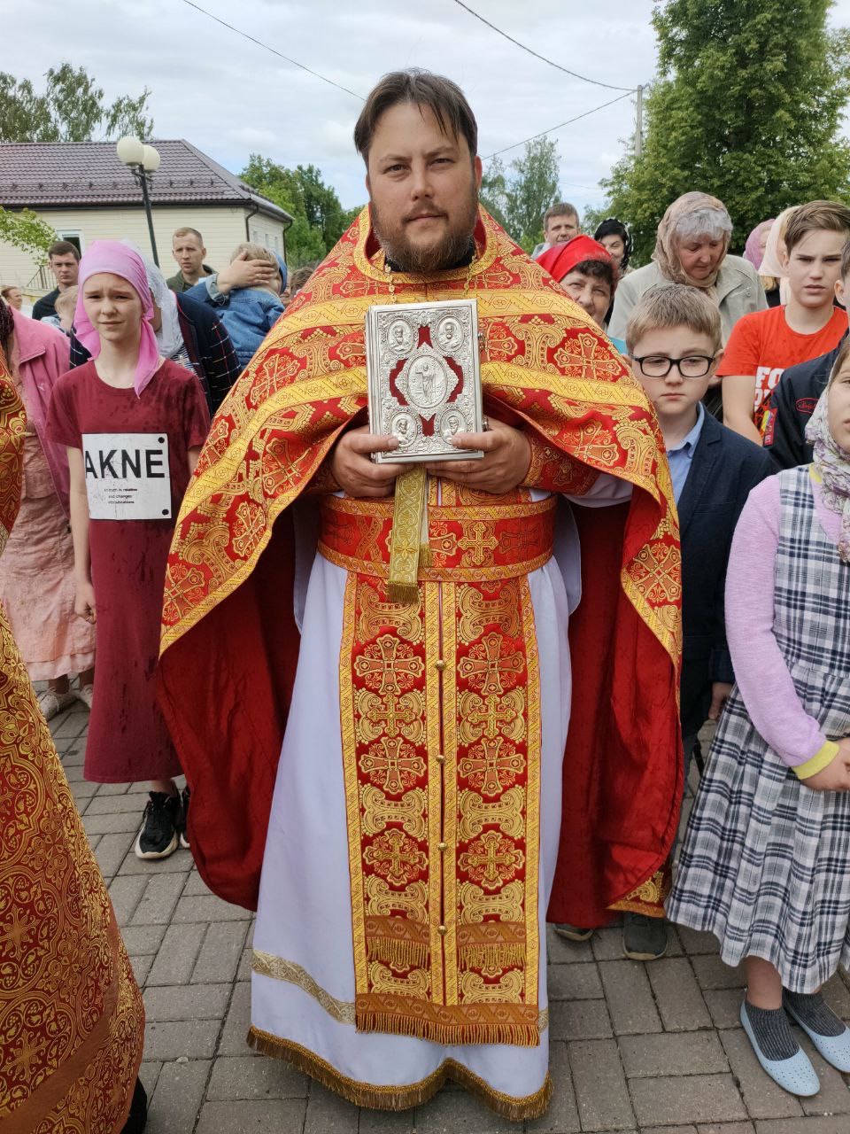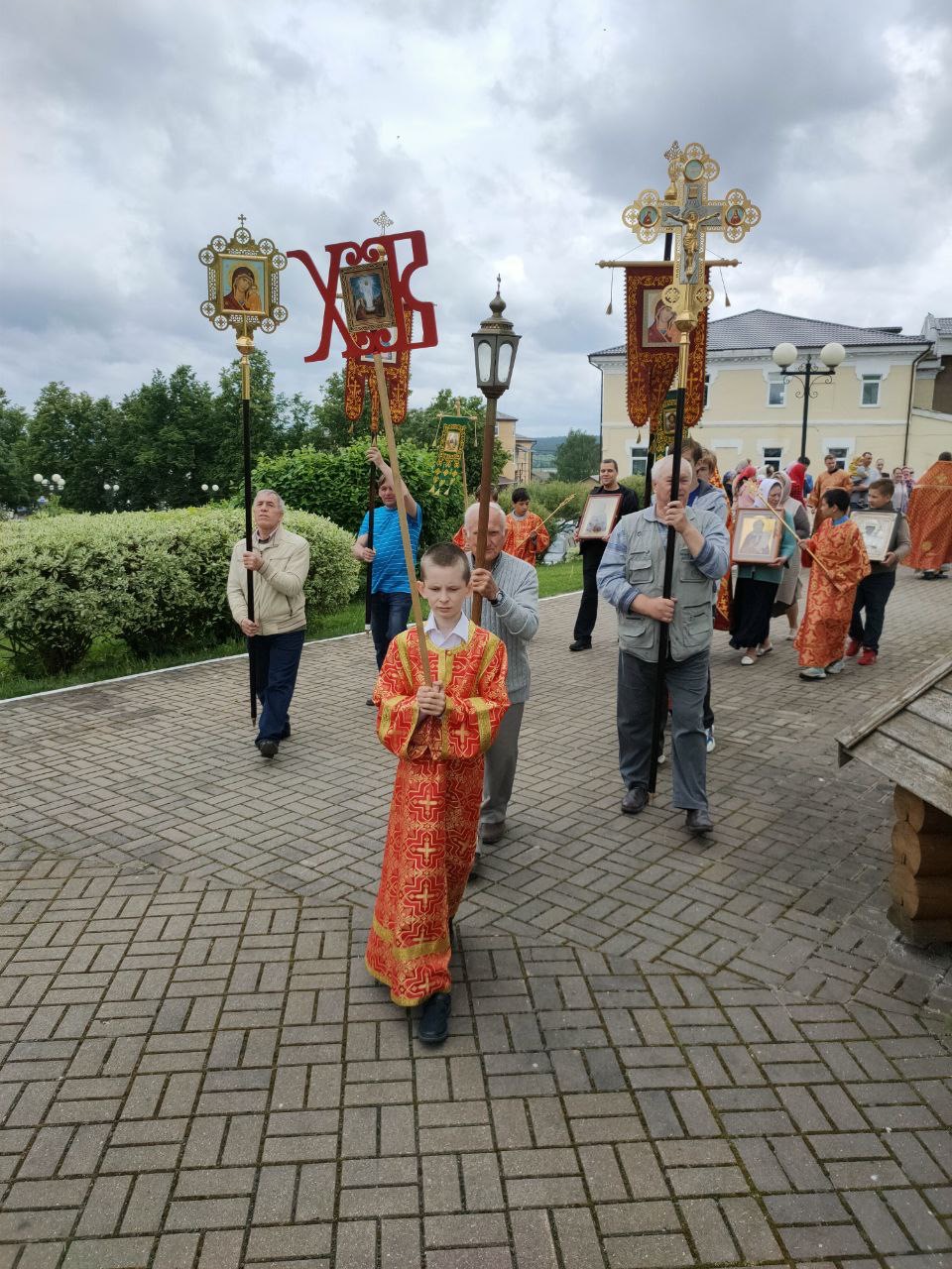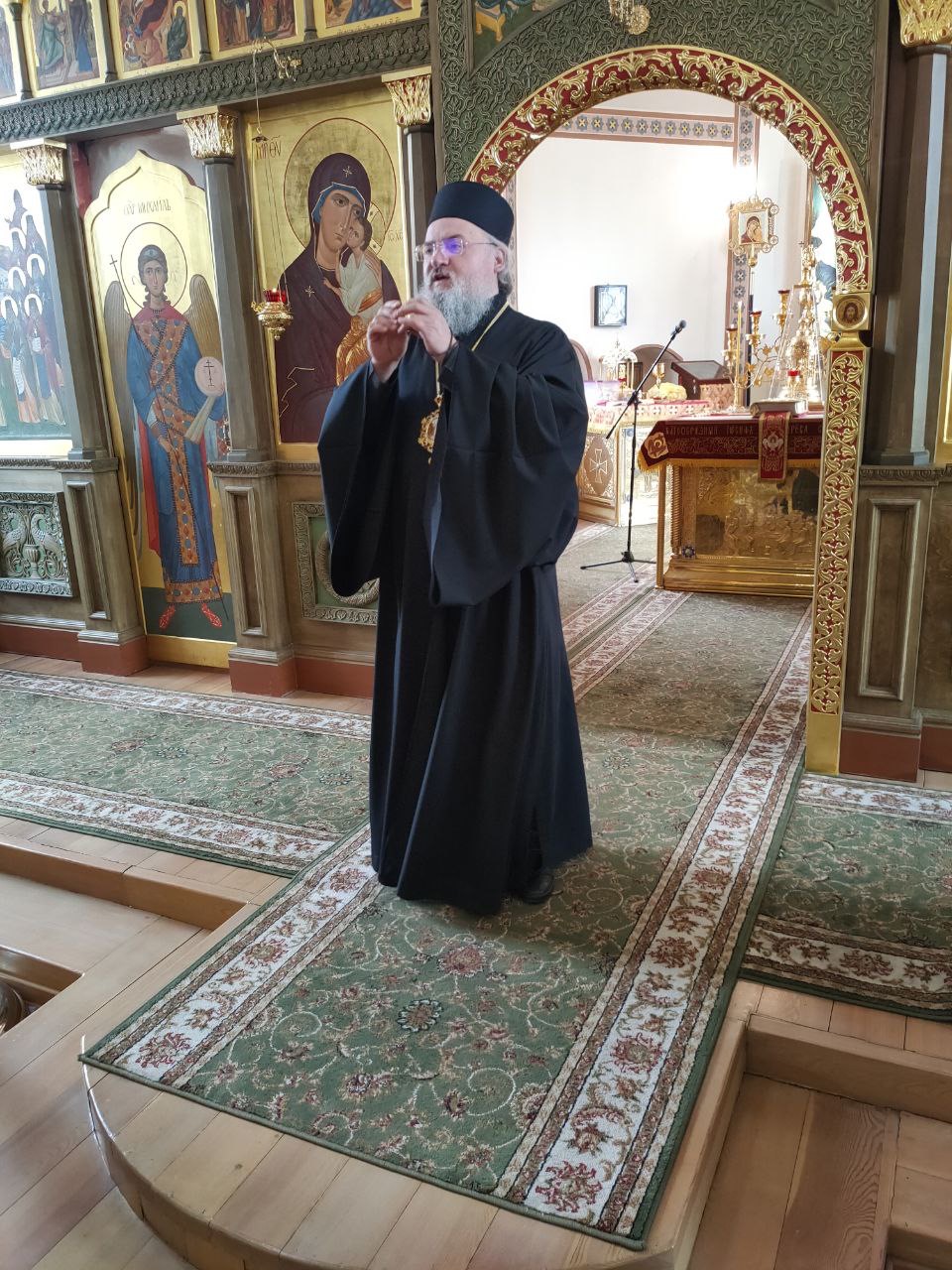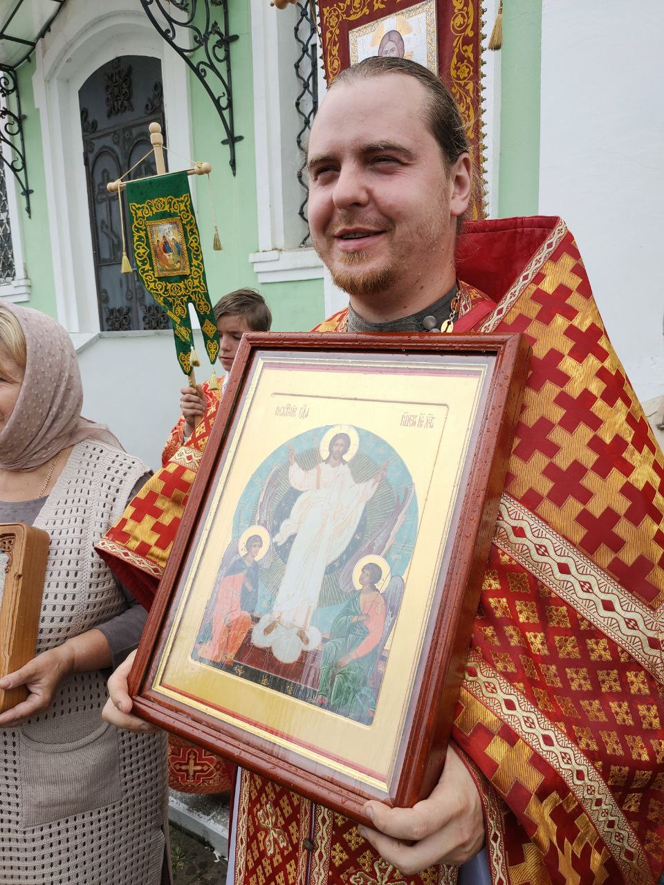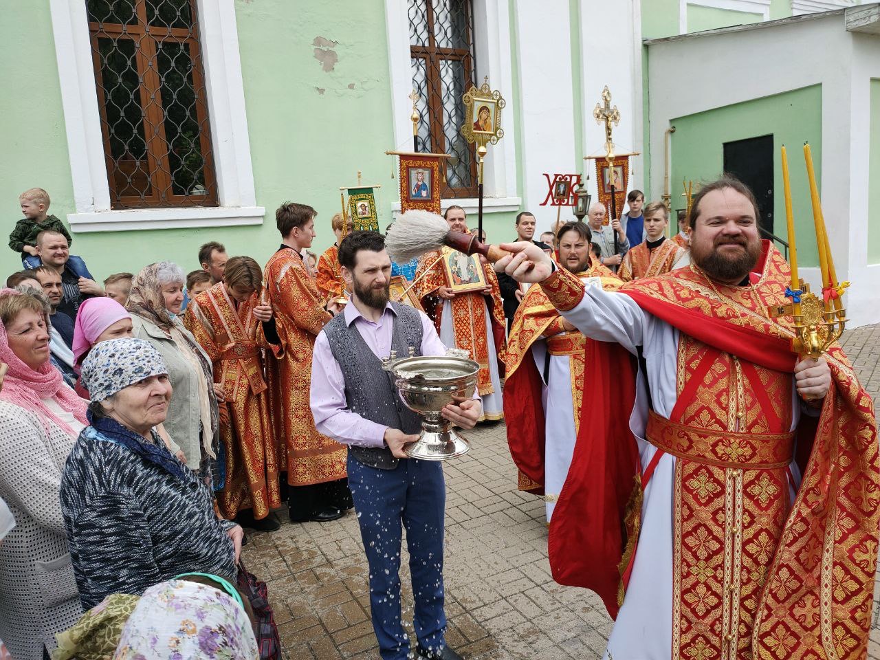 По отпусте литургии священнослужители совершили крестный ход вокруг храма, завершая который, вознеся молитву святой блаженной Ксении, владыка обратился к богомольцам с архипастырским словом.