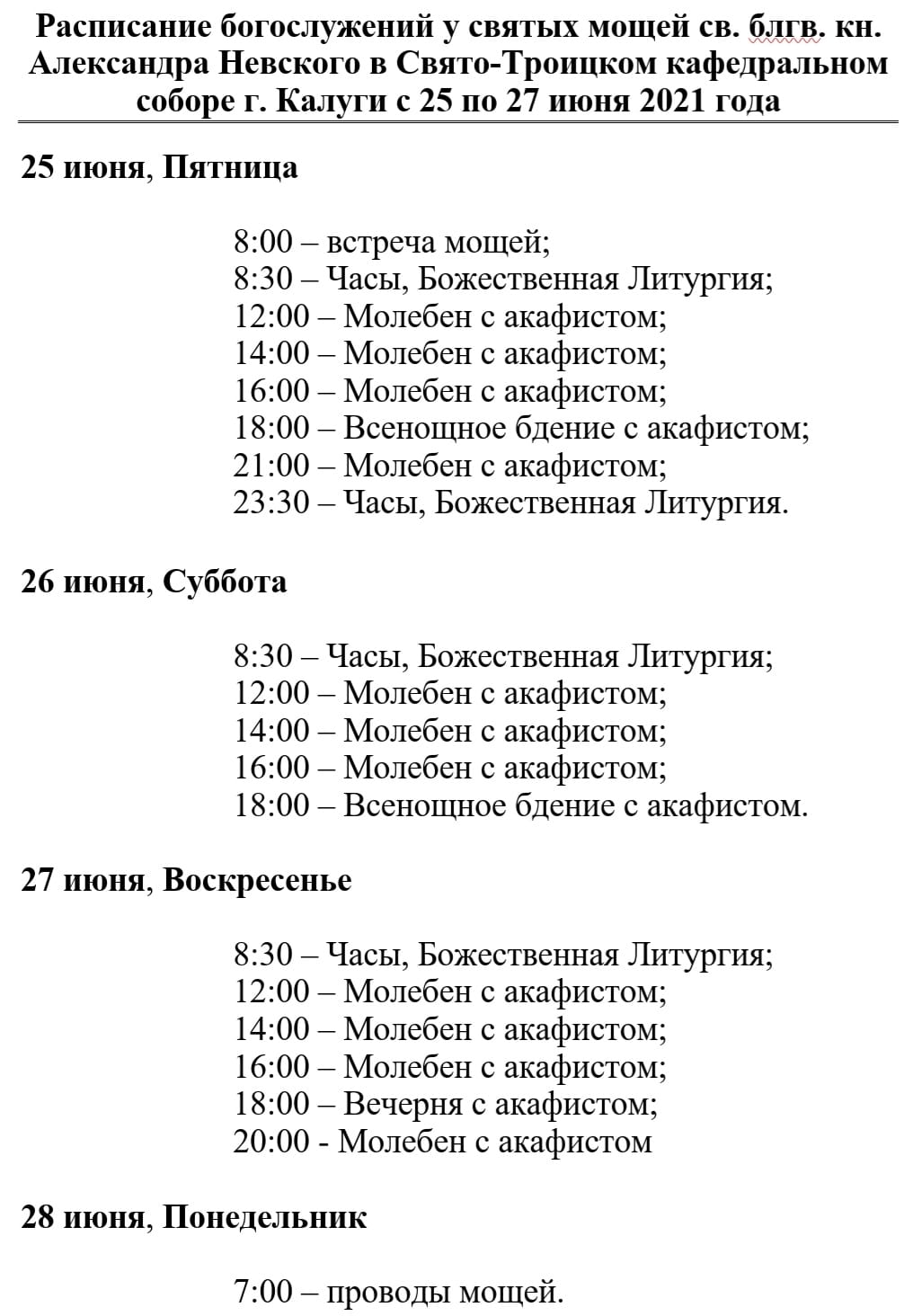 С 25 по 27 июня сего года в Троицком соборе города Калуги будут пребывать мощи святого благоверного великого князя Александра Невского.